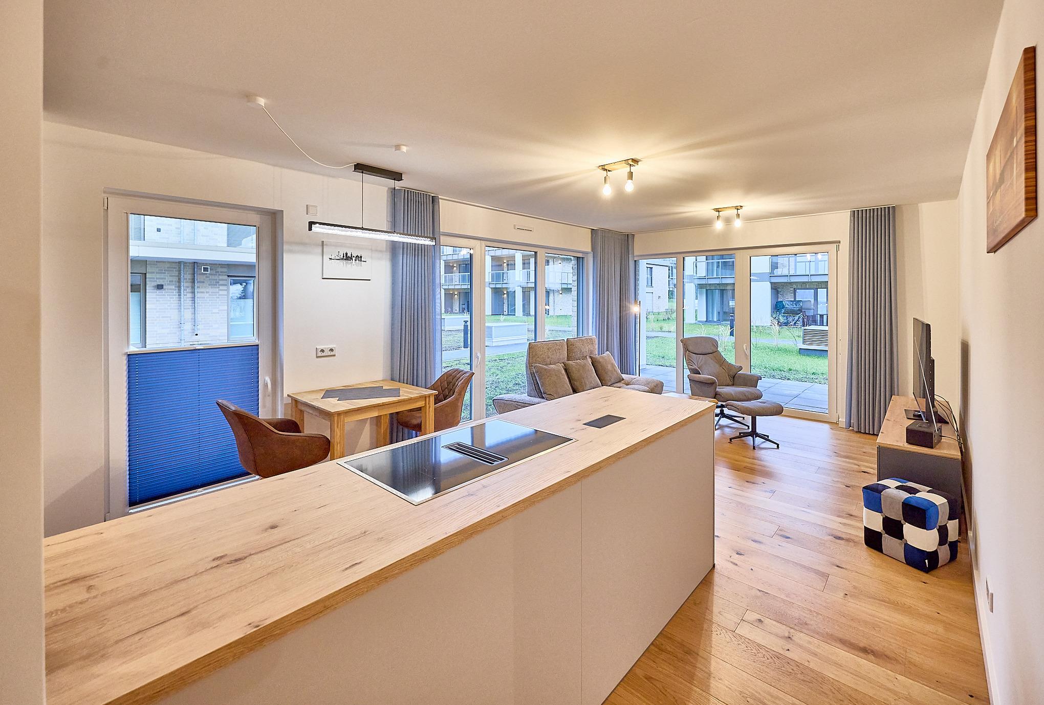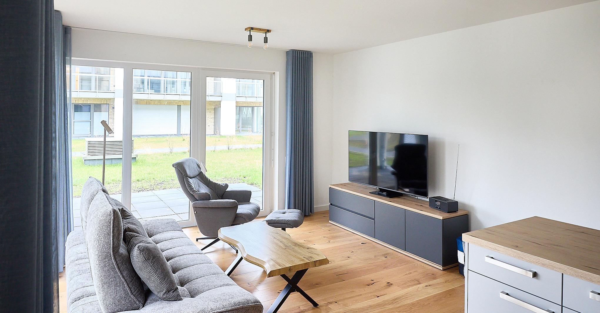 Barrierefreie 64?m² Erdgeschosswohnung in Top-Lage Duhner Spitze, nur wenige Meter zum Strand. Für 2 Personen, Terrasse mit seitlichem Meerblick, teilüberdacht. Tiefgarage (breiter Stellplatz), Fahrstuhl, Fahrradraum mit E-Bike-Ladestation. Schlafzimmer mit Doppelbett, TV [&] Schreibtisch. Wohnbereich mit Sofa, Sessel [&] Smart-TV. Moderne Küche mit Ceranfeld, Backofen, Kühlschrank, Pad- [&] Filterkaffeemaschine. Bad mit bodengleicher Dusche. WLAN, Bettwäsche [&] Handtücher (ab 3 J.) inkl. 6x freier Eintritt ins Thalasso ahoi! Erlebnisbad [&] Sauna. Strandnah, komfortabel, ideal für Paare.