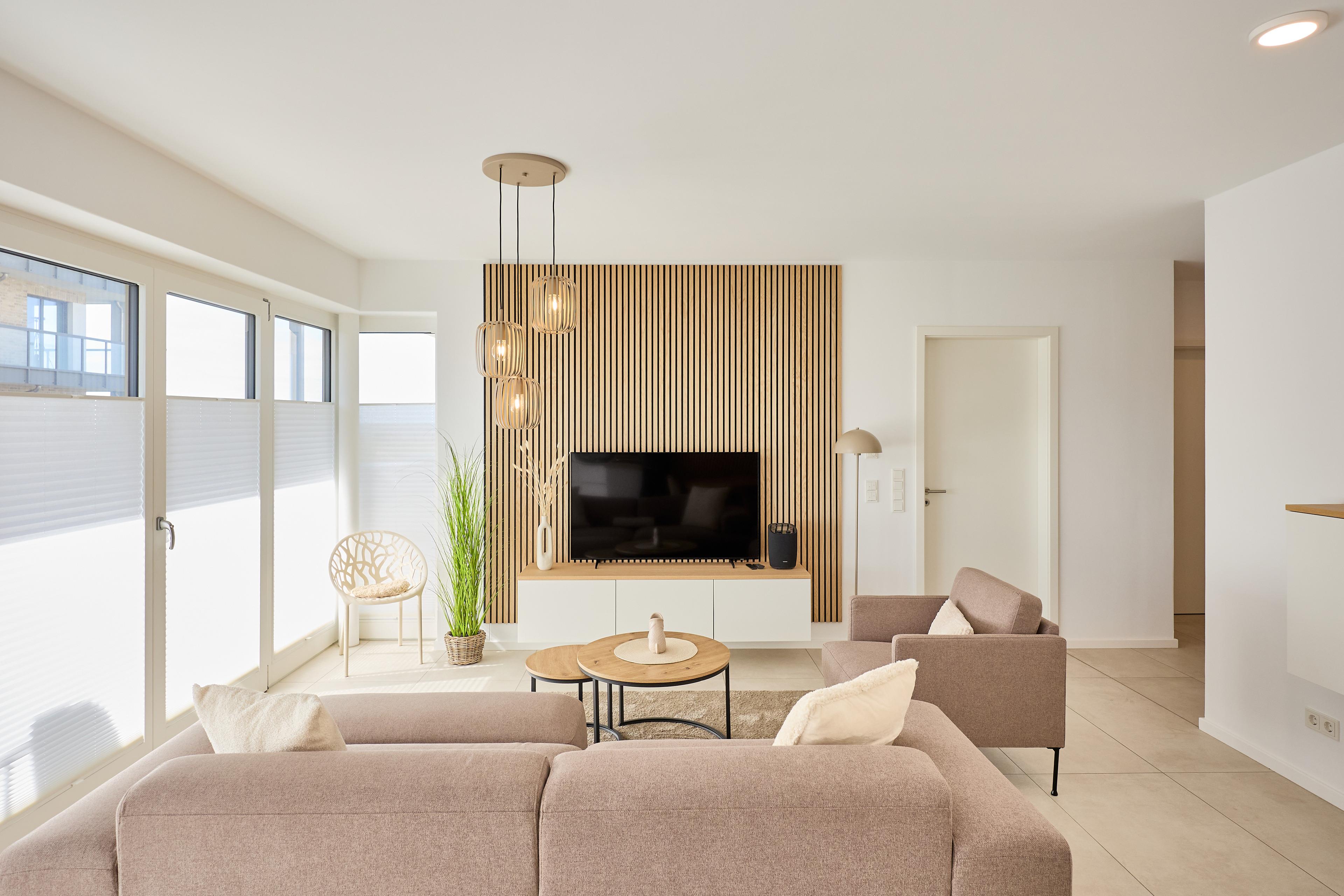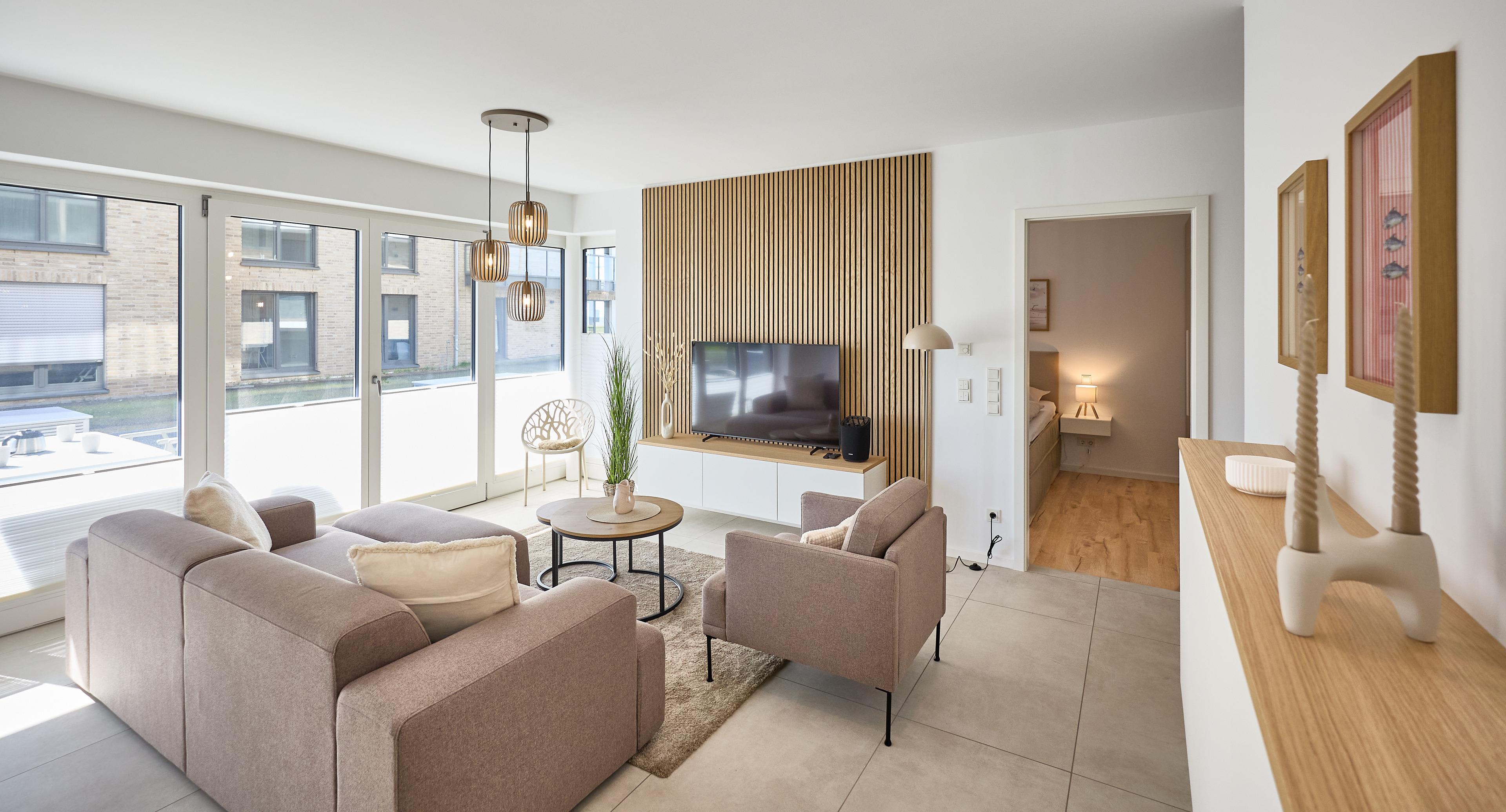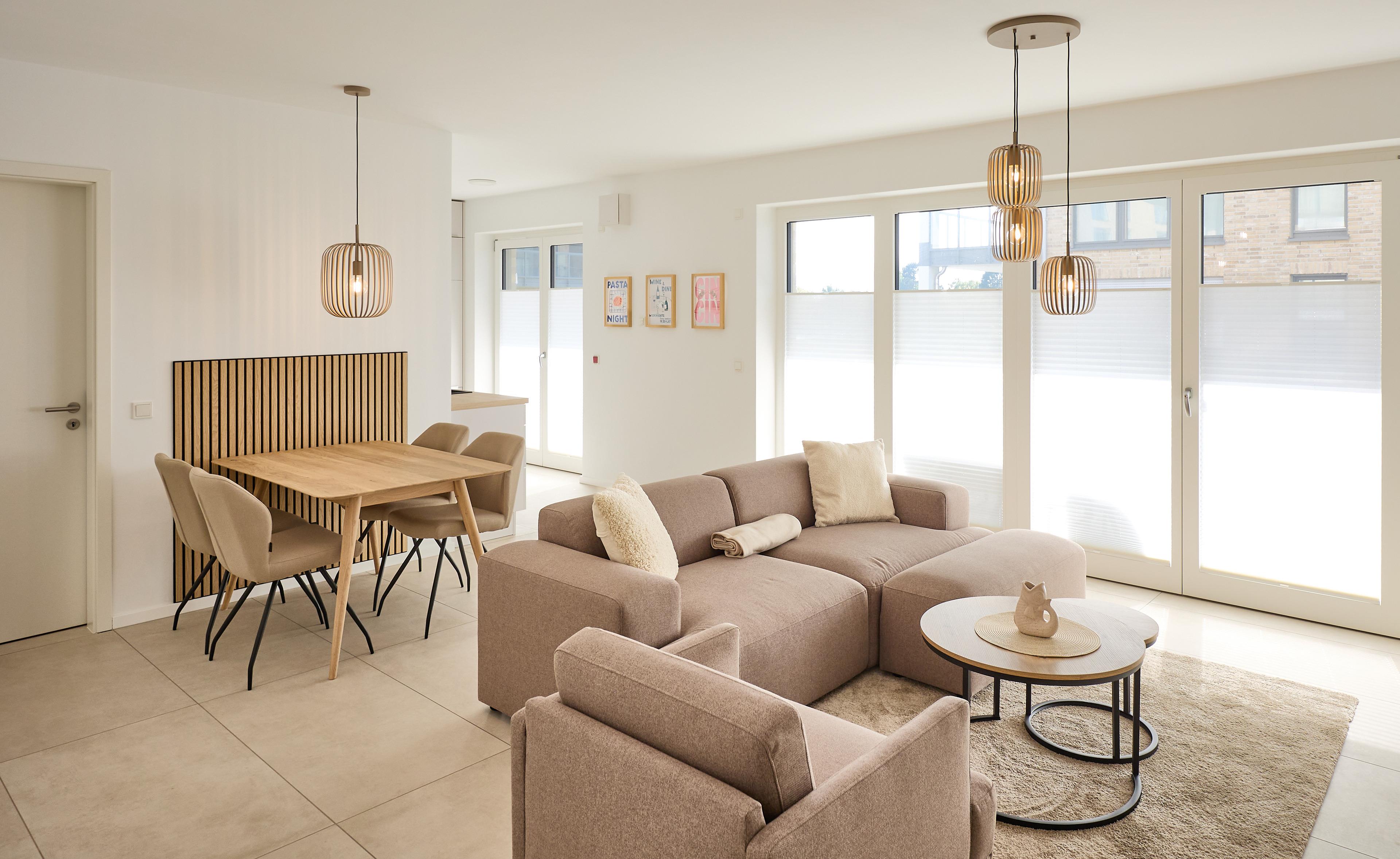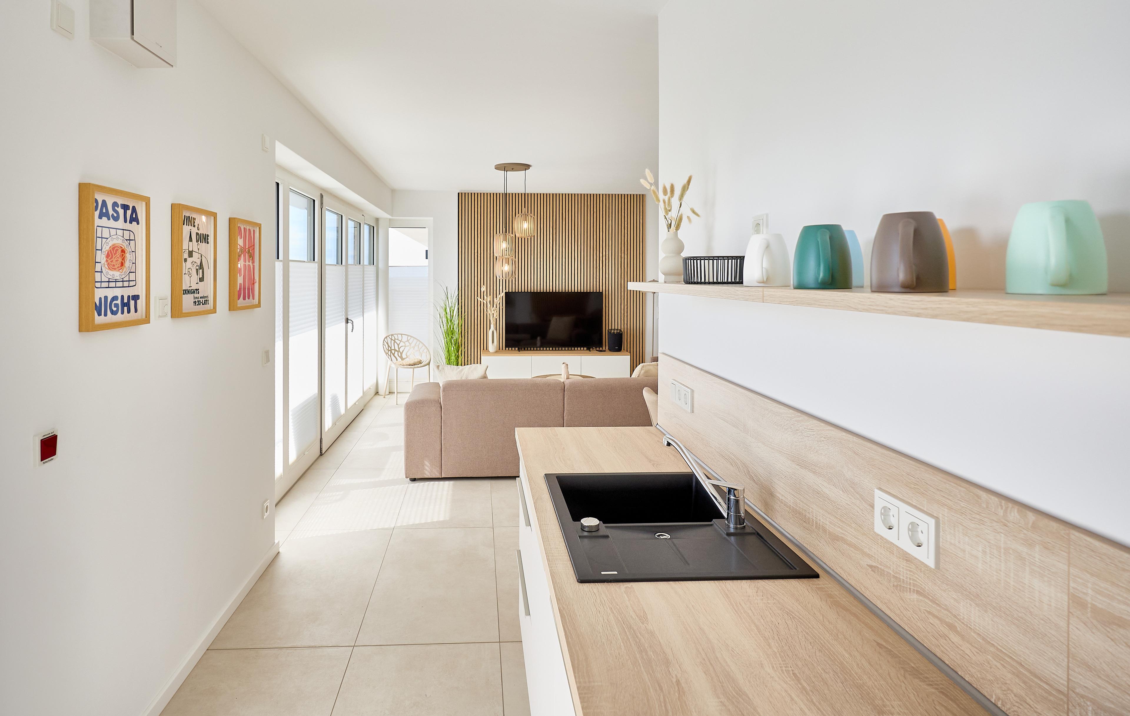 Die Wohnung überzeugt mit einem offenen Wohnbereich, der Kochen, Essen und Entspannen perfekt miteinander verbindet. Eine voll ausgestattete Küche mit Ceranfeld, Backofen, Kühlschrank mit Gefrierfach sowie einer Pad- und Filterkaffeemaschine lässt keine Wünsche offen. Der stilvolle Esstisch bietet Platz für gemeinsame Mahlzeiten, während das gemütliche Sofa und ein großer 55‘‘ Flachbild-TV entspannte Stunden garantieren.