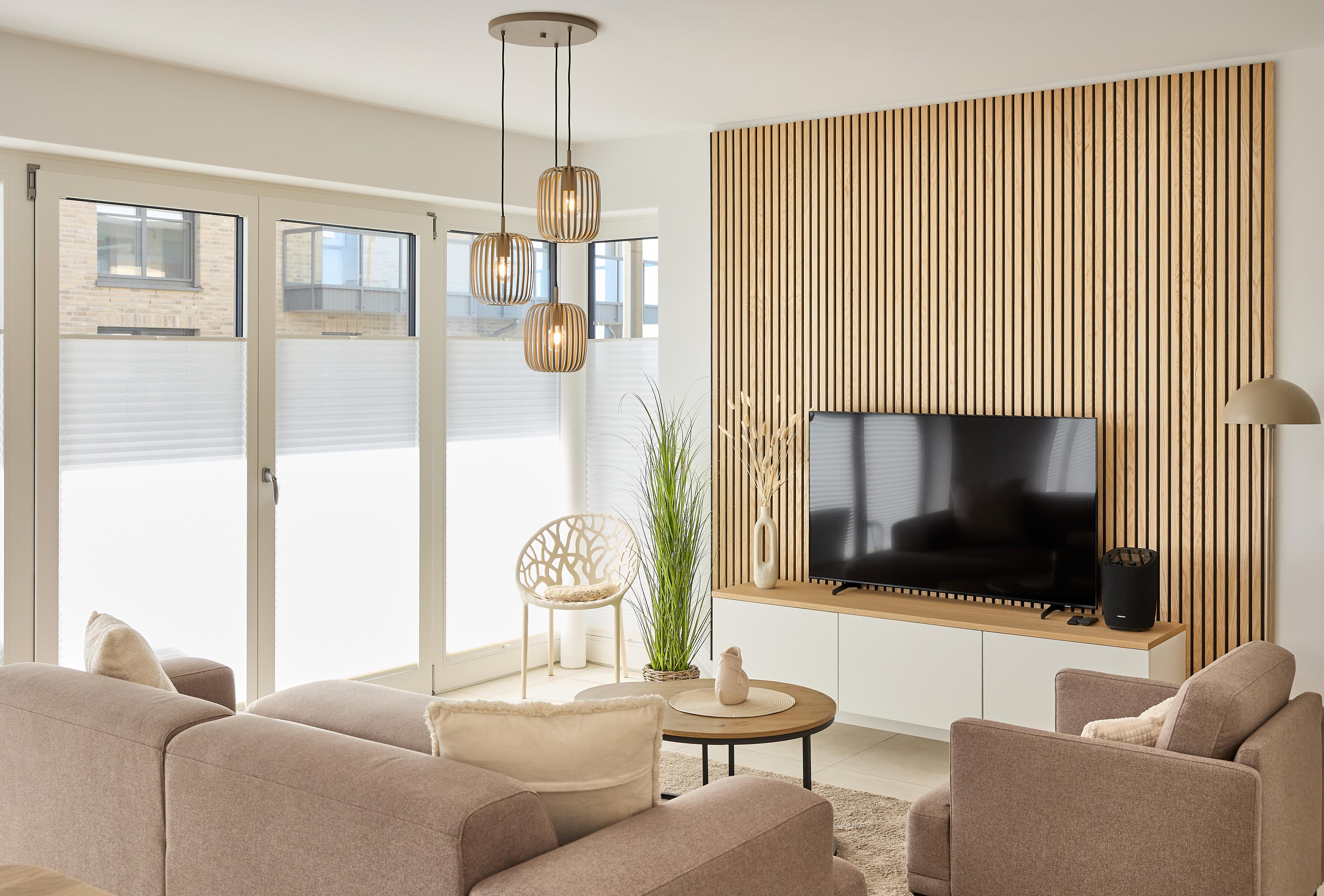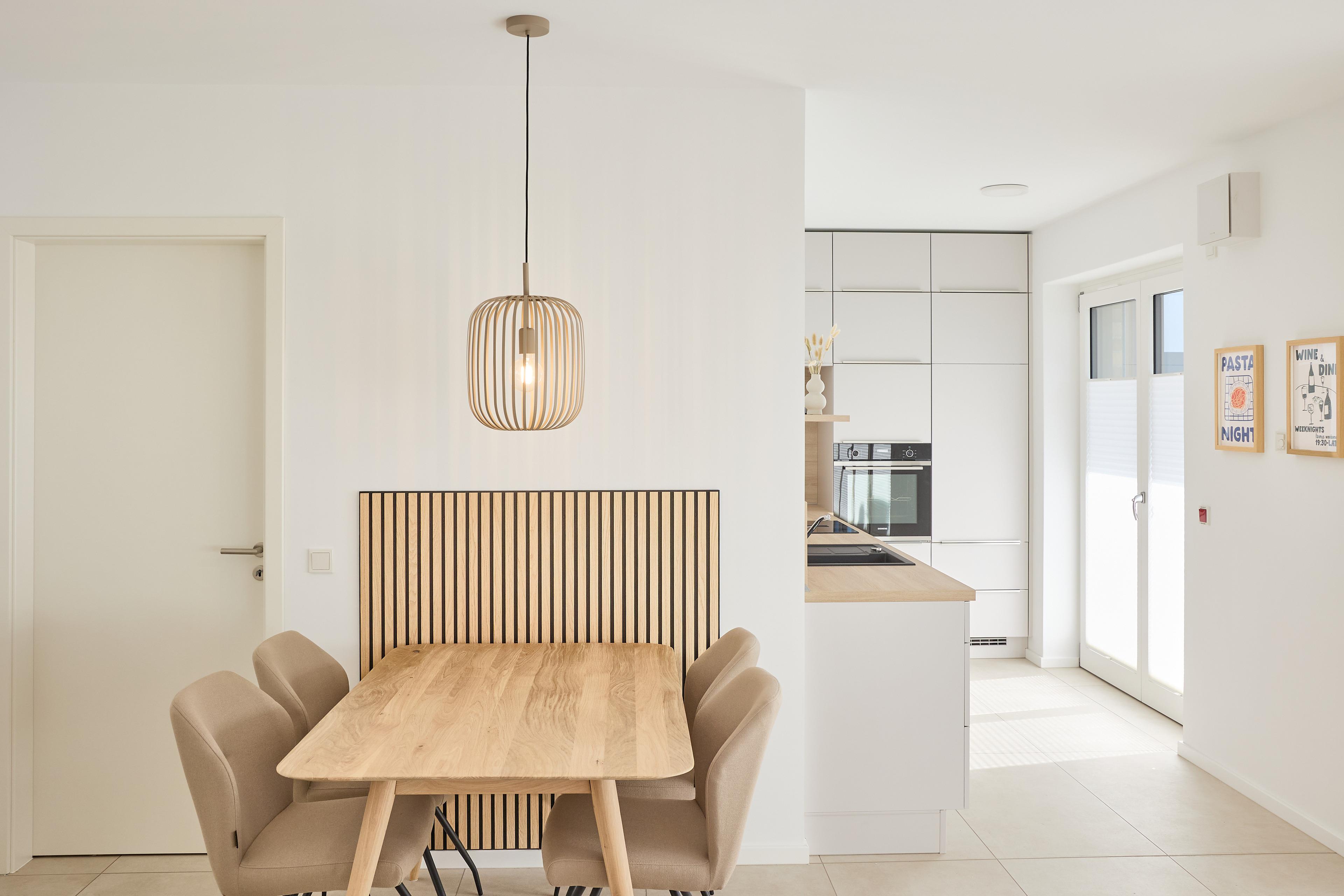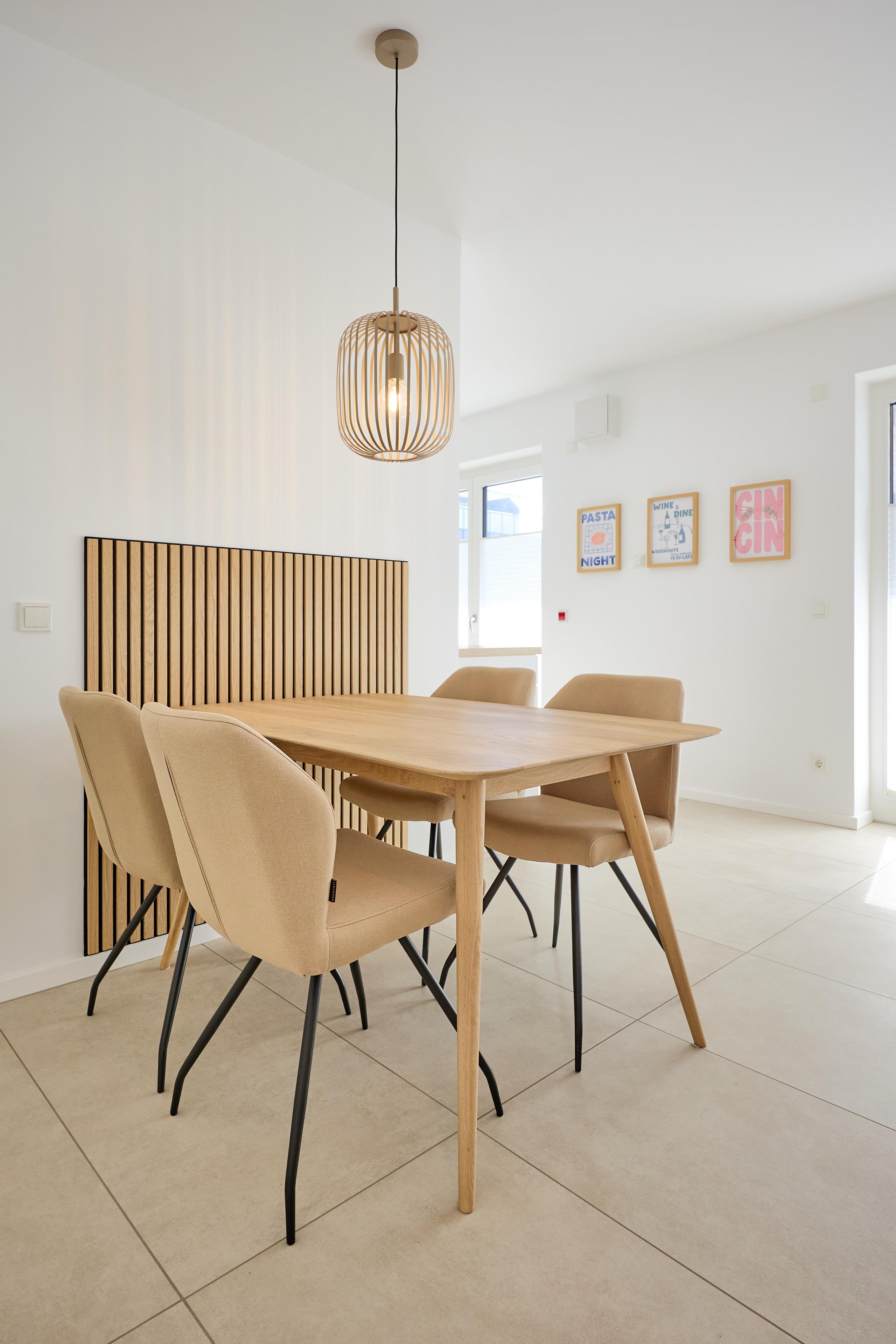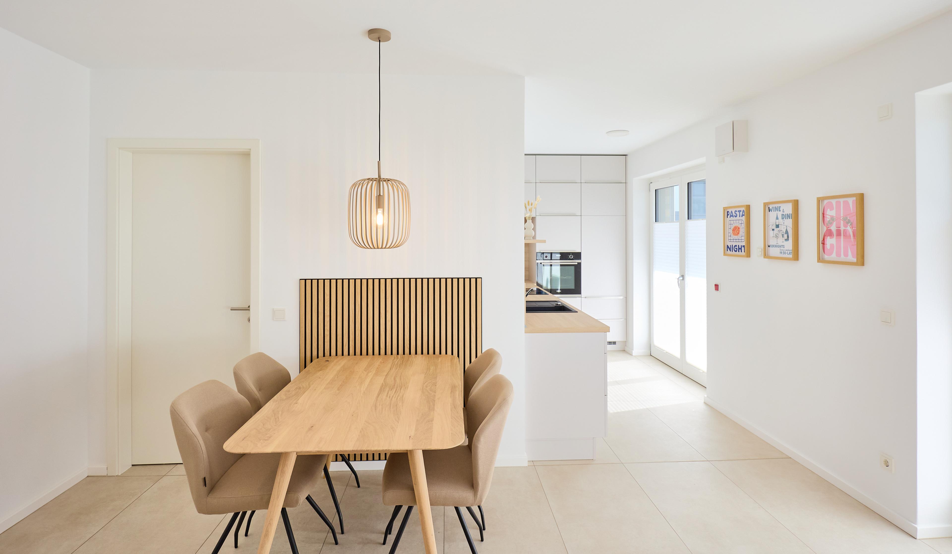 Die Wohnung überzeugt mit einem offenen Wohnbereich, der Kochen, Essen und Entspannen perfekt miteinander verbindet. Eine voll ausgestattete Küche mit Ceranfeld, Backofen, Kühlschrank mit Gefrierfach sowie einer Pad- und Filterkaffeemaschine lässt keine Wünsche offen. Der stilvolle Esstisch bietet Platz für gemeinsame Mahlzeiten, während das gemütliche Sofa und ein großer 55‘‘ Flachbild-TV entspannte Stunden garantieren.