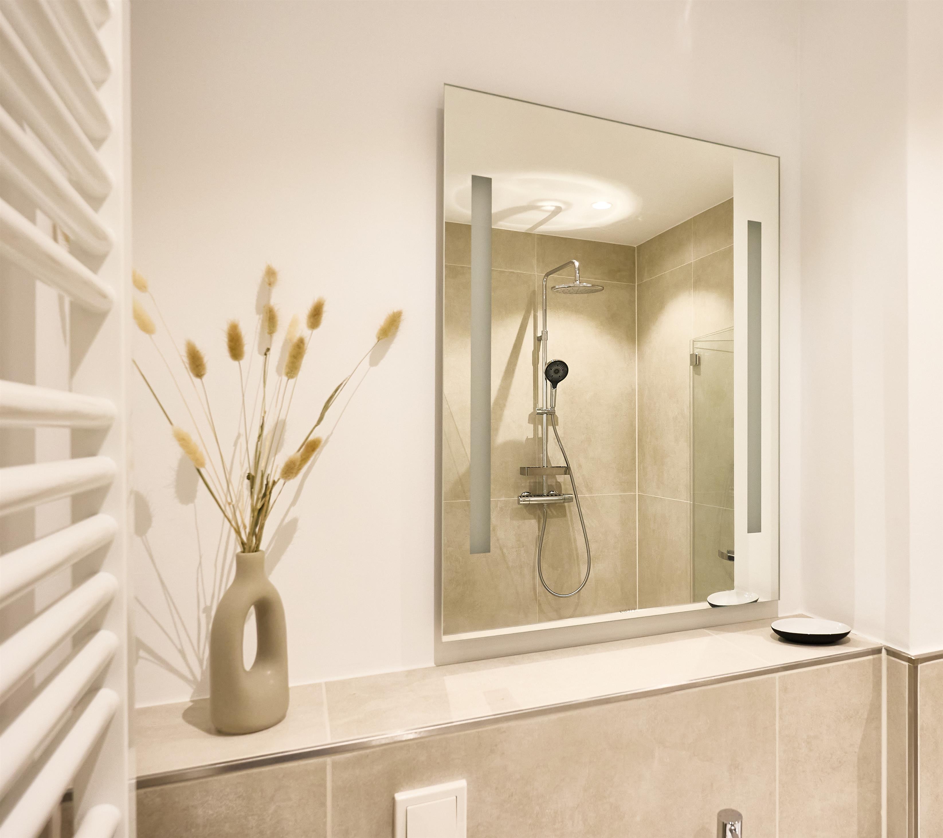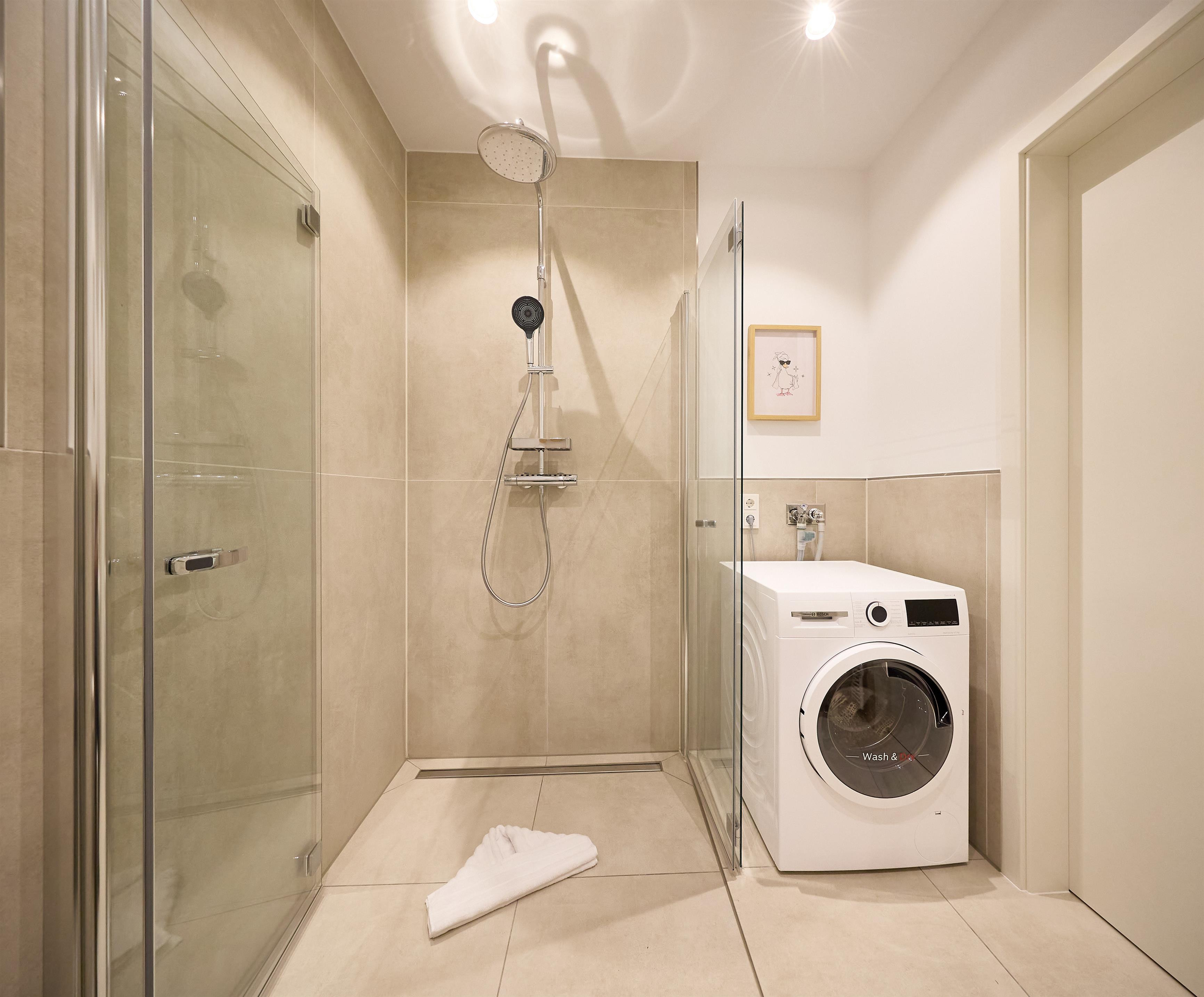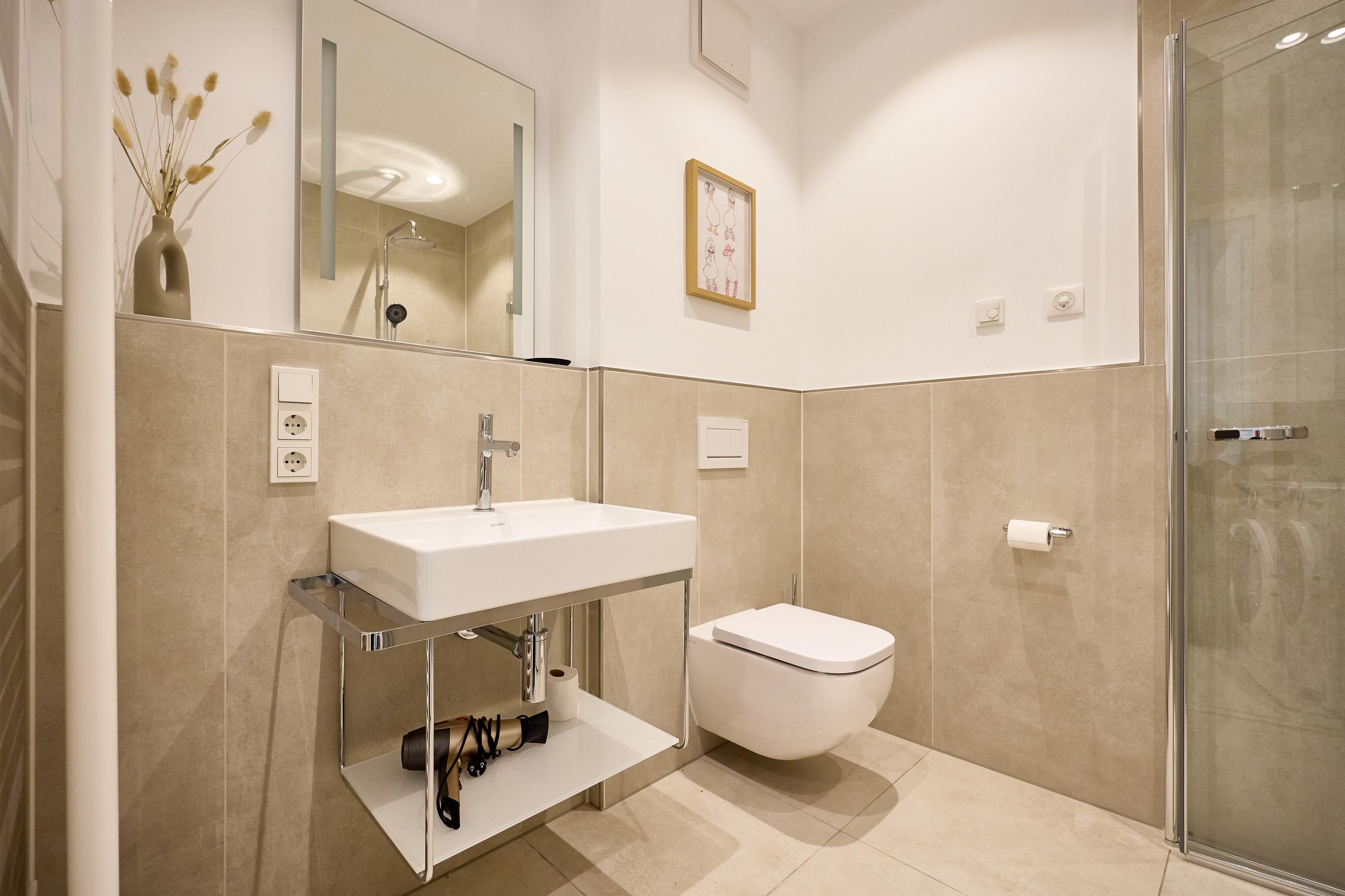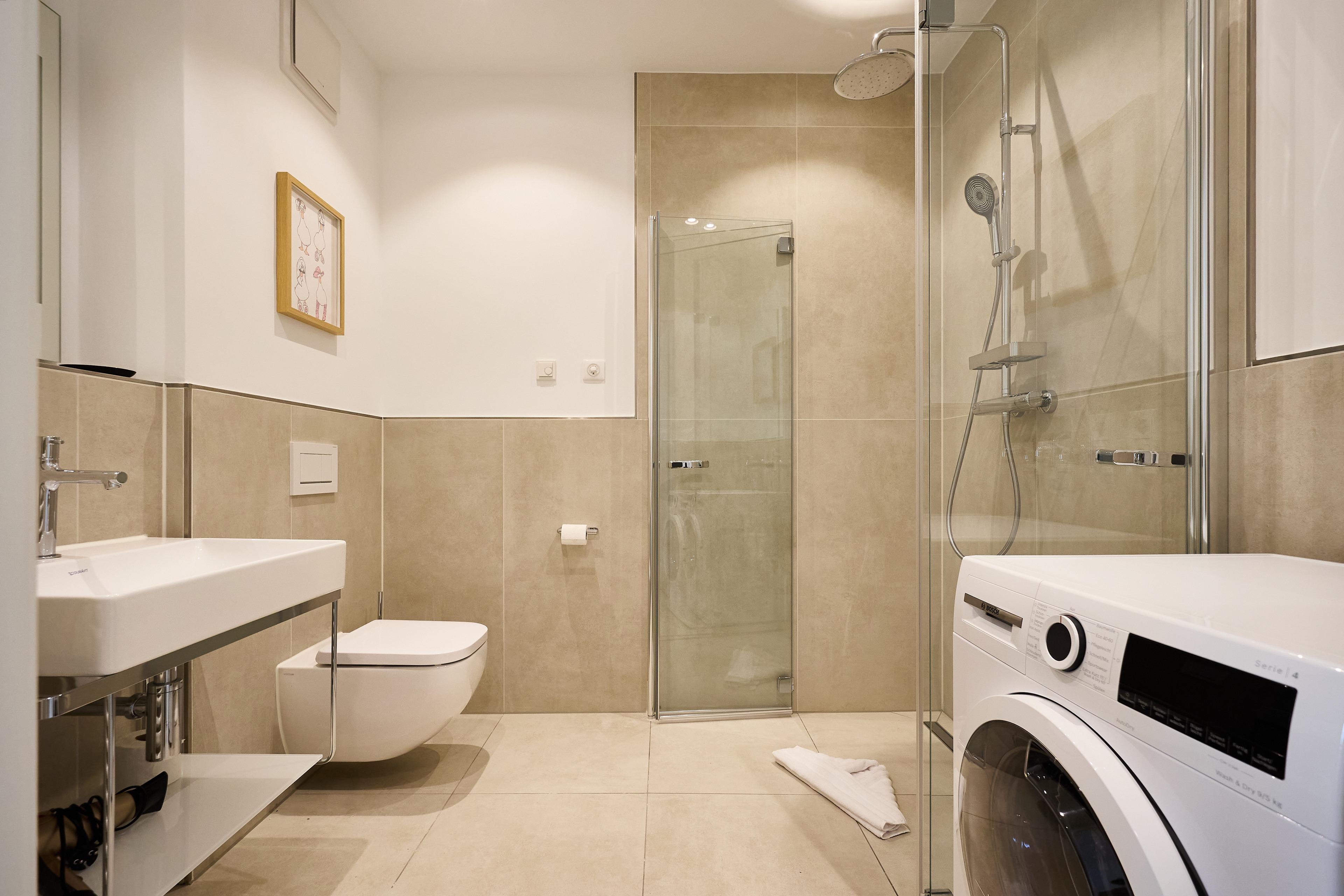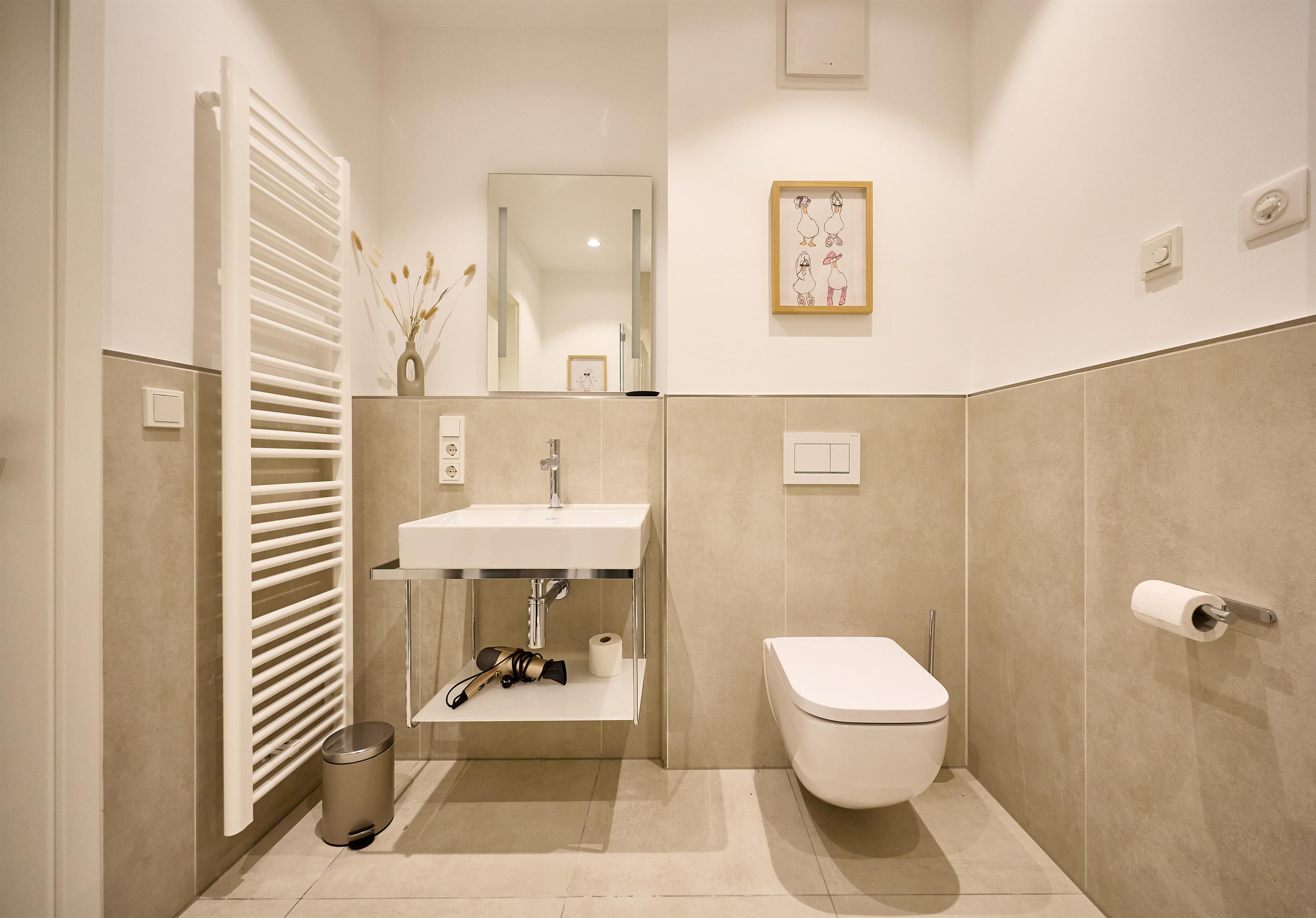 Das moderne Badezimmer besticht durch eine bodengleiche Regendusche, hochwertige Armaturen, eine Handtuchheizung sowie einen praktischen Waschtrockner. Ein zusätzliches Gäste-WC sorgt für noch mehr Komfort. Die gesamte Wohnung verfügt über eine angenehme Fußbodenheizung.