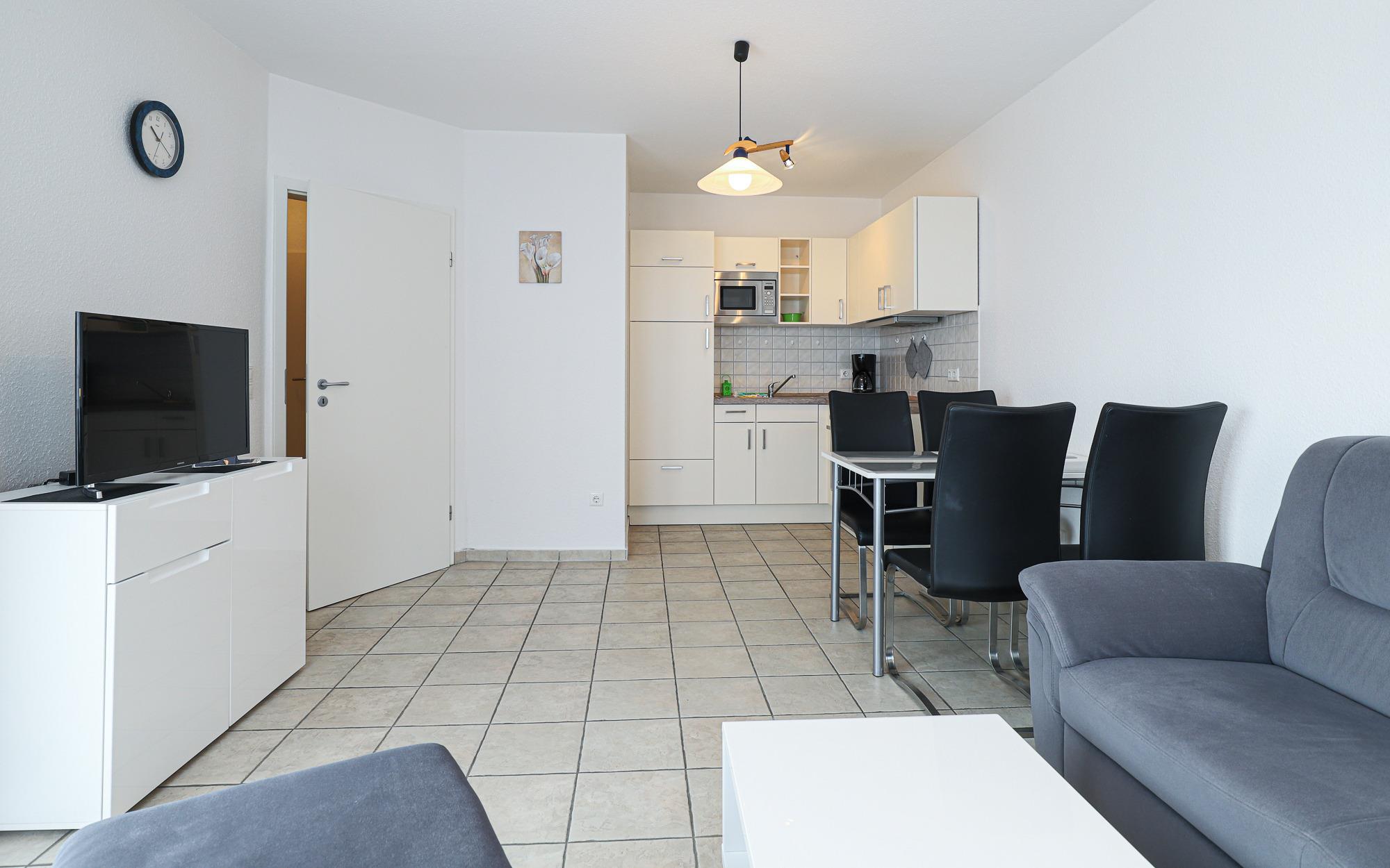 Die ca. 50 m² große, liebevoll eingerichtete 2-Raum-Wohnung im Hochparterre bietet Platz für bis zu drei Personen. Sie verfügt über einen einladenden Wohn- und Essbereich mit komfortabler Einbauküche, ein separates Schlafzimmer mit Kleiderschrank sowie ein modernes Duschbad (Dusche/WC) und einen Abstellraum. Alle Räume (außer Schlafzimmer) sind hell gefliest. Für die dritte Person steht im Wohnbereich ein bequemes Schlafsofa mit eigener Matratze zur Verfügung. Der großzügige Balkon in Ost-/Südausrichtung ist ideal, um in der Morgensonne zu frühstücken oder am frühen Nachmittag in der Sonne zu entspannen – mit Blick ins Grüne und frischer Nordseeluft.