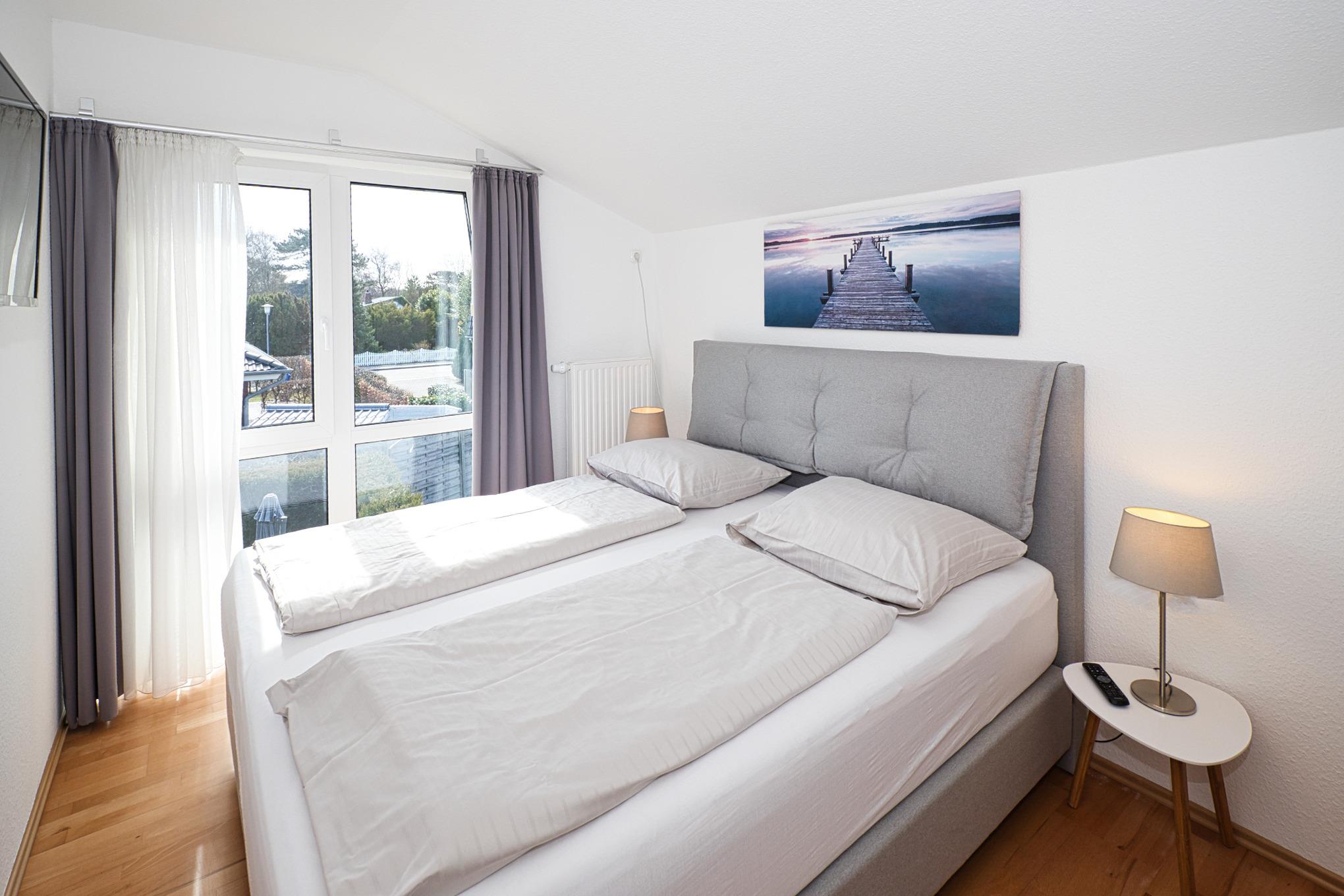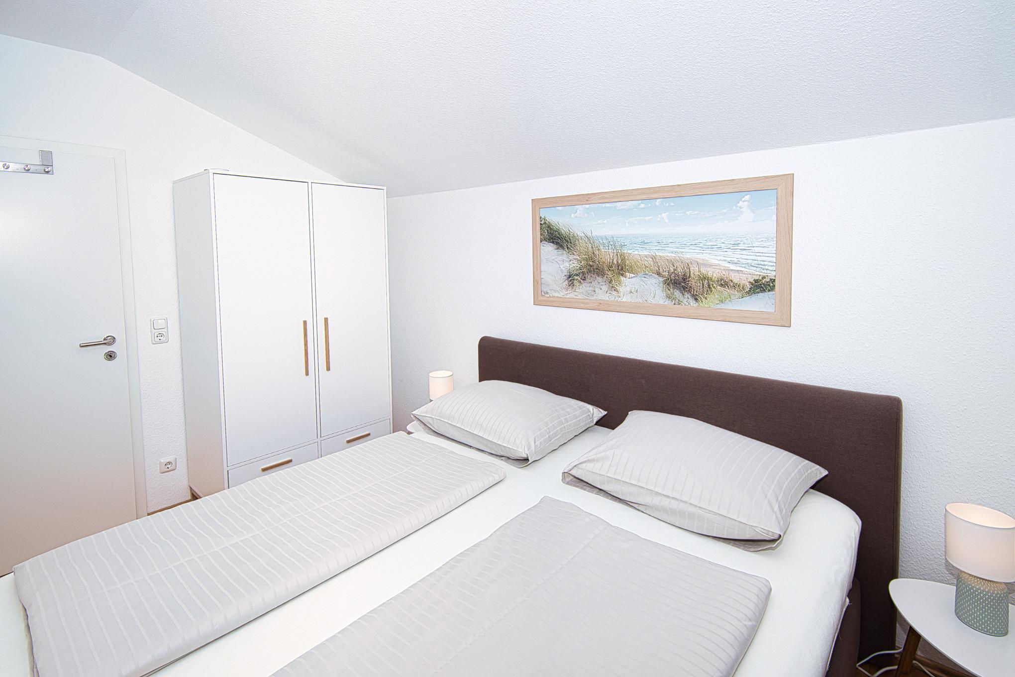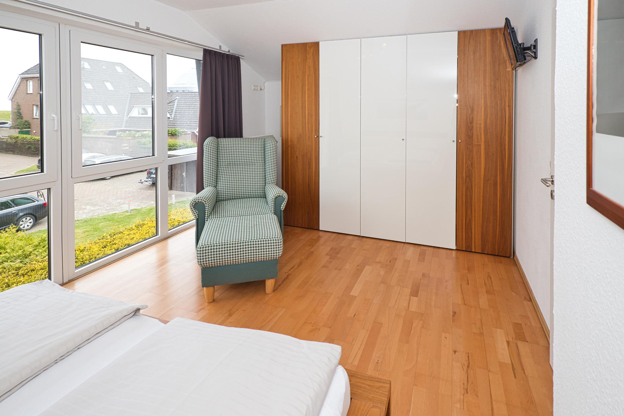 Hauptschlafzimmer zusätzlich mit TV, Lesesessel und seitlichem, ganz kleinen Nordseeblick (zwischendurch die Häuser am Dünenweg)
