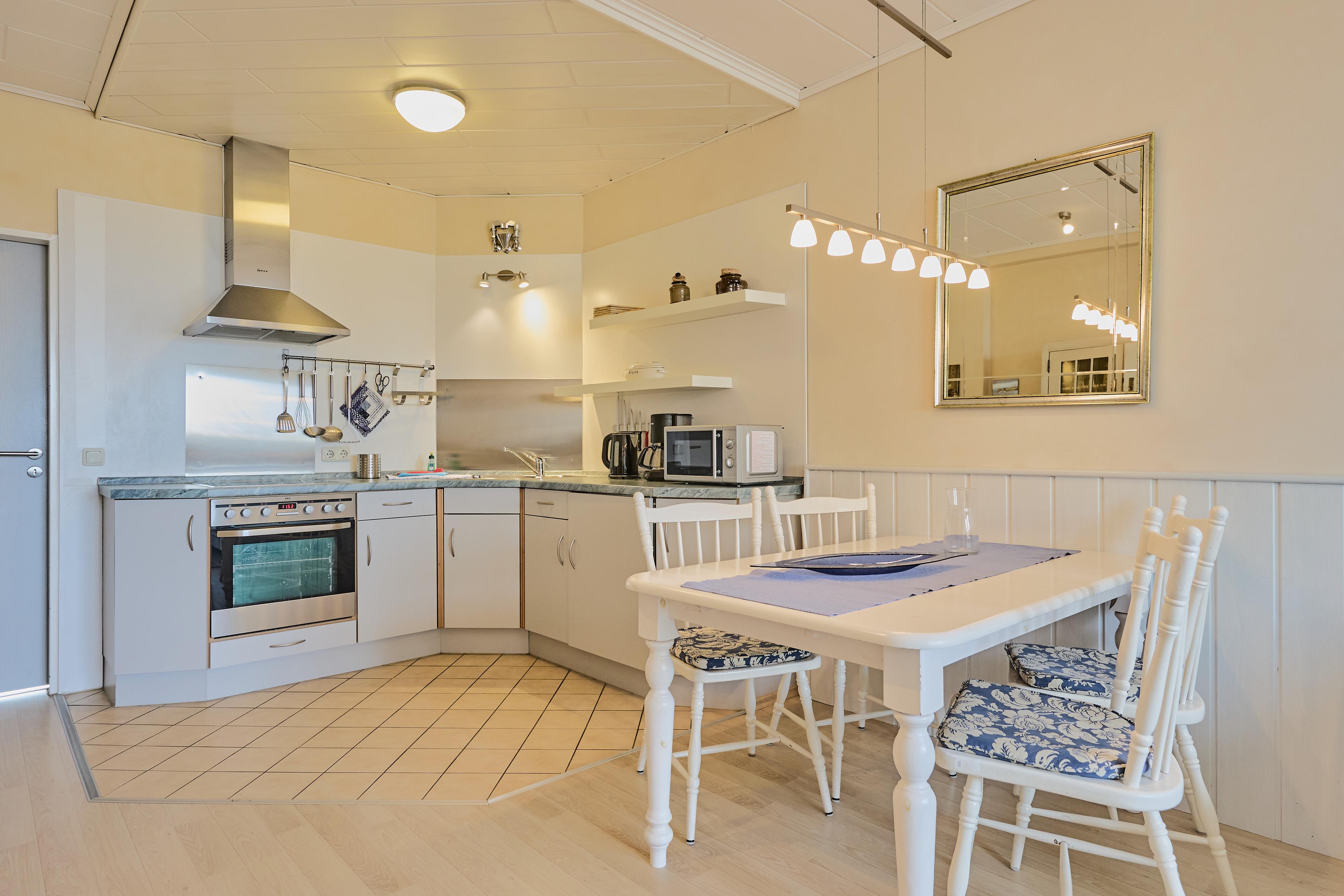 Die großzügige Einbauküche in Holzdekor ist über Eck angelegt und funktional ausgestattet. Cerankochfeld, Backofen, teilweise Dunstabzugshaube, Kühlschrank und Edelstahlspüle sorgen dafür, dass auch im Urlaub das Kochen angenehm und unkompliziert bleibt. Die Küche bietet ausreichend Stauraum und praktische Ausstattungsdetails für den täglichen Bedarf.