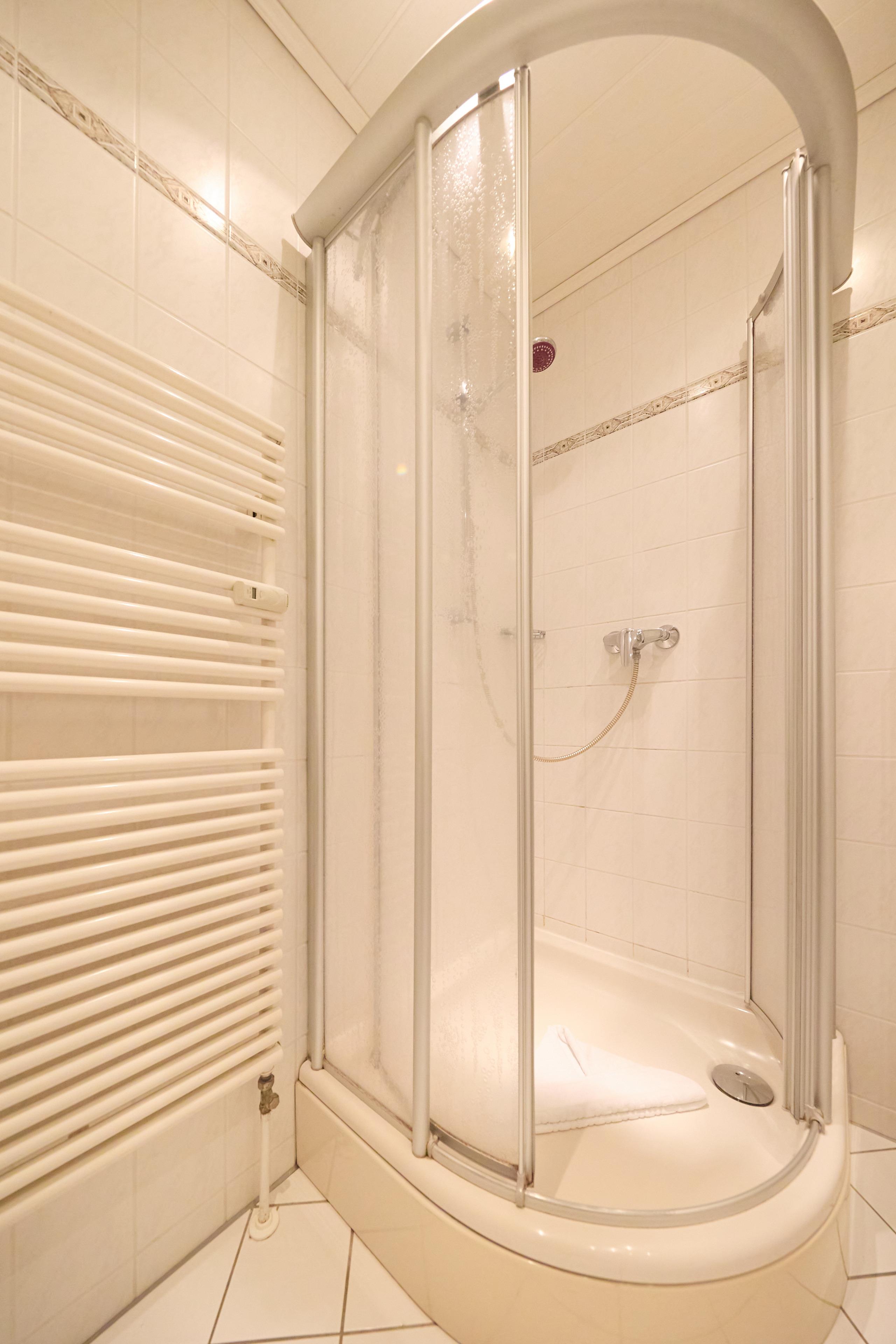 Das modern gestaltete Badezimmer verfügt über eine Eck-Runddusche, ein großes Handwaschbecken, ein Hänge-WC sowie mehrere Ablageschränke. Die hochwertige Fliesenverkleidung an Wänden und Boden sorgt für eine angenehme Atmosphäre. Der Heizkörper dient gleichzeitig als Handtuchtrockner.