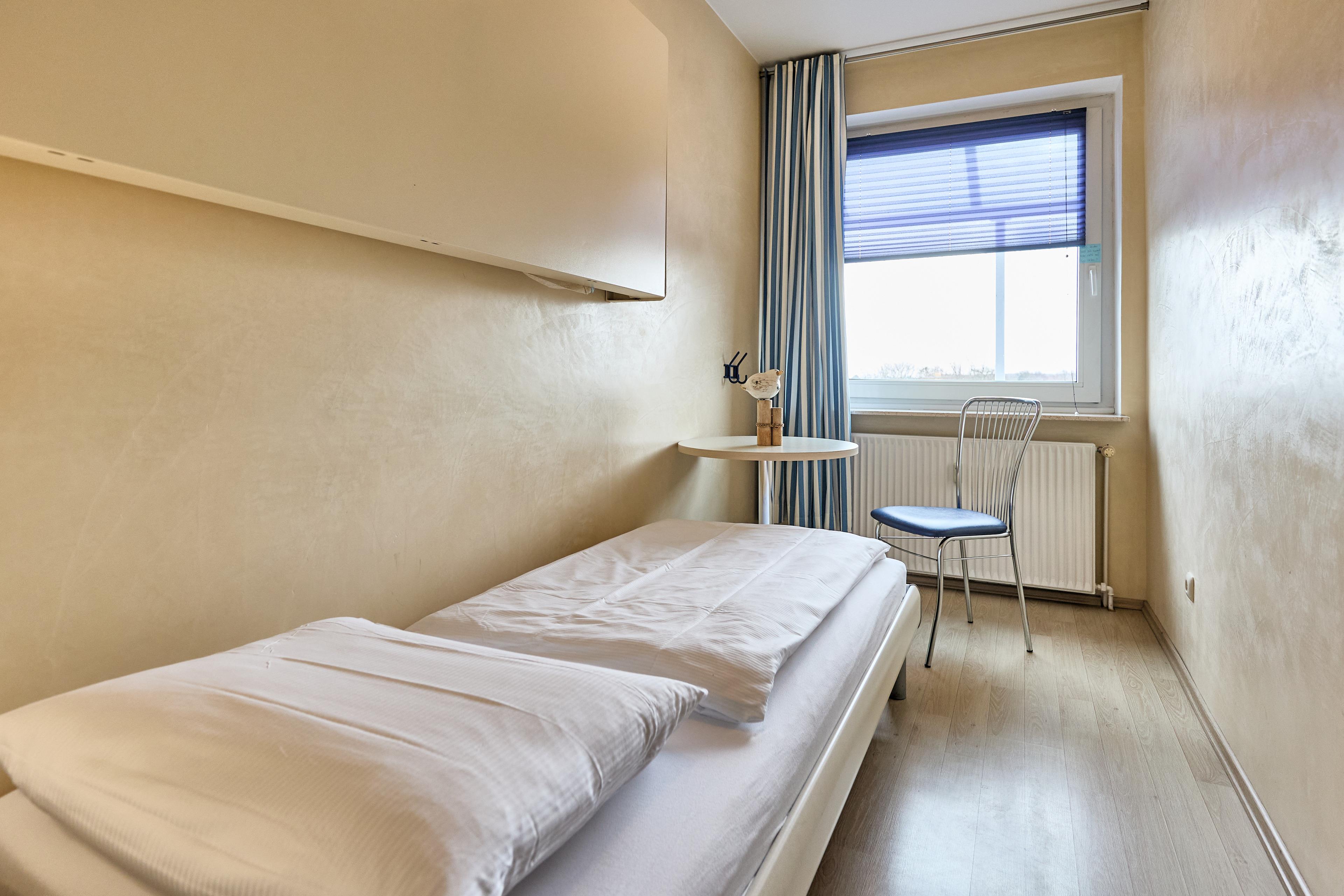Im Hauptschlafzimmer erwartet Sie ein bequemes Doppelbett sowie ein großer Kleiderschrank mit viel Stauraum. Von hier aus gelangen Sie direkt auf den großen, überdachten und windgeschützten Südbalkon – ein schöner Platz, um die Sonne zu genießen oder den Tag ruhig ausklingen zu lassen. Das zweite Schlafzimmer ist mit einem Einzelbett sowie einem wandklappbaren Etagenbett ausgestattet, das an die Schlafbereiche großer Fährschiffe erinnert. Ein Einbauschrank ergänzt die Ausstattung und bietet Platz für Kleidung und persönliche Dinge.