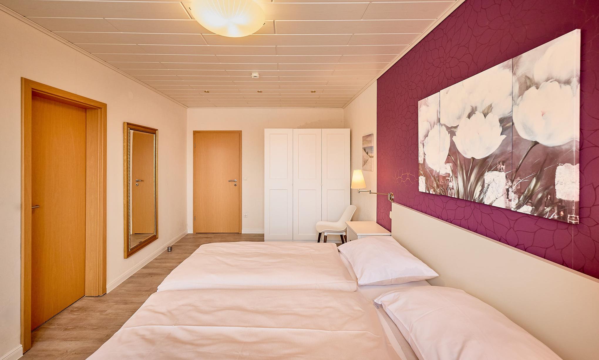 Separates Schlafzimmer mit Doppelbett und Zugang zum Südbalkon. Der Balkon liegt ruhig und eignet sich gut für ein Frühstück oder eine kleine Auszeit in der Sonne.