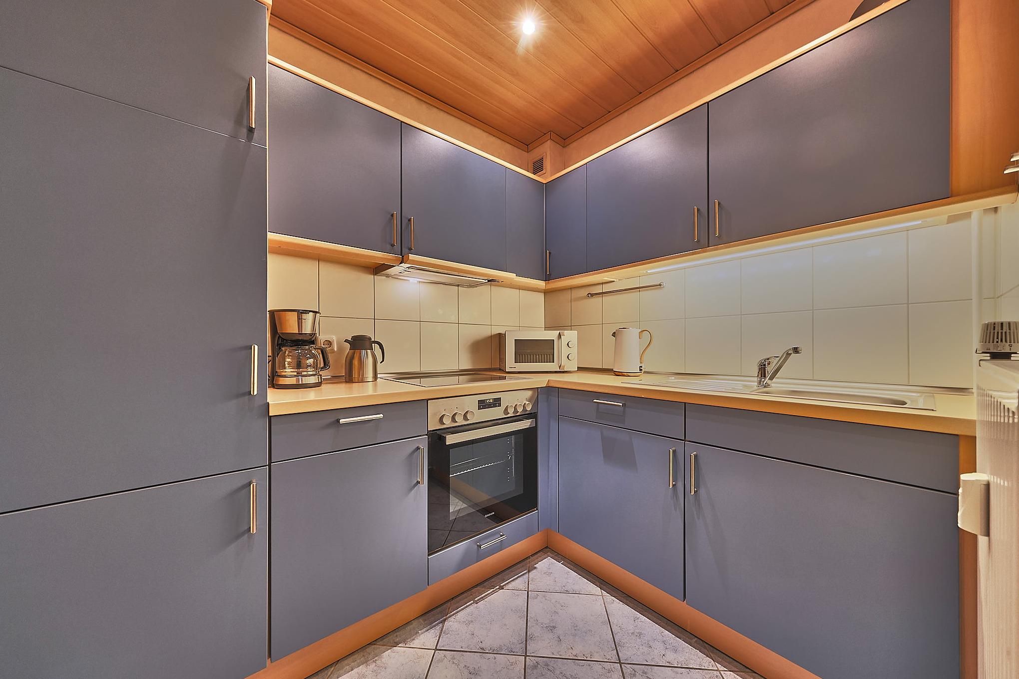 Der separate Küchenbereich ist funktional ausgestattet und bietet alles, was Sie für die tägliche Selbstverpflegung benötigen.