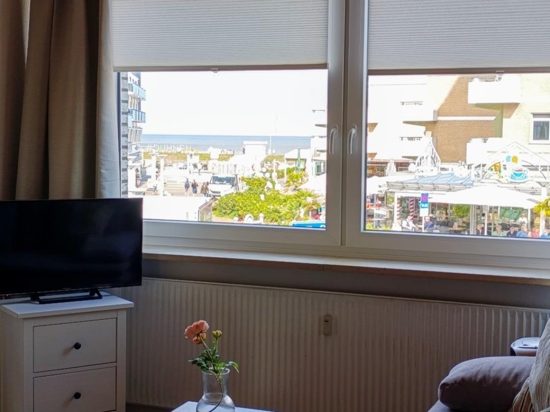 Der Wohnbereich ist gemütlich eingerichtet und bietet mit einer Schlafcouch einen angenehmen Ort zum Entspannen. Von hier aus genießen Sie den Blick auf den Duhner Dorfbrunnen sowie entlang der Strandstraße einen kleinen Blick Richtung Nordseehorizont. Das lebendige Treiben der Fußgängerzone sorgt auch hier für maritimes Urlaubsflair.