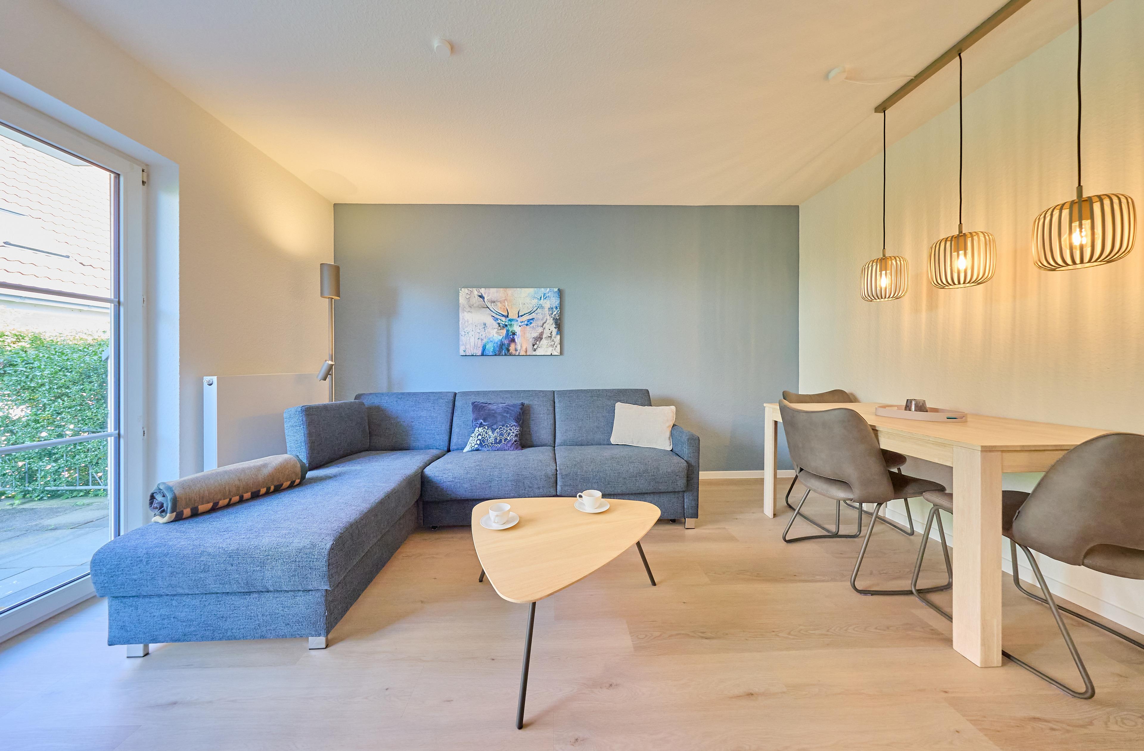 Wohnbereich mit Schlafsofa und Zugang zur sonnigen Terrasse
