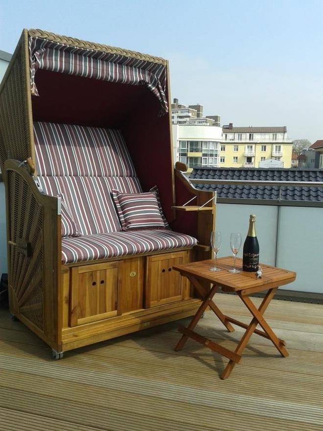Ein wahres Highlight ist die großzügige Dachterrasse mit hochwertigem Bangkirai-Boden, Strandkorb, Teak-Tisch und gemütlichen Stühlen. Egal bei welchem Wetter, hier können Sie sich entspannen – die Terrasse ist teilweise überdacht. Genießen Sie Ihr Frühstück in der gesunden Nordseeluft!