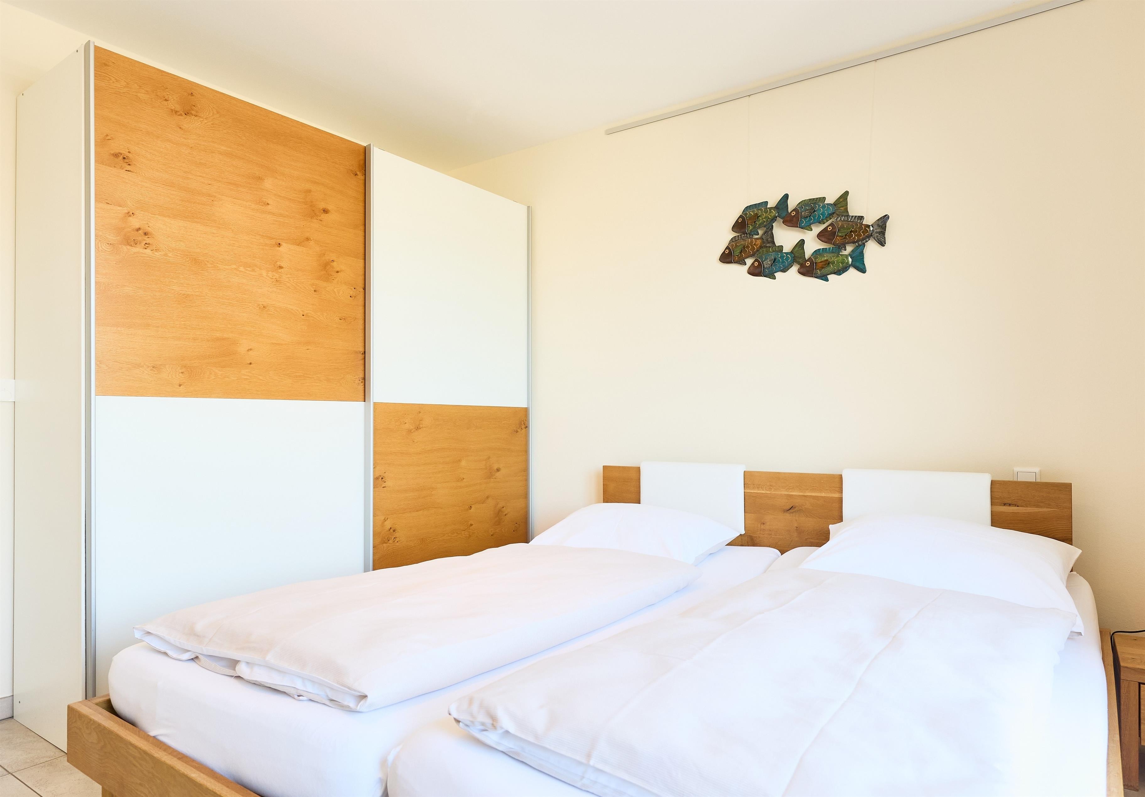 Der überdachte Balkon auf der Rückseite, sowie ein zweiter Balkon, der vom Schlafbereich aus begehbar ist ermöglicht Ihnen, der Sonne zu folgen. Vom Flur mit Garderobe gelangen Sie zu einem Duschbad mit WC, einem Gäste-WC und zwei weiteren voll ausgestatteten Schlafbereichen. Beide Schlafzimmer verfügen über ein komfortables Doppelbett und einen geräumigen Kleiderschrank. Diese Ferienwohnung ist perfekt für einen entspannten Familienurlaub - nah am Strand und dennoch ruhig gelegen.