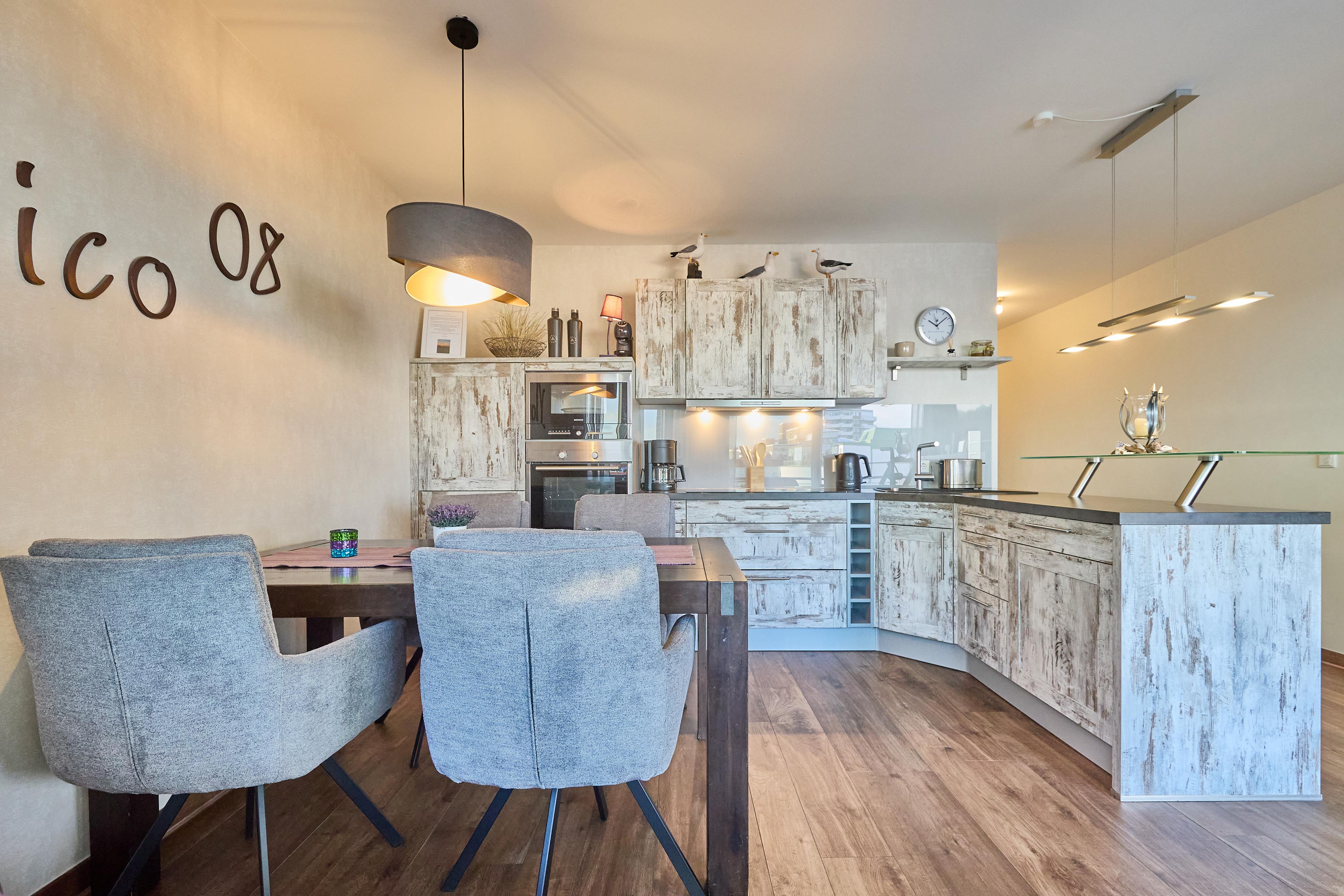 Der stilvoll eingerichtete Wohn- und Essbereich lädt zum Verweilen ein. Ausgesuchte Möbel, darunter Stühle mit Drehfunktion am Esstisch, erleichtern das Hinsetzen und Aufstehen und steigern den Komfort. Die Beleuchtung im Essbereich sorgt für ein besonders angenehmes, warmes Licht. Zusätzlich bietet die voll ausgestattete Einbauküche eine Kapselmaschine für Nescafé Dolce Gusto sowie alles, was Sie für ein genussvolles Frühstück benötigen. Alternativ können Sie Ihr Frühstück auf dem Nordost-Balkon mit seinen gemütlichen Möbeln genießen.
