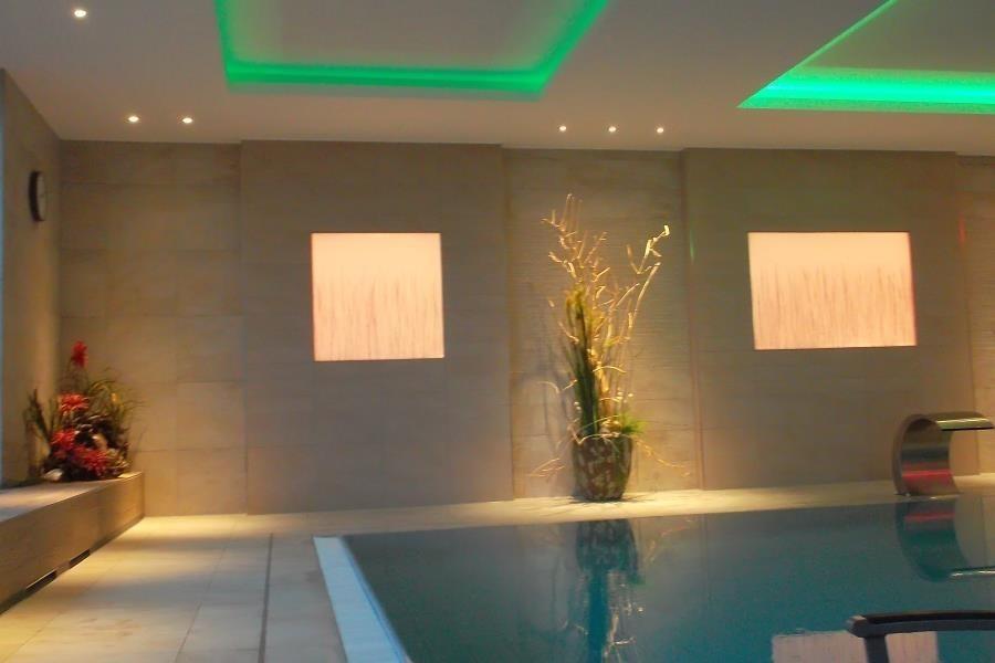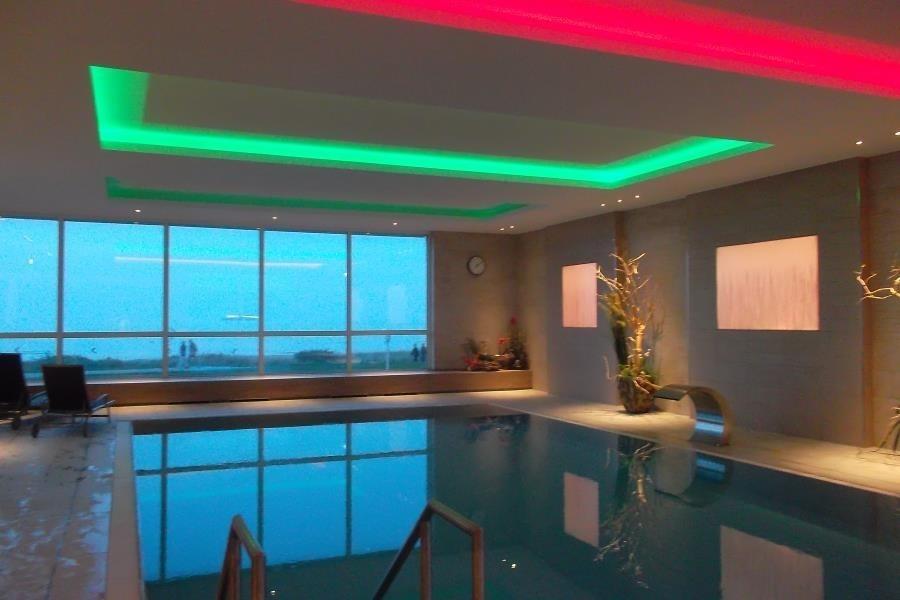 Ein besonderes Highlight des Hauses ist die hauseigene Wellnessanlage. Im modernen Schwimmbad im 1. Obergeschoss genießen Sie einen direkten, großzügigen Panoramablick auf die Nordsee, der sich auch aus den Ruheräumen und vom Balkon der Sauna eröffnet.