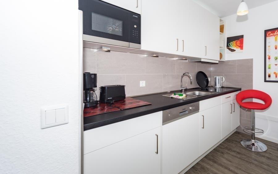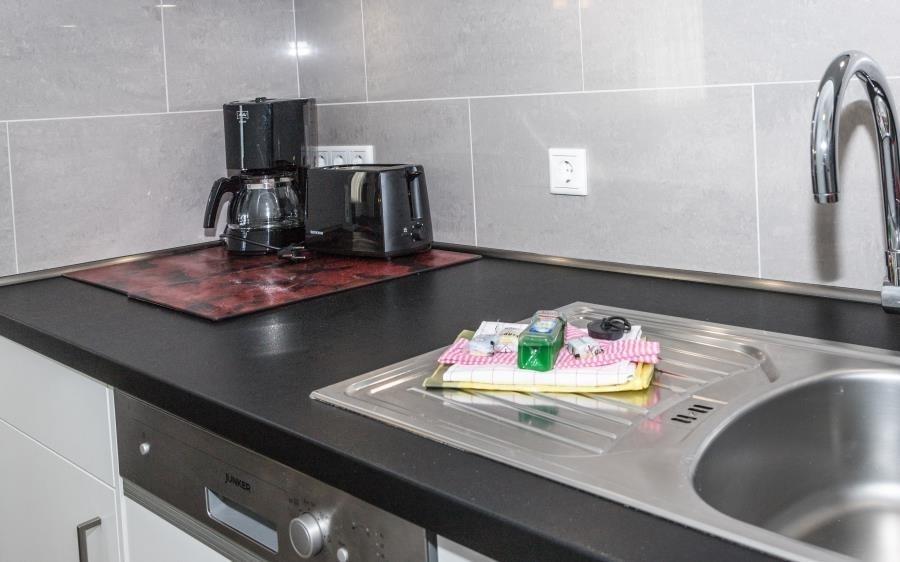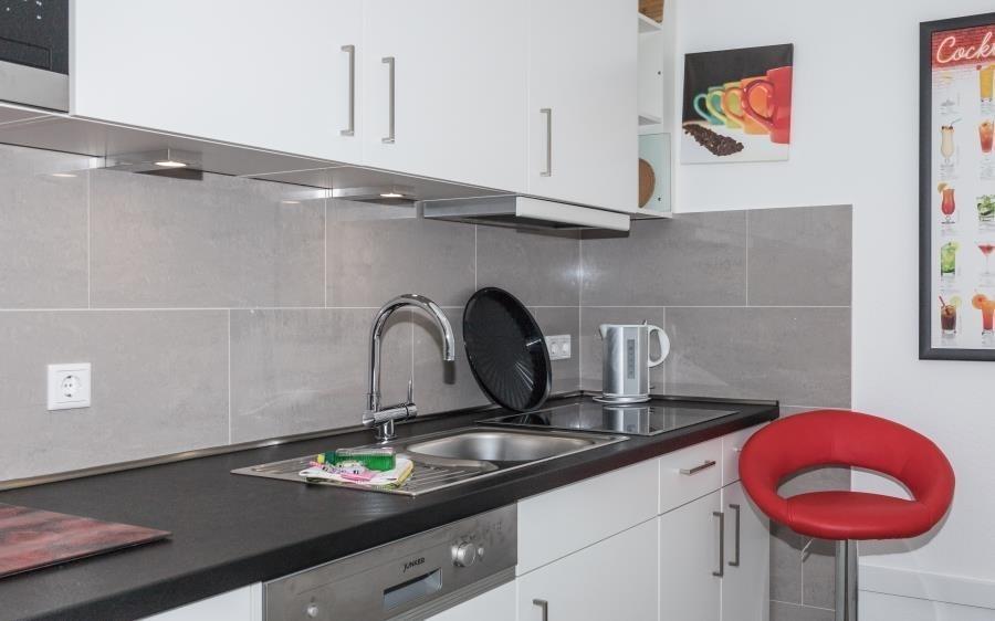 Die komplett eingerichtete Kochnische ermöglicht eine unkomplizierte Selbstverpflegung im Urlaub und ist unter anderem mit einem Geschirrspüler ausgestattet. Alternativ stehen Ihnen die Restaurants im Erdgeschoss des Hauses zur Auswahl. Frische Frühstücksbrötchen holen Sie bequem mit dem Aufzug direkt aus der Bäckerei im Haus.