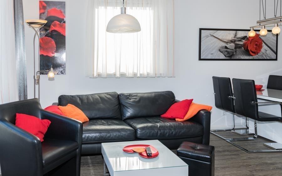 Der Wohnbereich ist hochwertig ausgestattet und so ausgerichtet, dass der Meerblick aus nahezu jedem Bereich erlebbar ist. Ob von den bequemen Lederpolstermöbeln, vom Esstisch oder sogar aus den feststehenden, komfortablen Betten in der Schlafnische – das Meer ist stets präsent und verleiht dem Appartement eine besondere Atmosphäre.