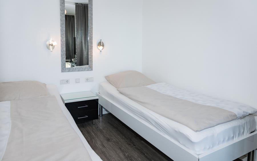 Das Appartement verfügt über einen sehr geräumigen Kleiderschrank und ist mit einem hochwertigen Designfußboden ausgestattet. Für zusätzliche Sicherheit sorgt ein fest installierter elektronischer Safe. Die Schlafbereiche sind harmonisch in den Wohnraum integriert und bieten besten Komfort bei einzigartiger Aussicht.