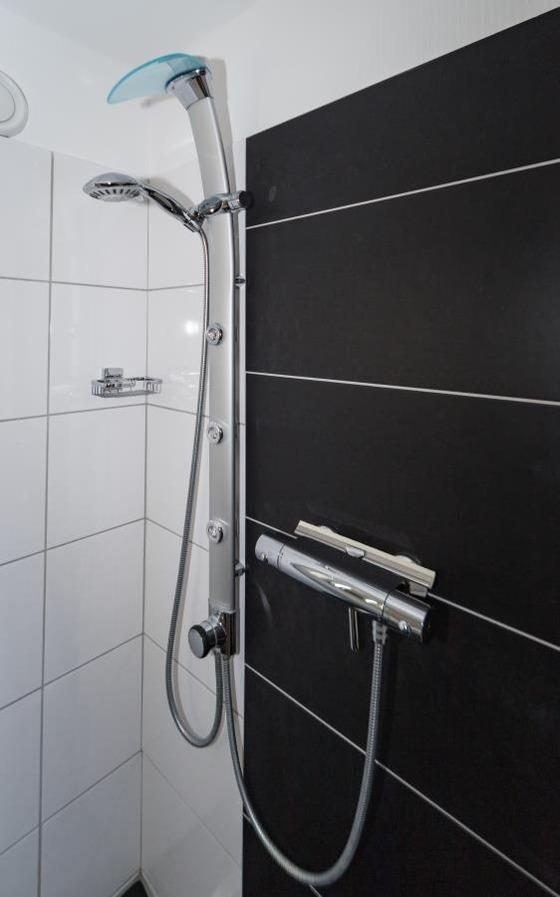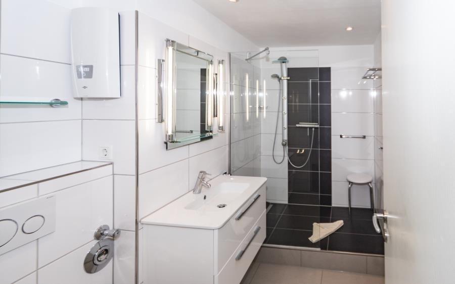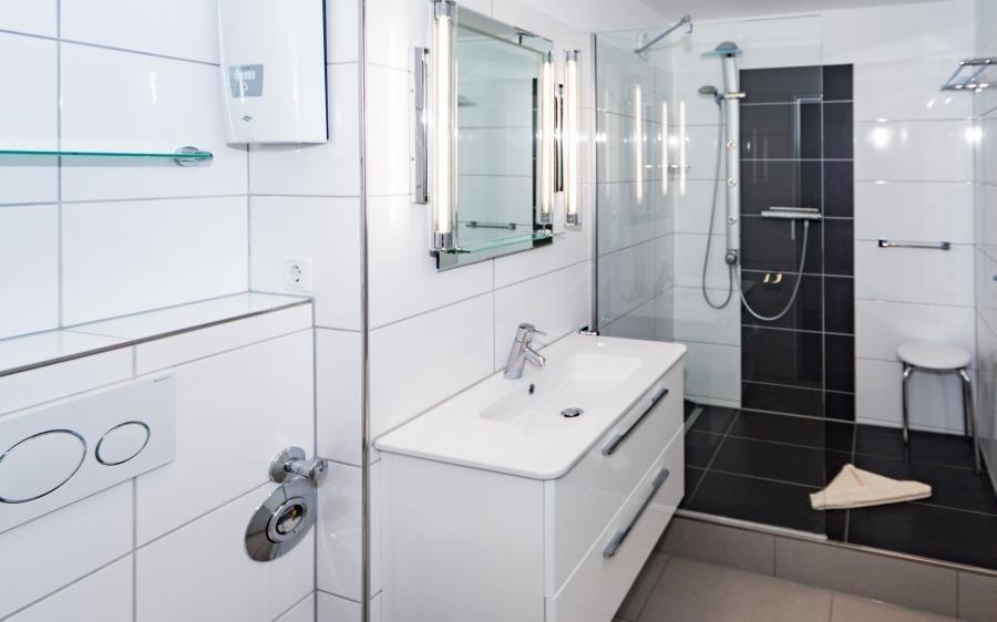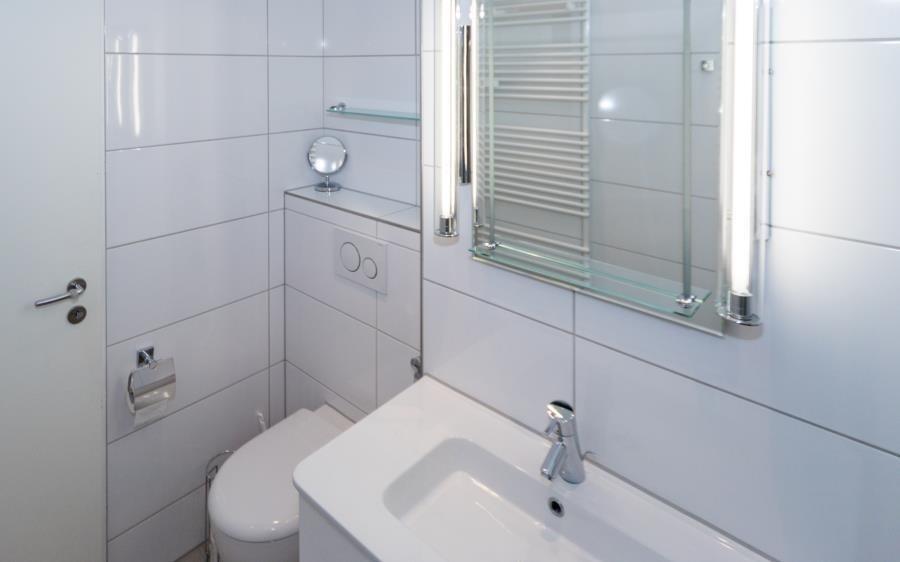Das moderne Badezimmer ist funktional und hochwertig ausgestattet und fügt sich stilvoll in das Gesamtbild der Wohnung ein. Die klare Gestaltung und durchdachte Ausstattung sorgen für angenehmen Komfort während Ihres Aufenthalts.