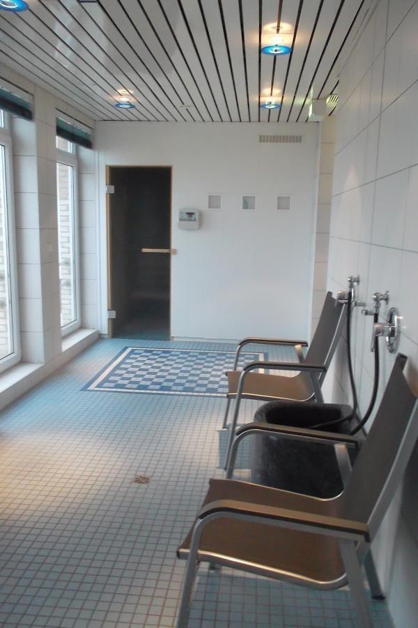 Ein besonderes Highlight ist das Schwimmbad im 1. Obergeschoss mit großen Panoramafenstern und direktem Blick auf Strand und Nordsee. Ergänzt wird der Wellnessbereich durch Sauna, Ruheräume und Balkone mit weitem Meerblick. Die jährliche Wartung findet meist in der Wintersaison (ca. Januar, 2–3 Wochen) statt.