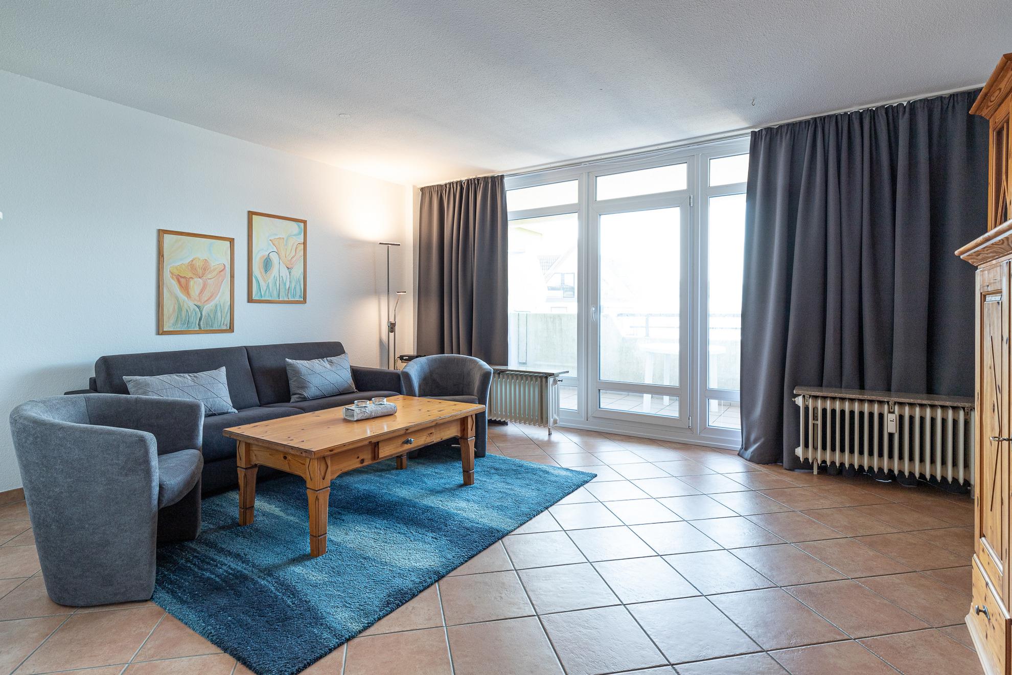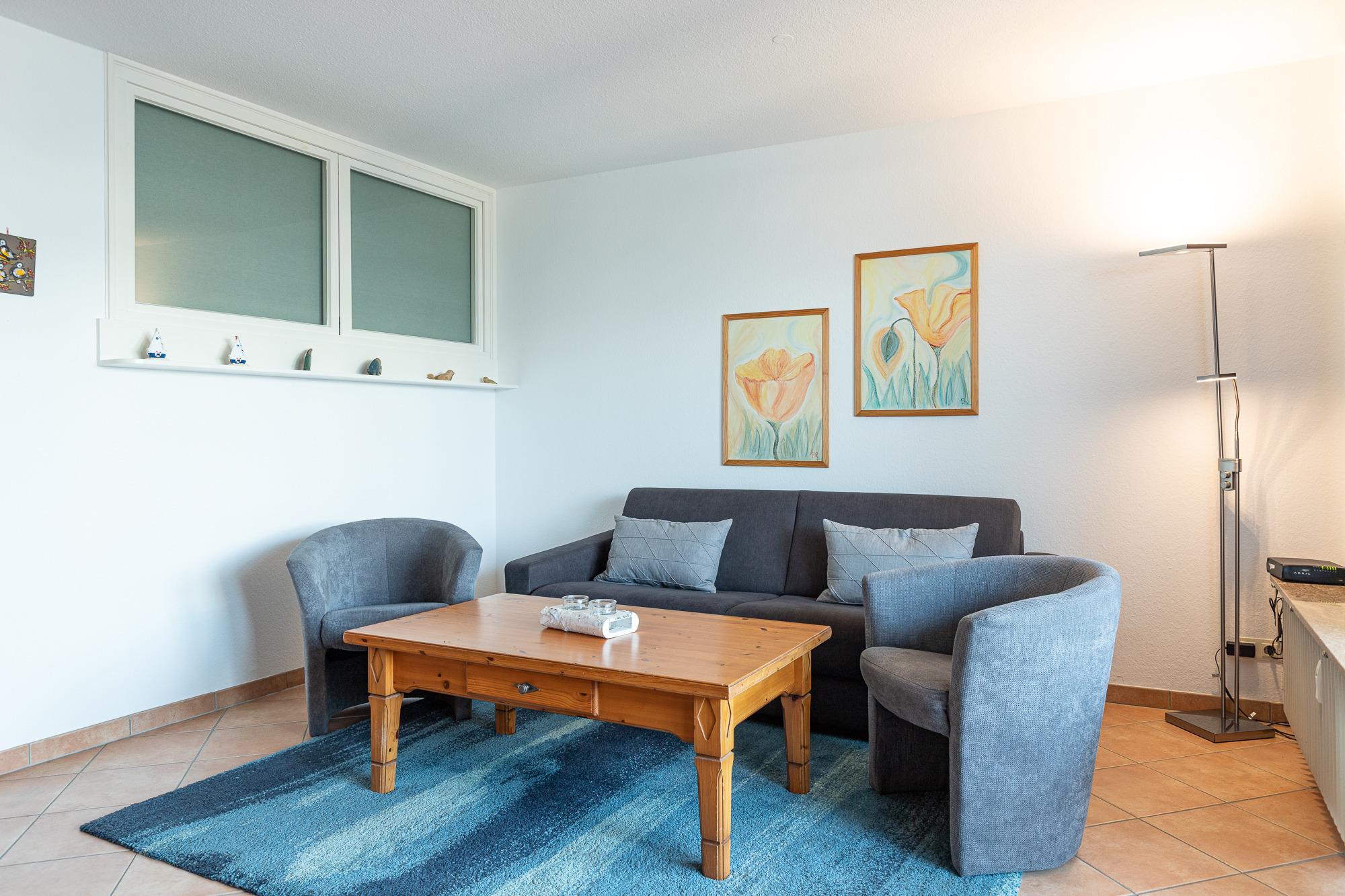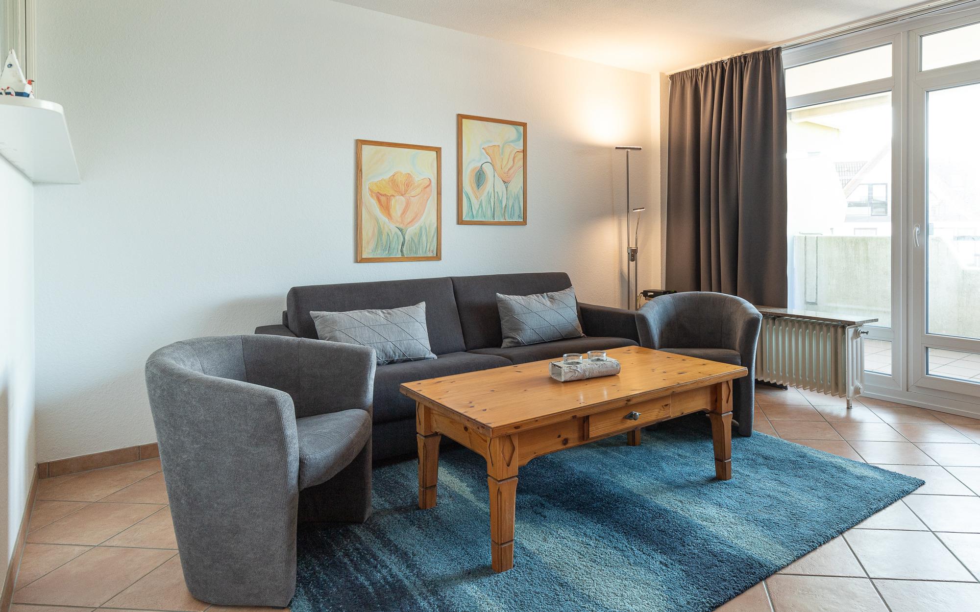 Der Wohnbereich ist offen gestaltet und freundlich eingerichtet. Durch die Fensterfront gelangt viel Tageslicht in den Raum, gleichzeitig genießen Sie einen Blick Richtung Nordsee. Der kombinierte Wohn- und Schlafbereich bietet Platz für entspannte Stunden nach einem Strandspaziergang und lässt sich am Abend unkompliziert in einen zusätzlichen Schlafbereich verwandeln.