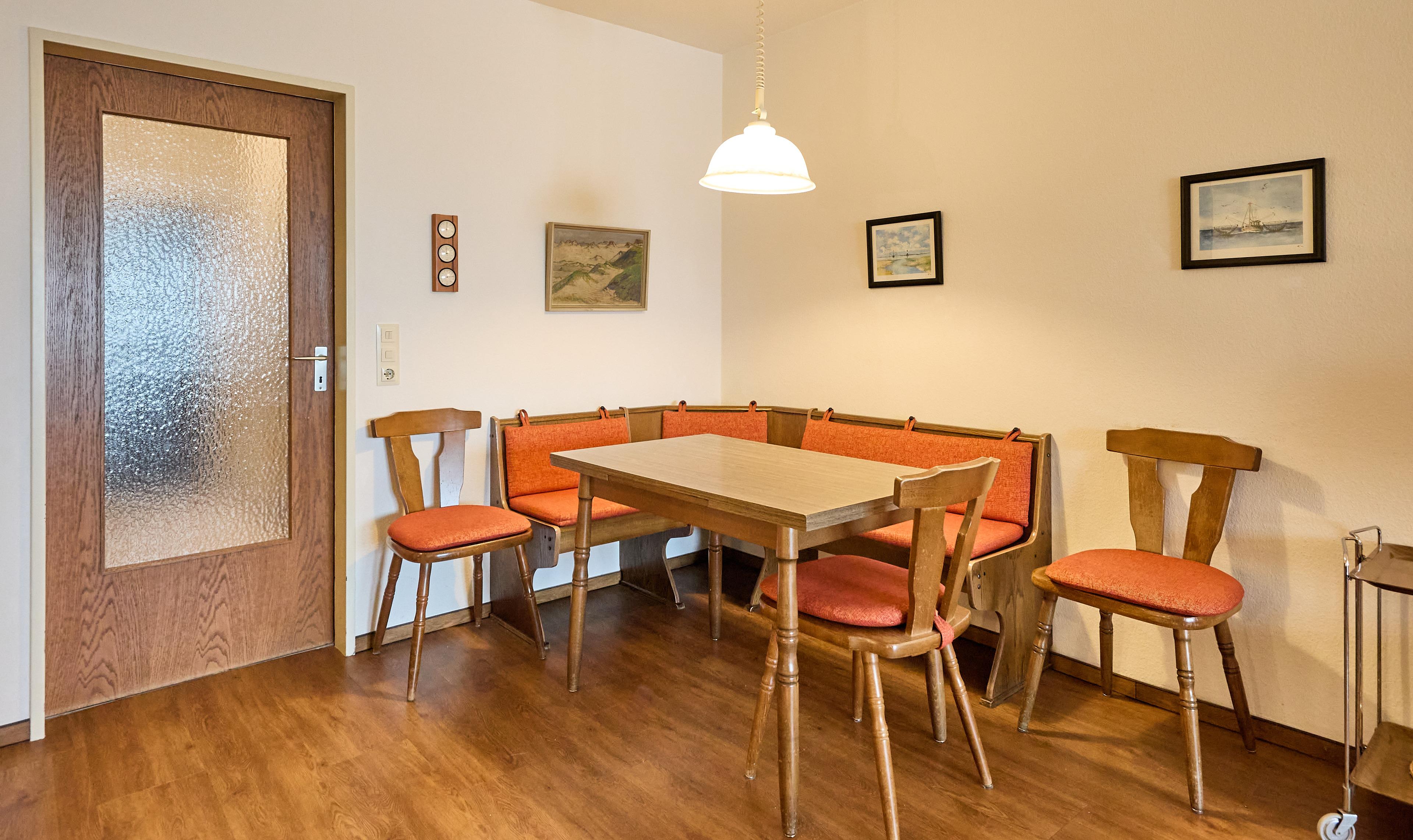 Die großzügige Einbauküche ist praktisch ausgestattet und bietet ausreichend Platz, um Mahlzeiten gemeinsam zuzubereiten. Der angrenzende Essbereich fügt sich harmonisch in den Wohnraum ein und eignet sich gut für gemeinsame Mahlzeiten oder einen entspannten Start in den Tag.