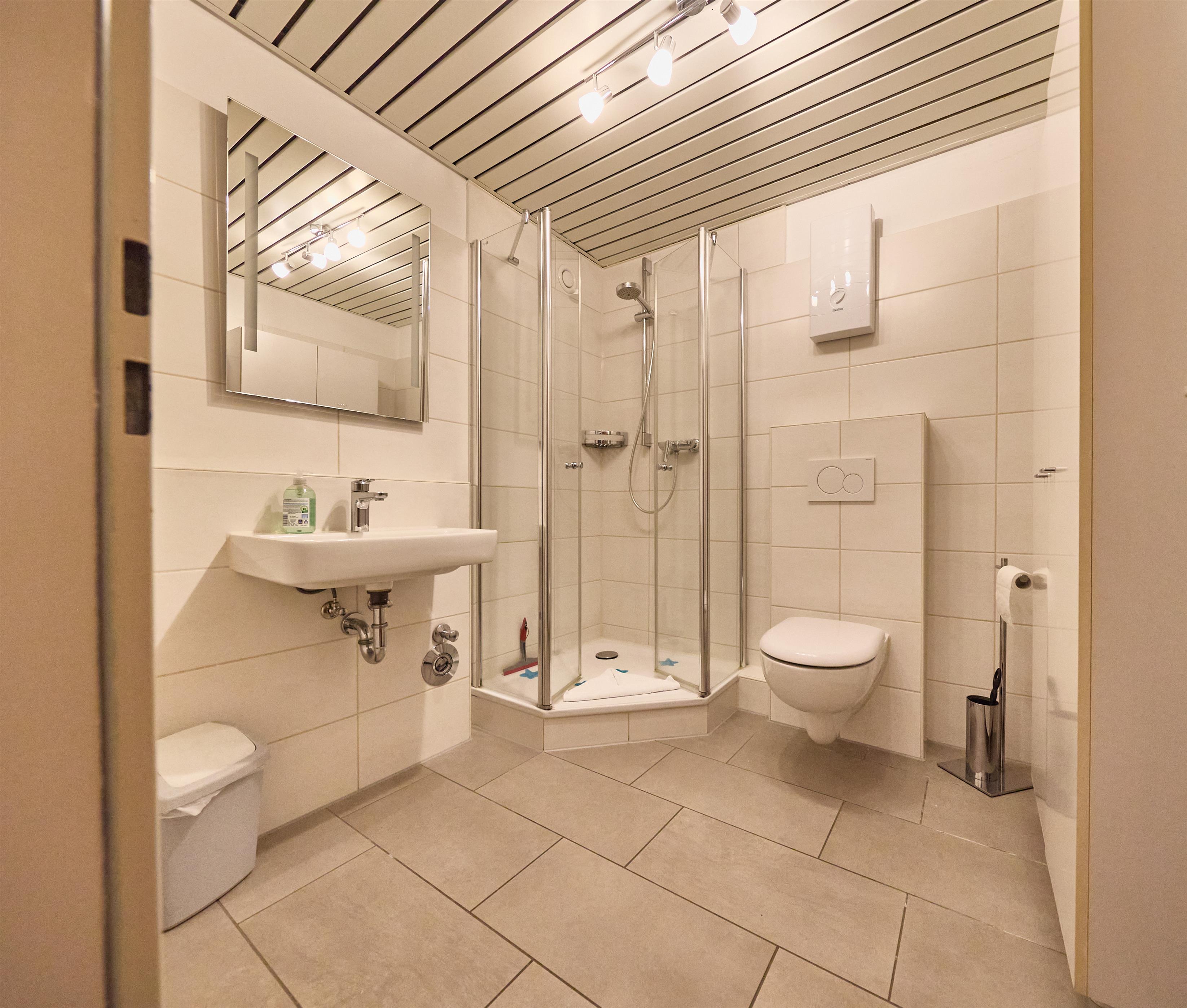 Das freundlich geflieste Duschbad ist mit einer geräumigen Dusche, Waschbecken und WC ausgestattet und bietet ausreichend Platz für den täglichen Komfort.