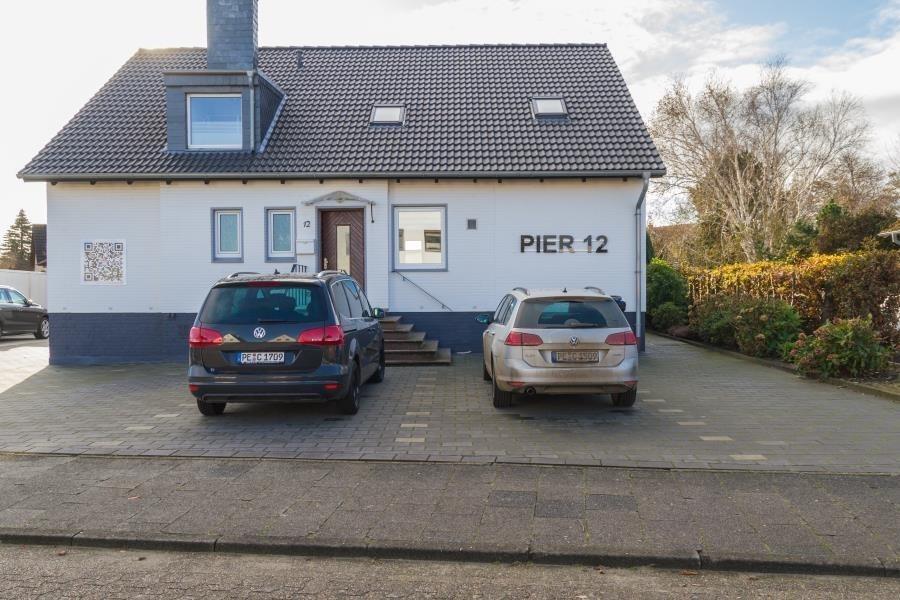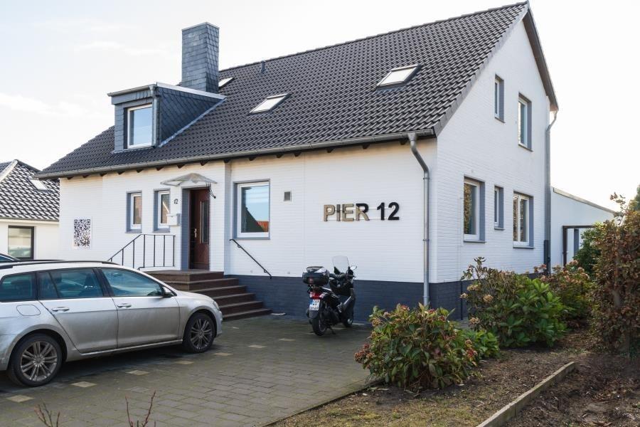 Pier 12 - Ferienwohnung Nr. 3 im haus Pier 12. Die Wohnung ist für max. 4 Personen ausgelegt. Das Schlafzimmer ist mit zwei Einzelbetten, die zu einem Doppelbett zusammenschiebbar sind, ausgestattet. Im Wohnraum ist noch eine Boxspringschlafcouch für 2 Personen vorhanden. Das Wohnzimmer verfügt über eine gemütliche Sitzecke und einen LED Flat-Screen TV sowie eine offene, voll ausgestattete, Küche mit Spülmaschine, Herd mit Cerankochfeld und Backofen, Mikrowelle, Toaster, Kaffeemaschine, Wasserkocher und Geschirr. Der Wohnzimmertisch ist zu einem großzügigen Essplatz für bis zu vier Personen variabel umfunktionierbar. Das Tageslichtbad hat eine Dusche und WC. Weiterhin hat die Wohnung eine schöne große sonnige Terrasse mit Terrassenmöbeln und Blick in den Garten.