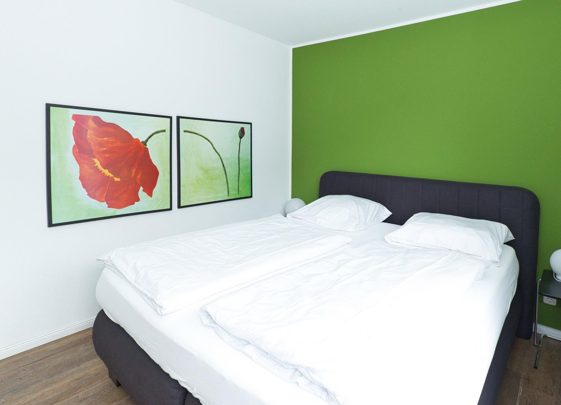 Willkommen im familienfreundlichen Ferienhaus Pier 12 in Duhnen, Am Dorfacker 12. Die Ferienwohnung Nr. 4 im Pier 12 bietet Platz für maximal 4 Personen. Sie verfügt über 2 Schlafzimmer, wobei im ersten Schlafzimmer ein komfortables Boxspring-Doppelbett zu finden ist und der zweite Raum mit zwei gemütlichen Einzelbetten ausgestattet ist.