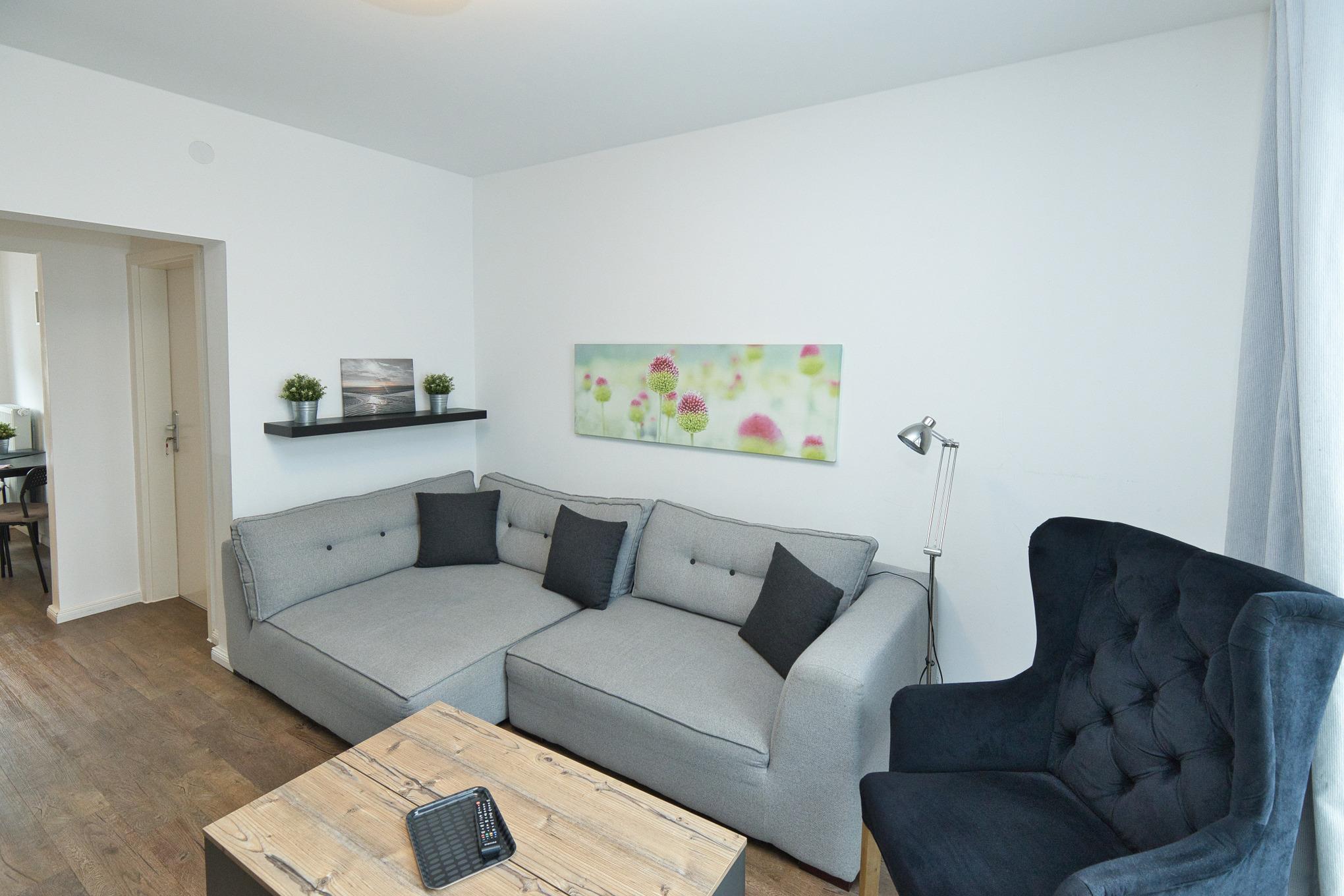 Die separate, voll ausgestattete Küche beinhaltet eine Spülmaschine, einen Herd mit Cerankochfeld und Backofen, eine Mikrowelle, einen Toaster, eine Kaffeemaschine, einen Wasserkocher und natürlich Geschirr. Ein Essplatz für bis zu 4 Personen steht in der Küche bereit. Im Wohnzimmer erwartet Sie eine behagliche Sitzecke mit einem LED Flat Screen TV. Das Tageslichtbad ist mit Dusche und WC ausgestattet, und eine sonnige Terrasse mit Terrassenmöbeln schließt direkt an den Wohnraum an.
