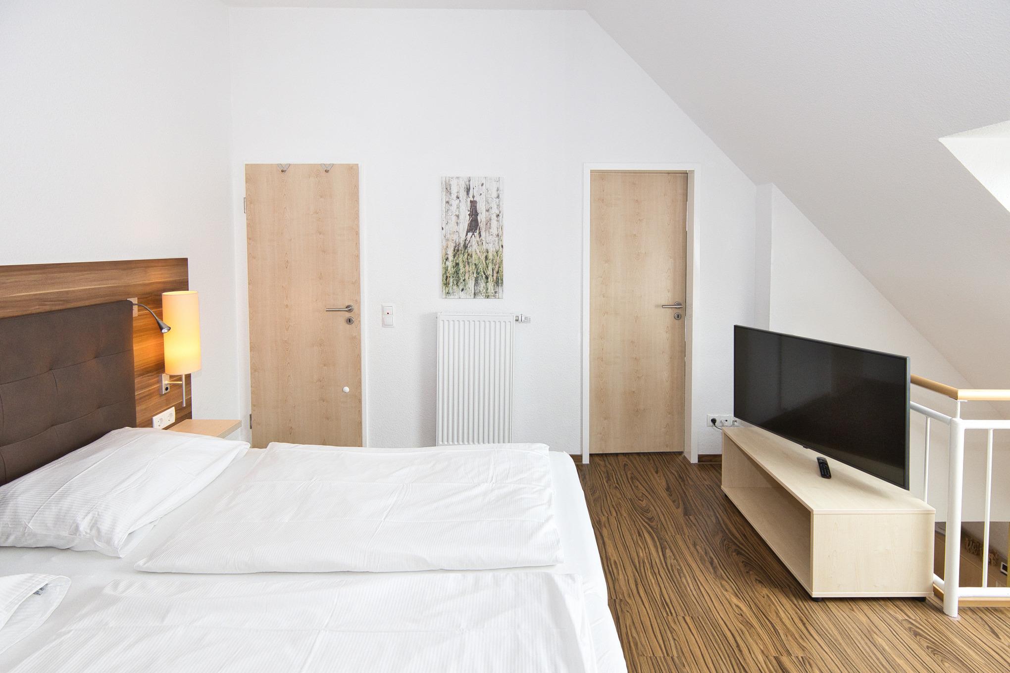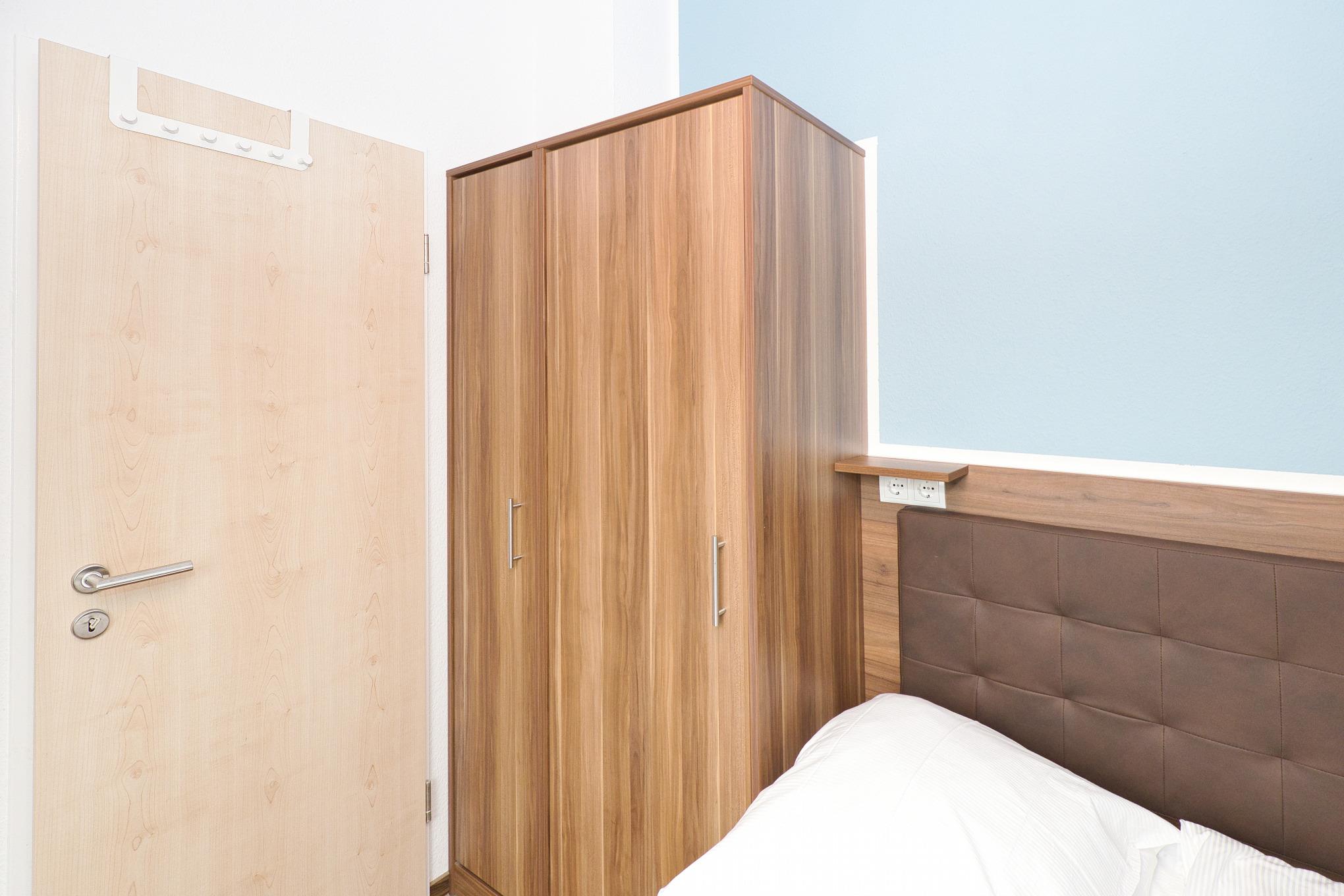 1x Schlafzimmer mit Tür, zwei maßgefertigten Einzelbetten, eigenem TV, Leselampen und Steckdosen direkt am Bett