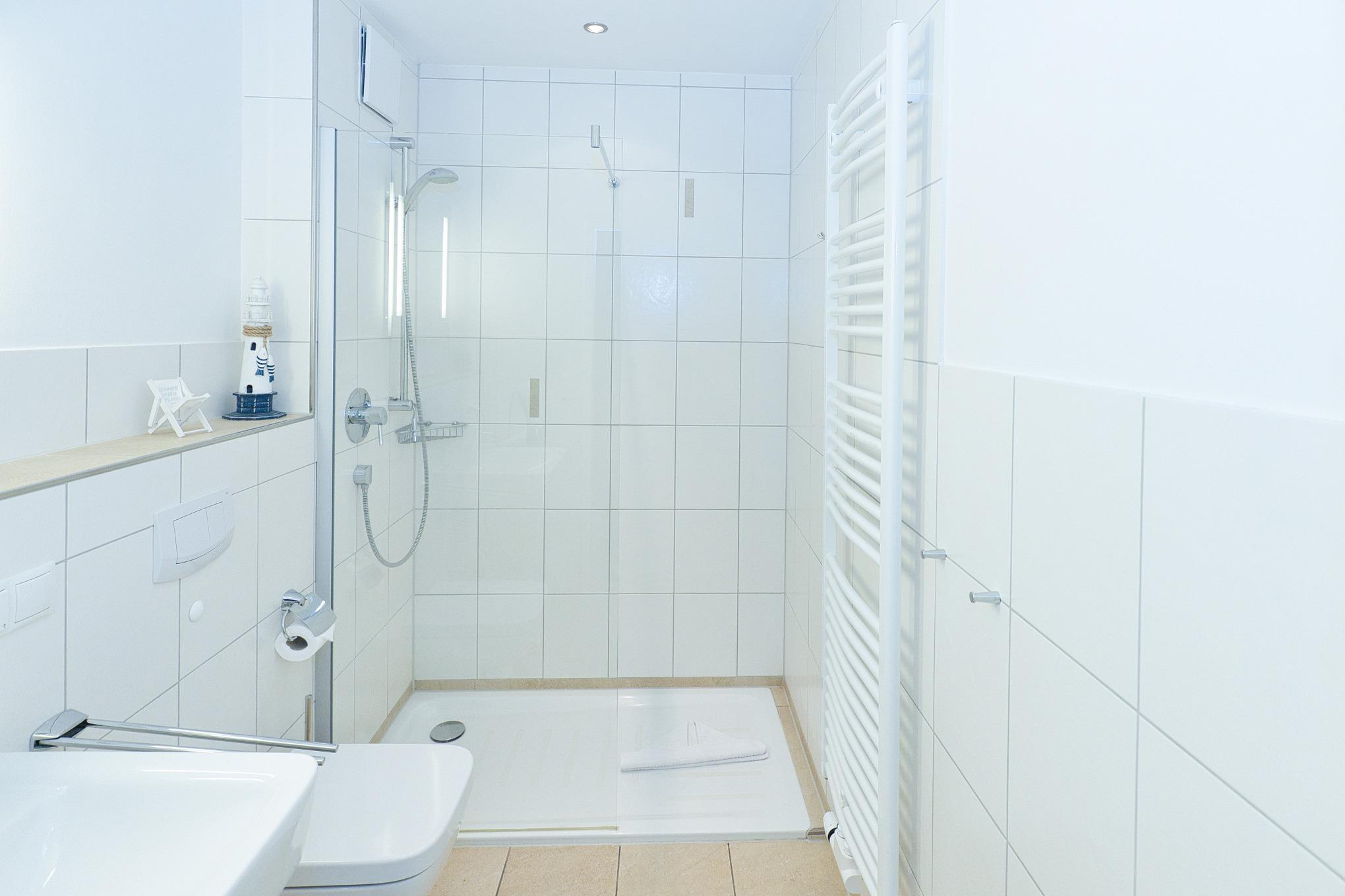 Zwei moderne Badezimmer mit Dusche und WC – eines unten (bodengleich), eines oben