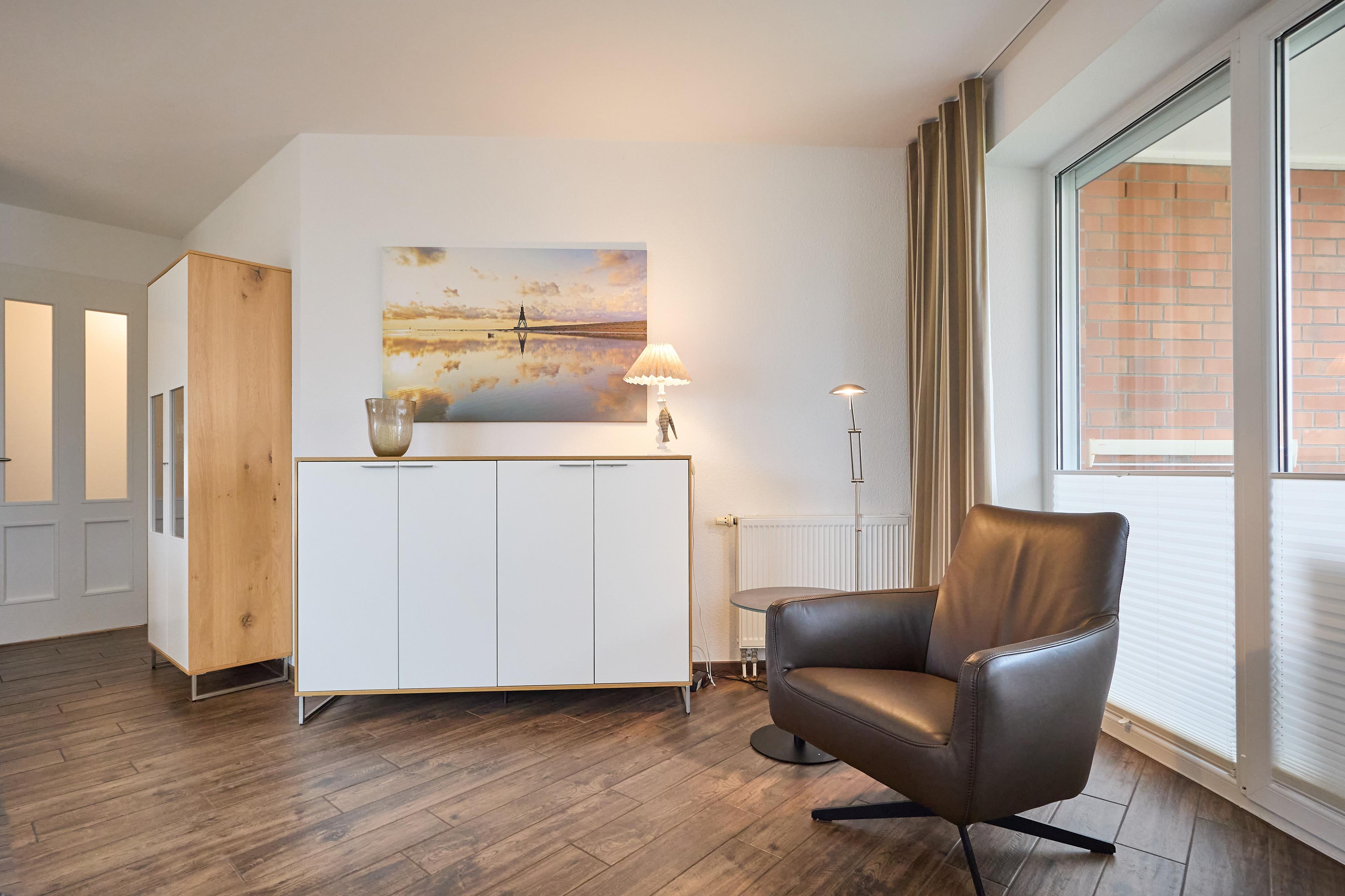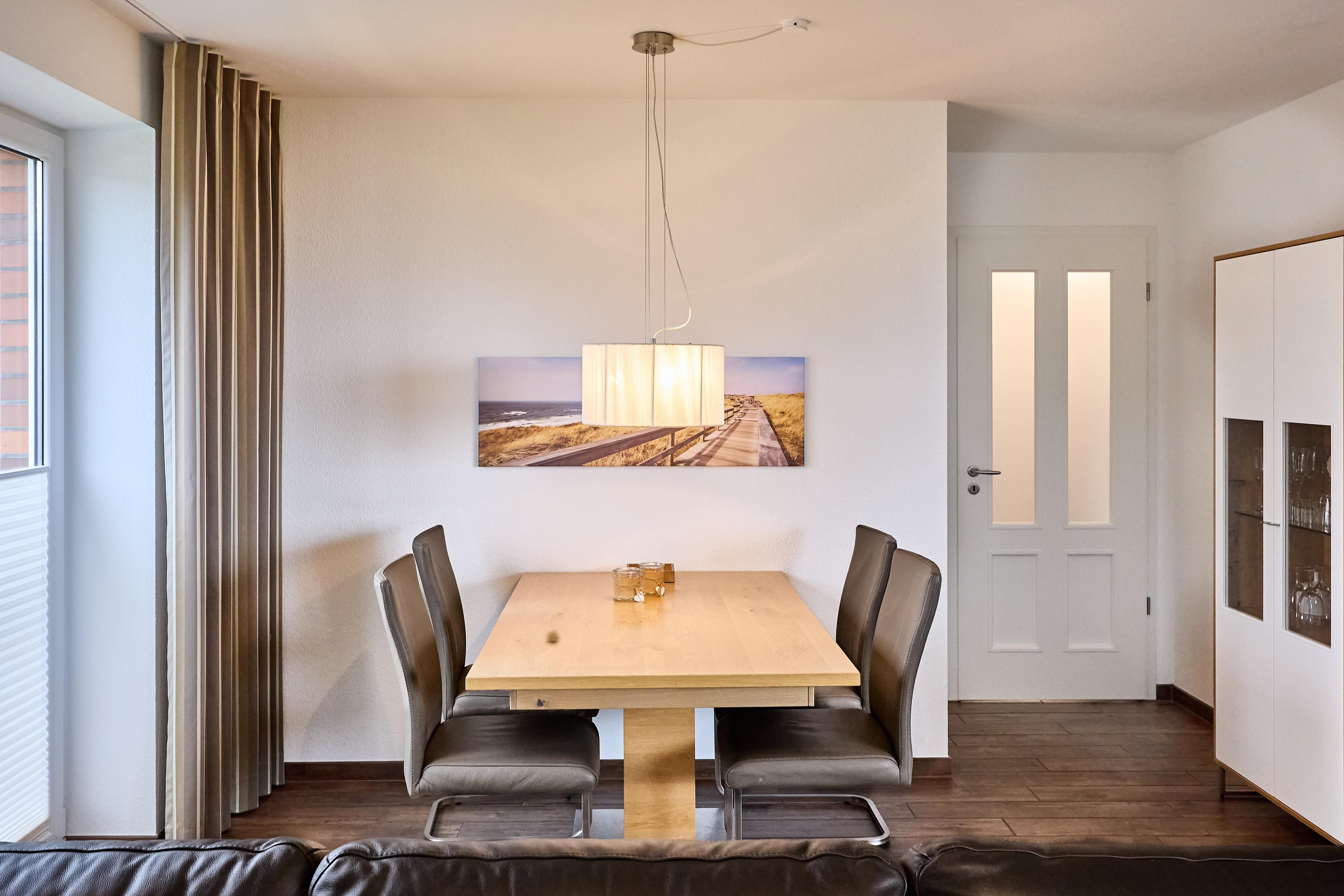 Angrenzend an die Küche lädt der helle Wohn- und Essbereich mit seinem Blick auf die Nordsee zum Verweilen ein. Ob bei einem Filmabend mit dem Fernseher und DVD-Player oder beim entspannten Surfen über das kostenfreie WLAN – hier lässt sich der Urlaub in vollen Zügen genießen.