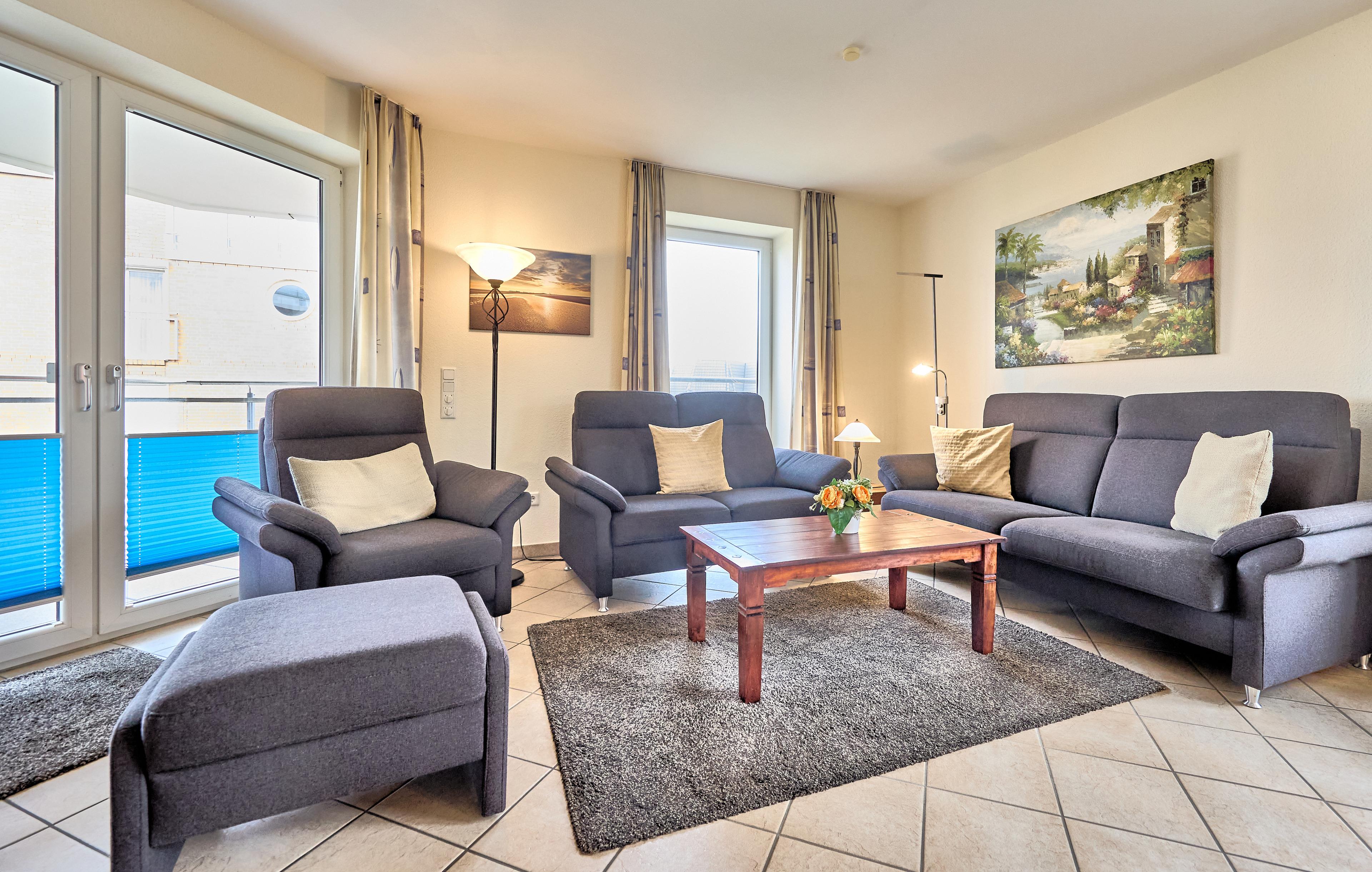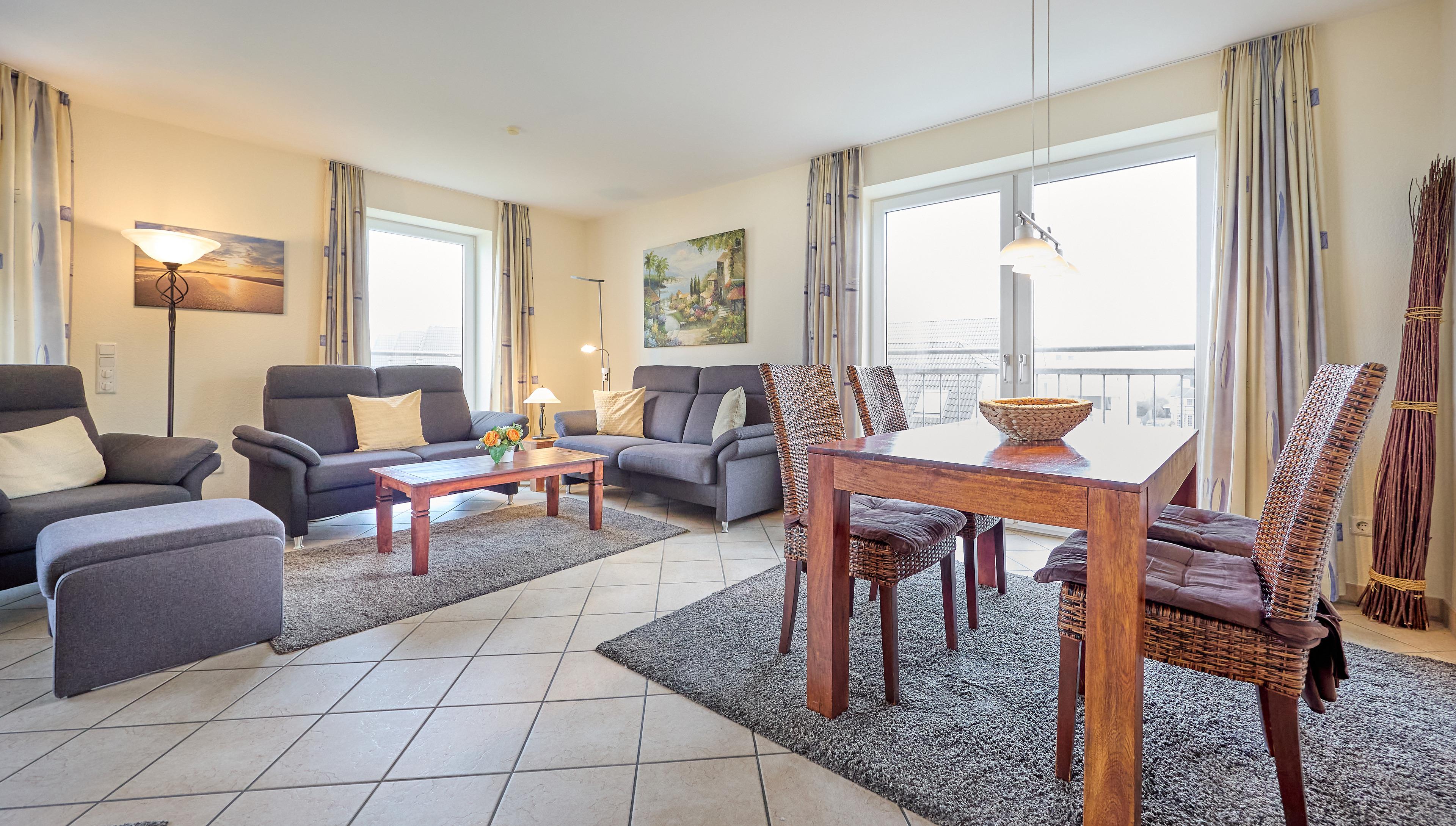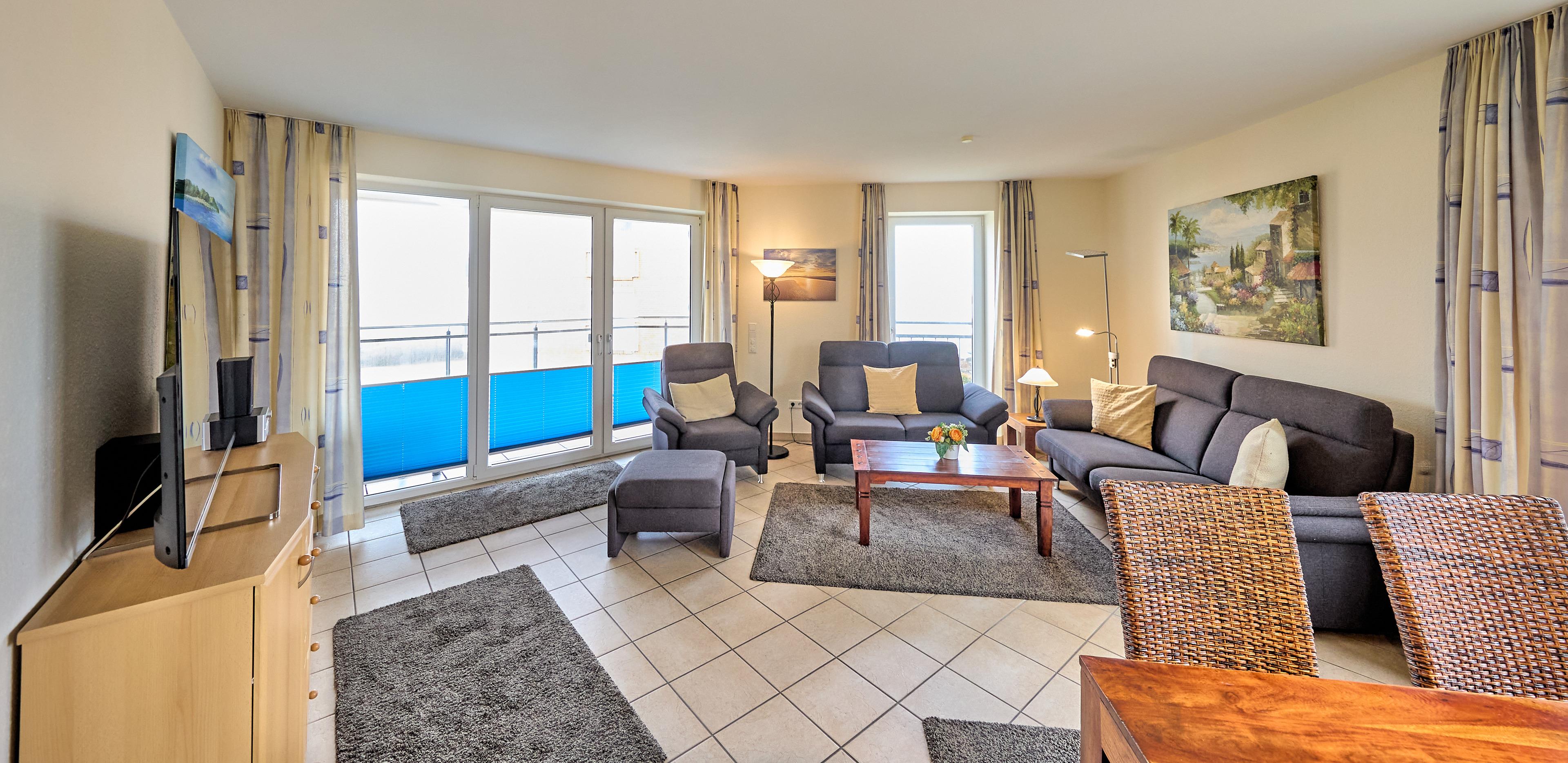 Die Wohnung besteht aus einem Eingangsbereich mit Flur und Garderobe, zwei Schlafzimmern (2x Komfort-Doppelbetten 180x200), einem Badezimmer mit WC, Dusche und Badewanne sowie einem Gäste-WC. Der große und helle Wohn- und Essbereich mit Fußbodenheizung bietet Zugang zum Balkon. Die separate Küche grenzt direkt an den Essbereich. Ein großer Esstisch und eine gemütliche Sofaecke mit verschiedenen Sitzmöglichkeiten bieten ausreichend Platz für alle Anwesenden. In einem Schlafzimmer befindet sich noch ein zweites TV Gerät.