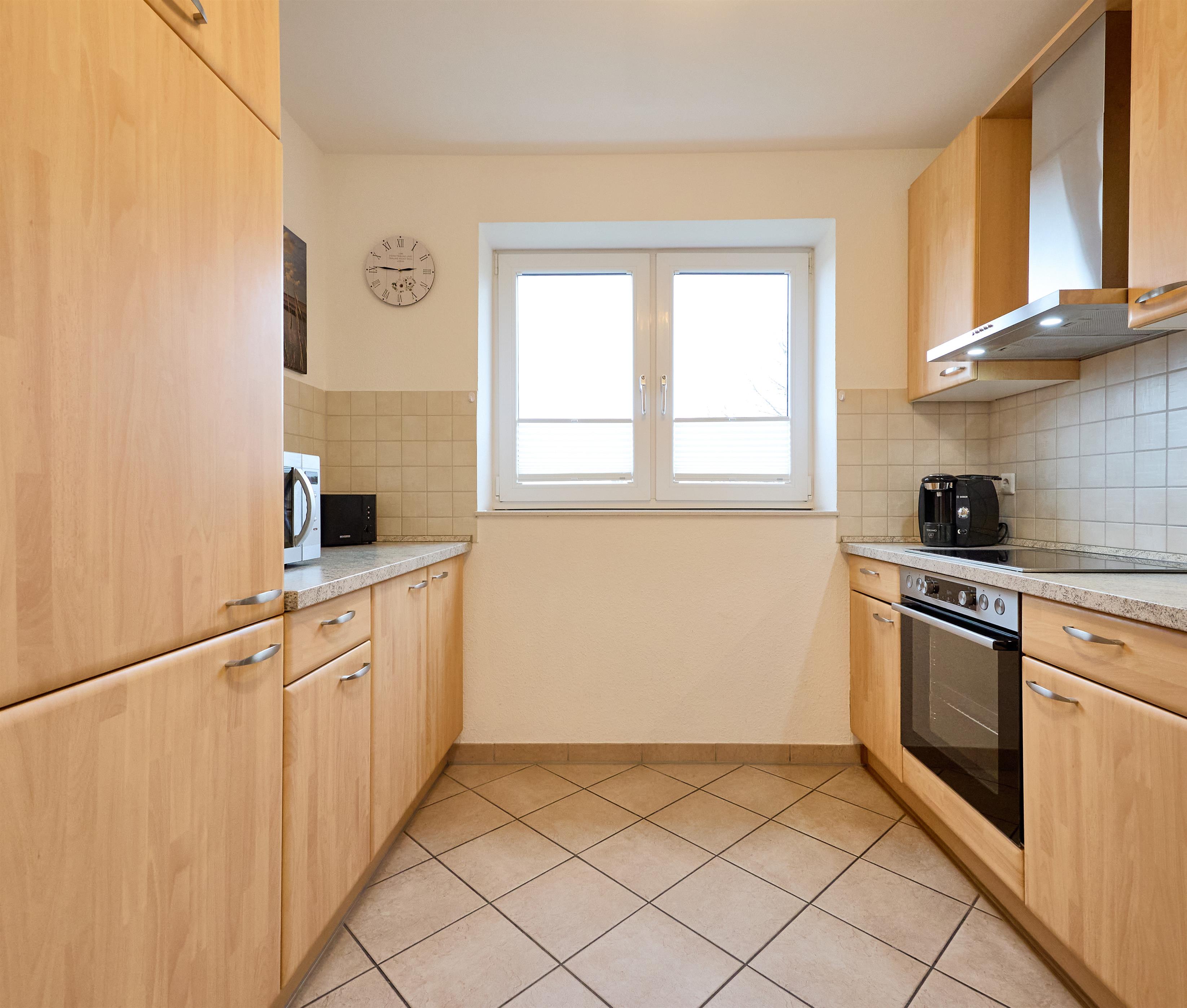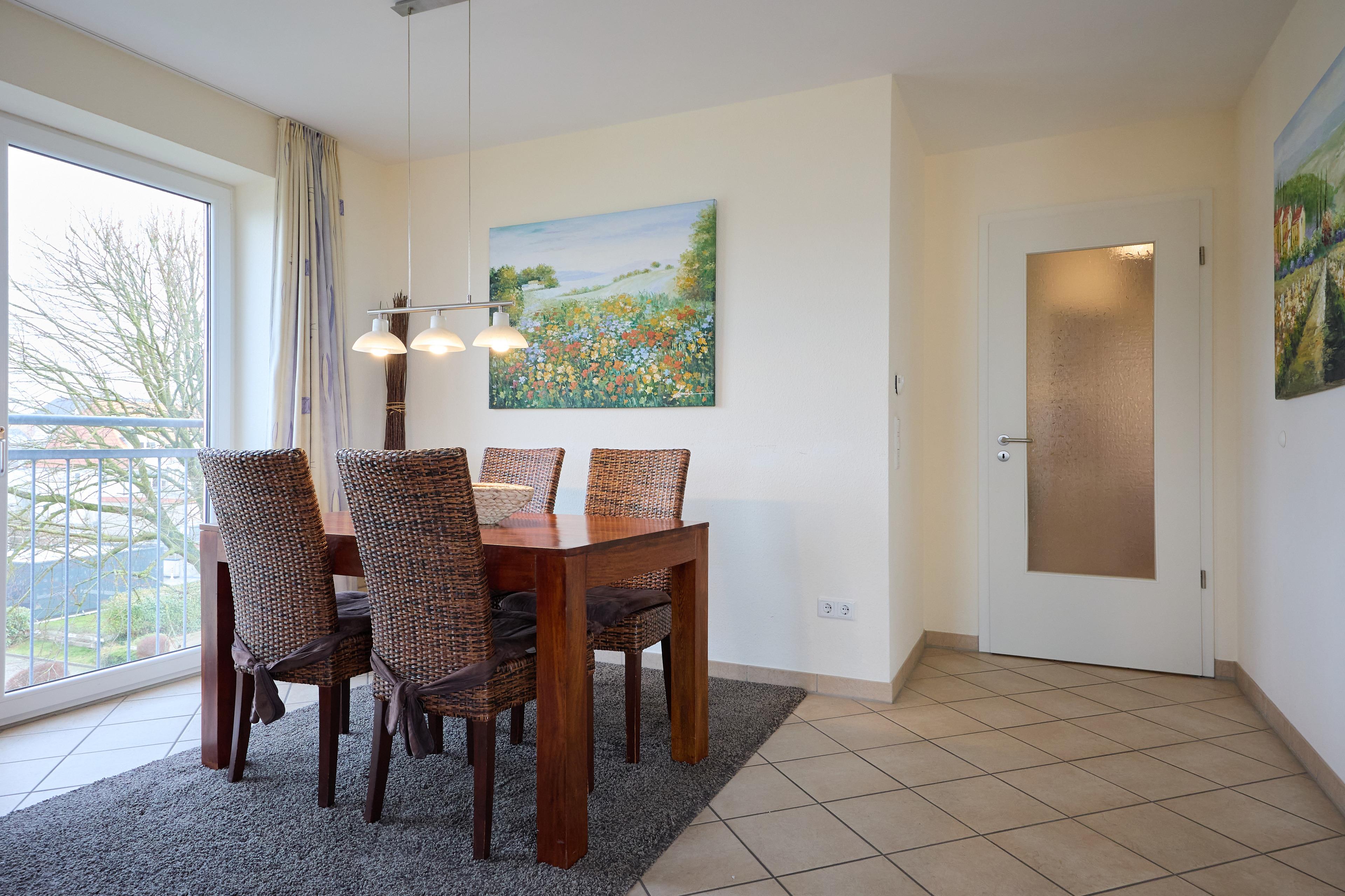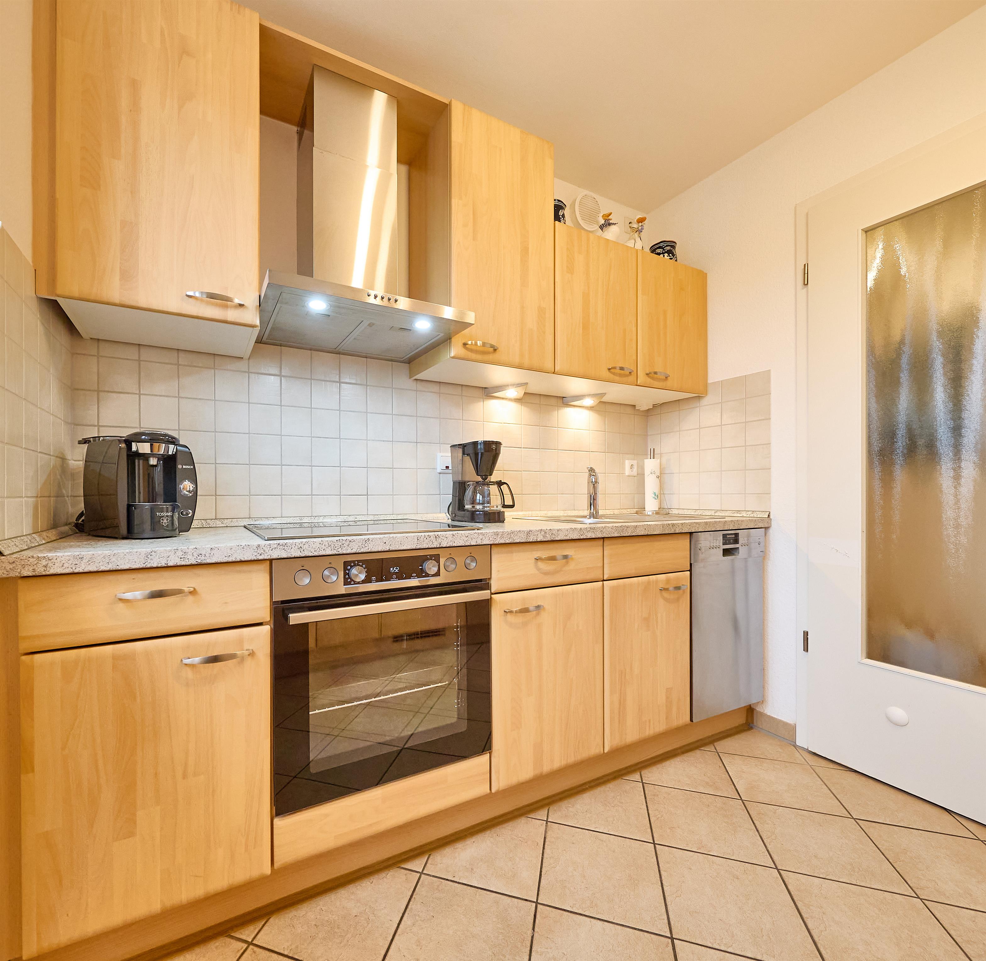 Die Wohnung besteht aus einem Eingangsbereich mit Flur und Garderobe, zwei Schlafzimmern (2x Komfort-Doppelbetten 180x200), einem Badezimmer mit WC, Dusche und Badewanne sowie einem Gäste-WC. Der große und helle Wohn- und Essbereich mit Fußbodenheizung bietet Zugang zum Balkon. Die separate Küche grenzt direkt an den Essbereich. Ein großer Esstisch und eine gemütliche Sofaecke mit verschiedenen Sitzmöglichkeiten bieten ausreichend Platz für alle Anwesenden. In einem Schlafzimmer befindet sich noch ein zweites TV Gerät.