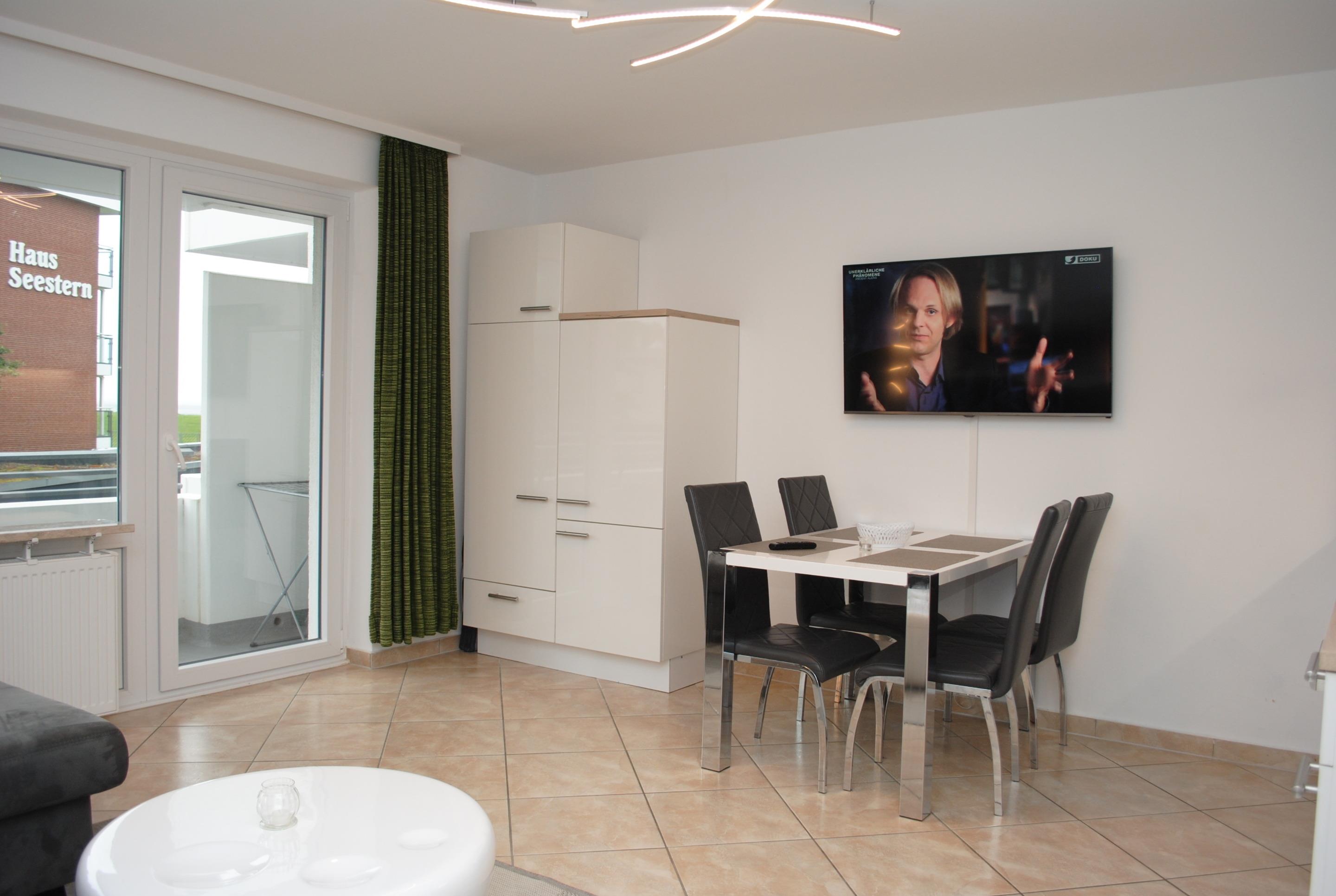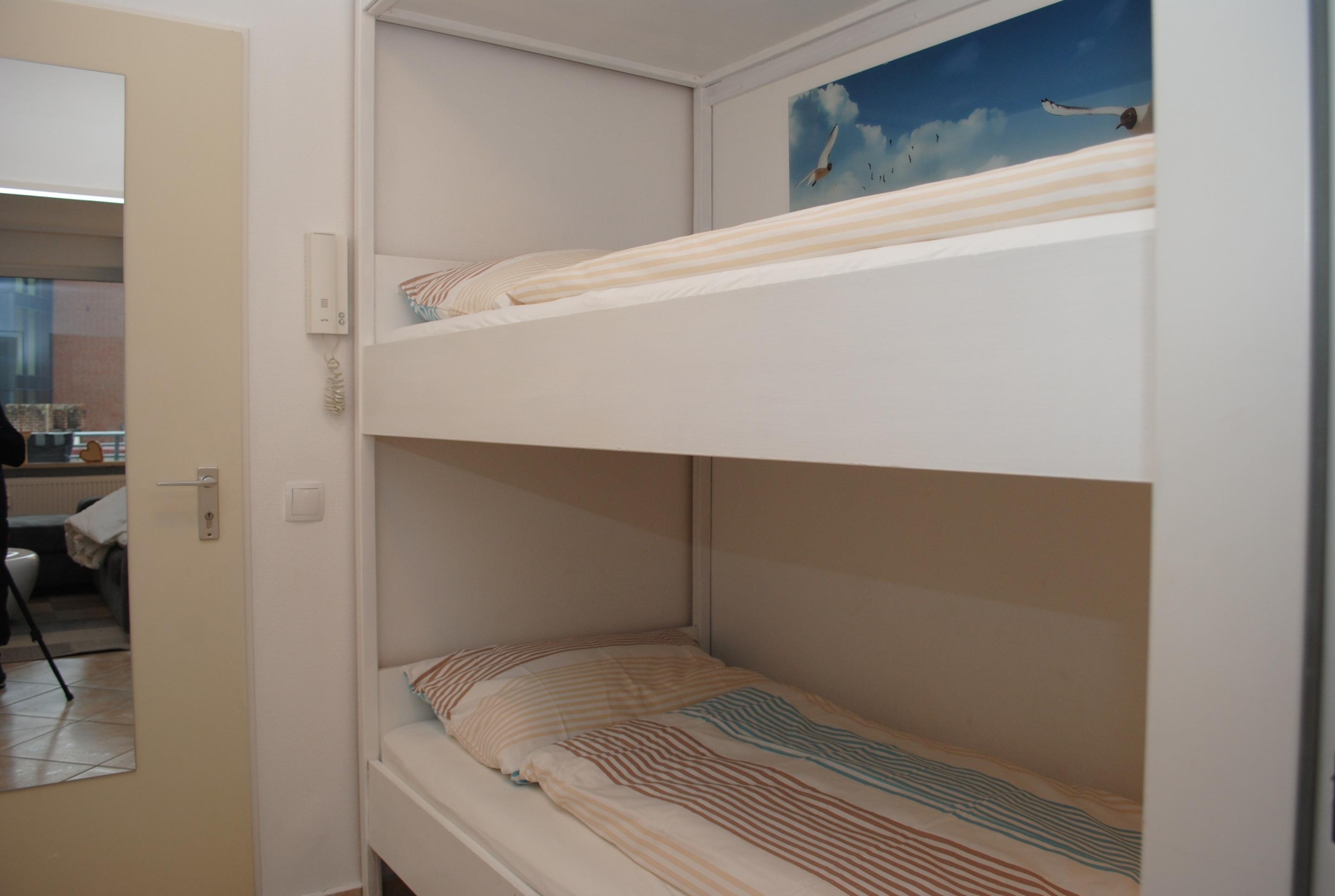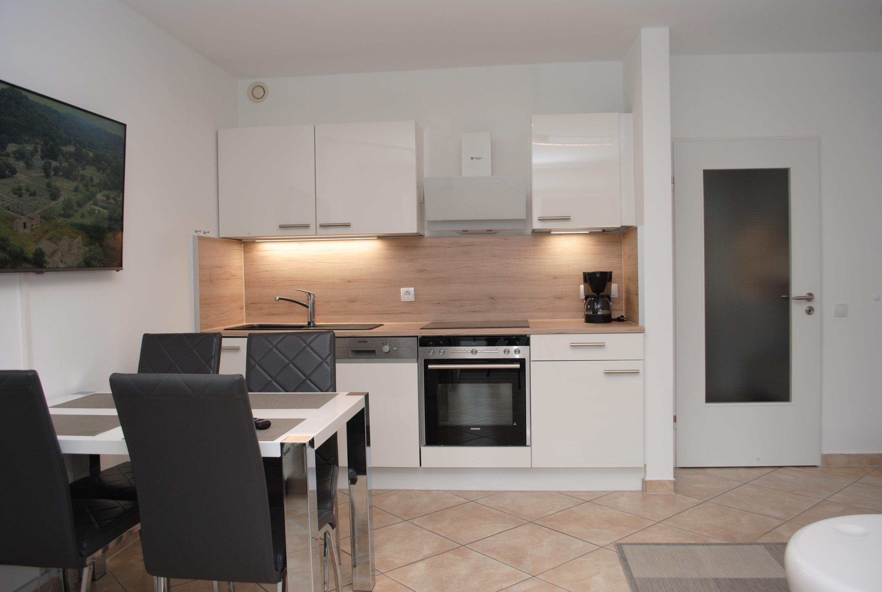 Das Apartment besteht aus einem Schlafzimmer mit 1 Doppelbett, einem Wohnbereich , einem zusätzlichem Etagenbett in einer Nische im Fluhr und einem Badezimmer mit Dusche sowie WC. Die Ferienwohnung beinhaltet eine voll Augestattete offene Küche.