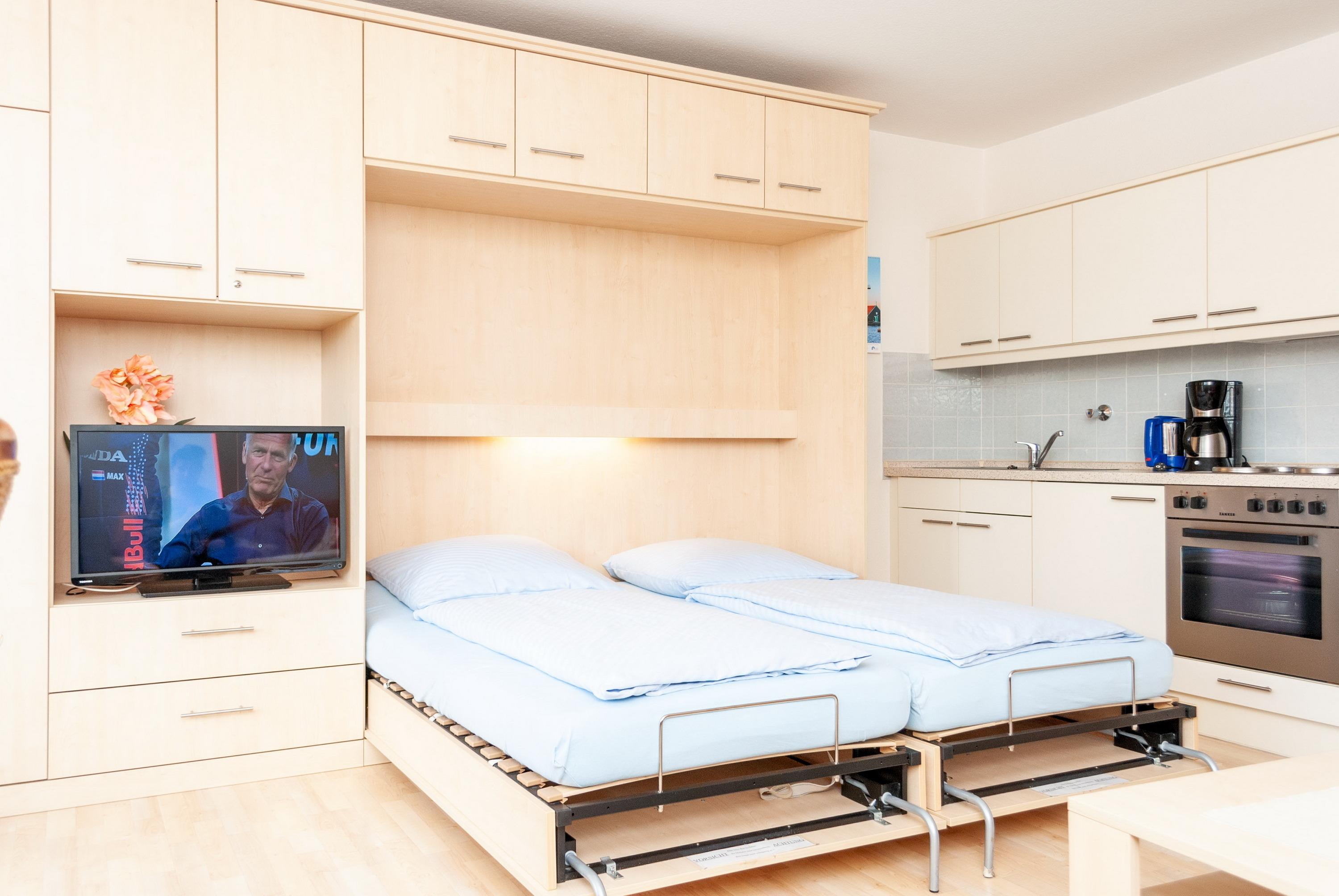 Das Apartment besteht aus einem Wohnbereich mit Schrankbett für 2 Personen, aus einem zusätzlichem Etagenbett in einer Nische im Flur und einem Badezimmer mit Dusche sowie WC. Die Ferienwohnung beinhaltet eine voll ausgestattete offene Küche.