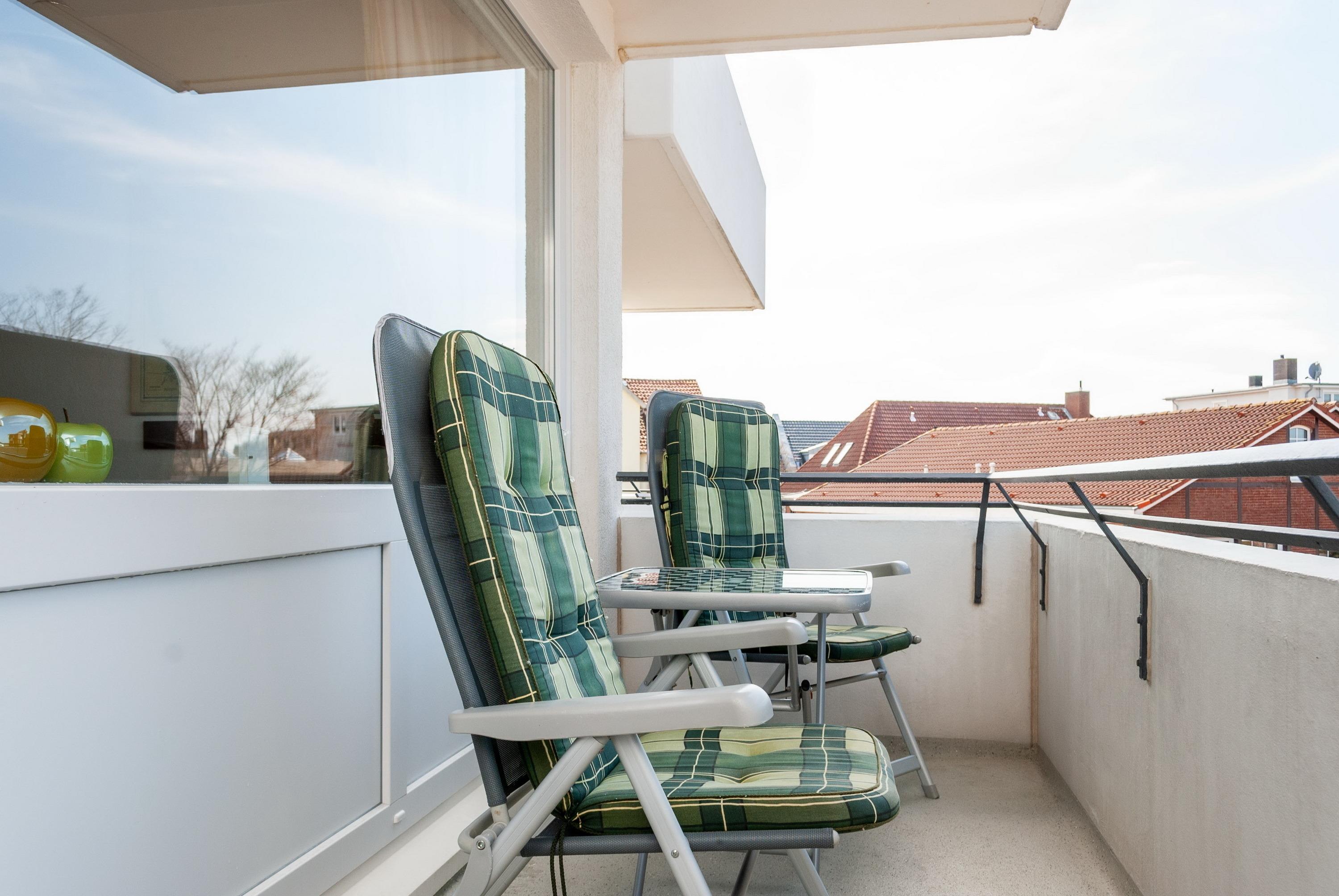 Das Apartment 202 ist ein 1-Raum-Apartment im 2. Obergeschoss für bis zu 4 Personen mit 40 qm. Der Westbalkon mit Meerblick bietet Ihnen vormittags Schatten und nachmittags Sonne.