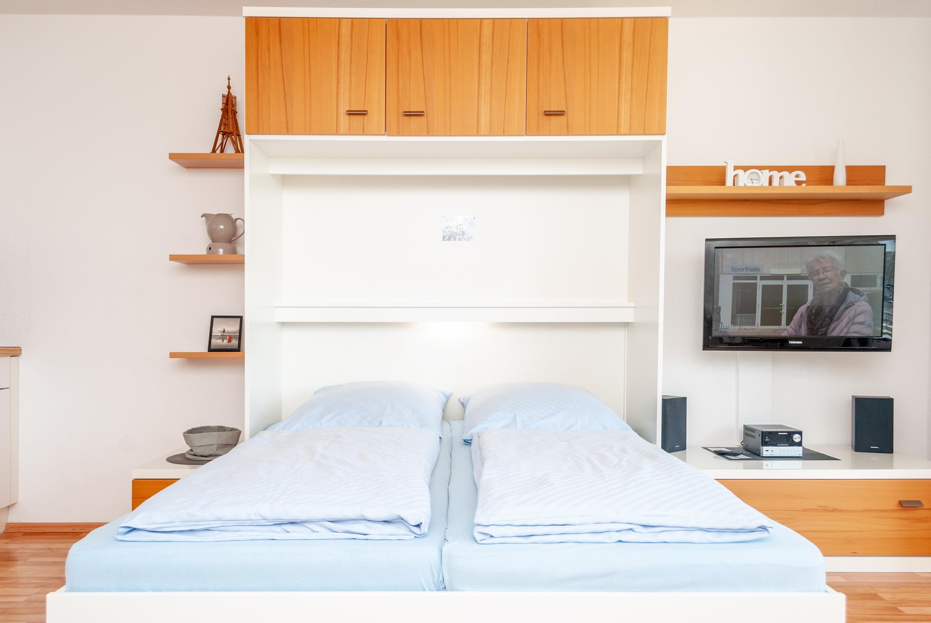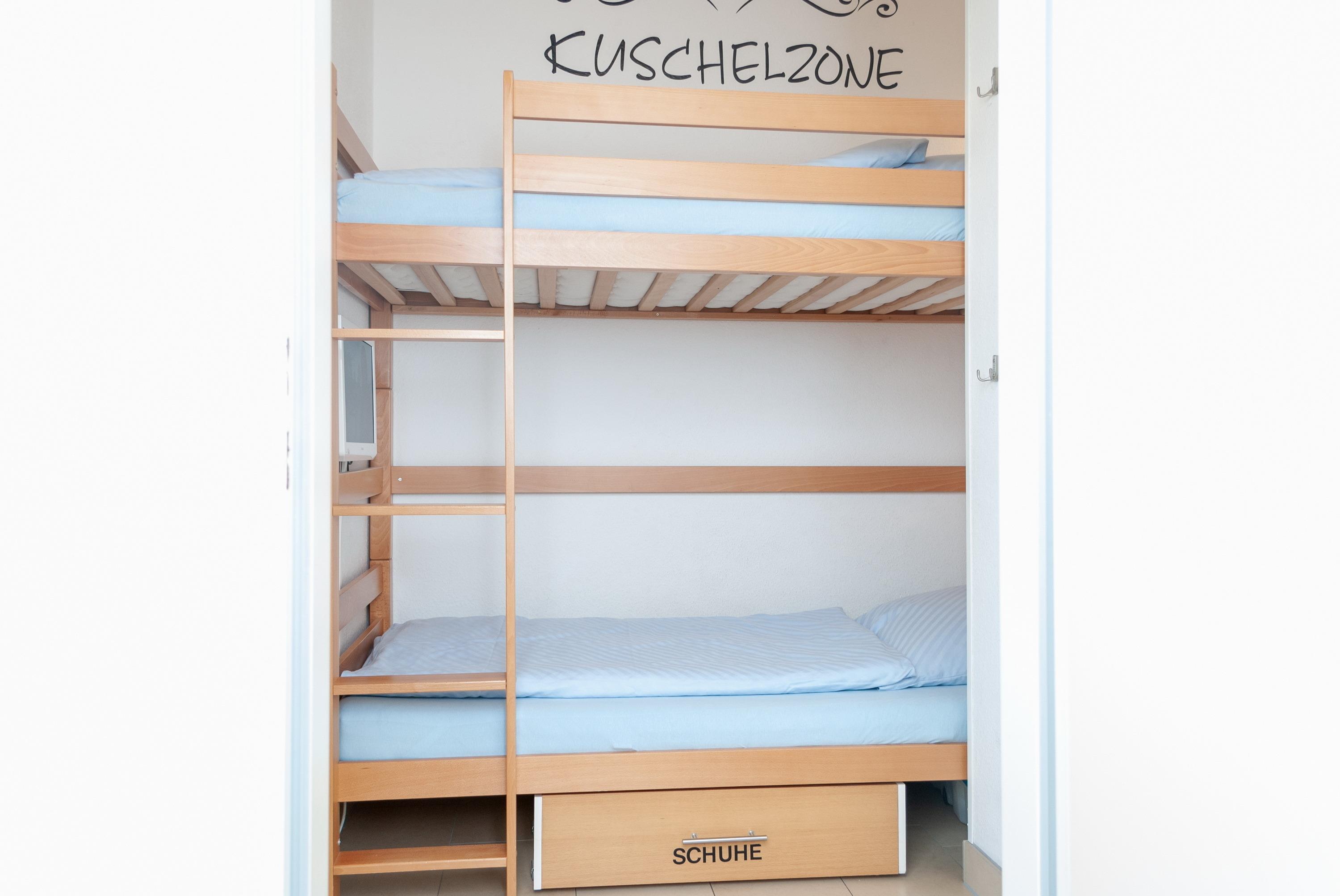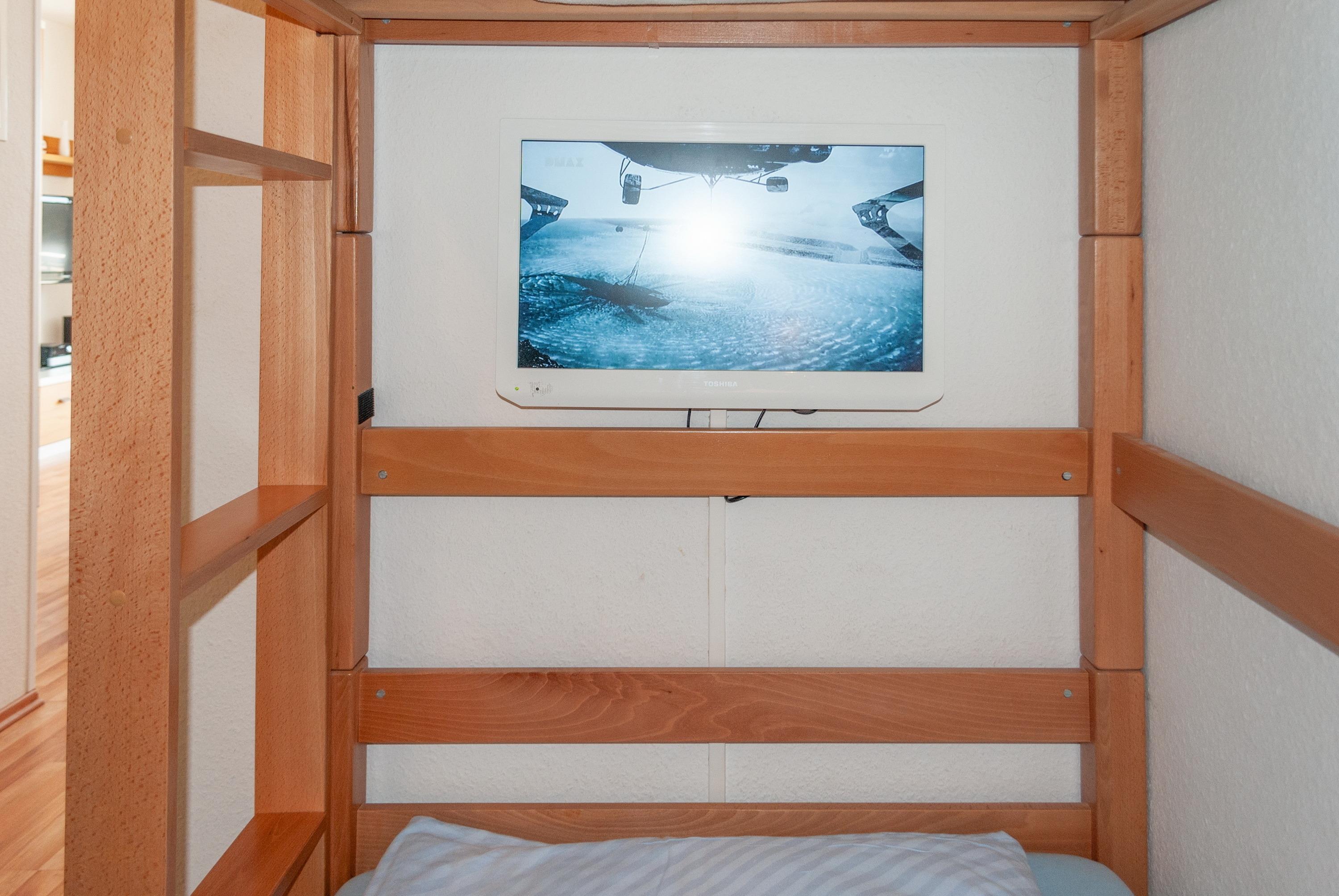Das Apartment besteht aus einem Wohnbereich mit Schrankbett für 2 Personen, und aus einem zusätzlichem Etagenbett in einer Nische im Flur, einem Badezimmer mit Dusche sowie WC. Die Ferienwohnung beinhaltet eine voll ausgestattete offene Küche.