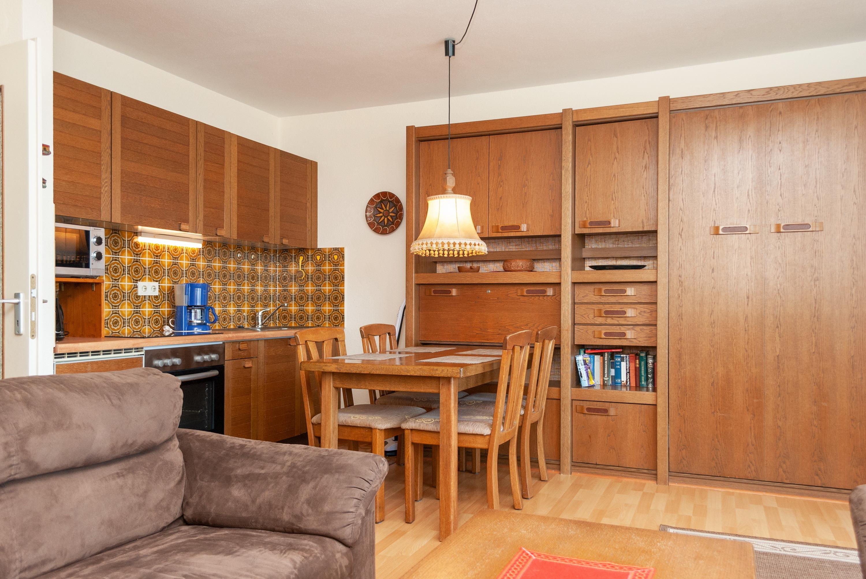 Das Apartment besteht aus einem Schlafzimmer mit 2 Einzelbetten, einem Wohnbereich mit zusätzlichem Schrankbett für 1 Person, einem Etagenbett für 1 Peson in einer Nische im Flur und einem Badezimmer mit Dusche sowie WC. Die Ferienwohnung beinhaltet eine gut ausgestattete offene Küche.