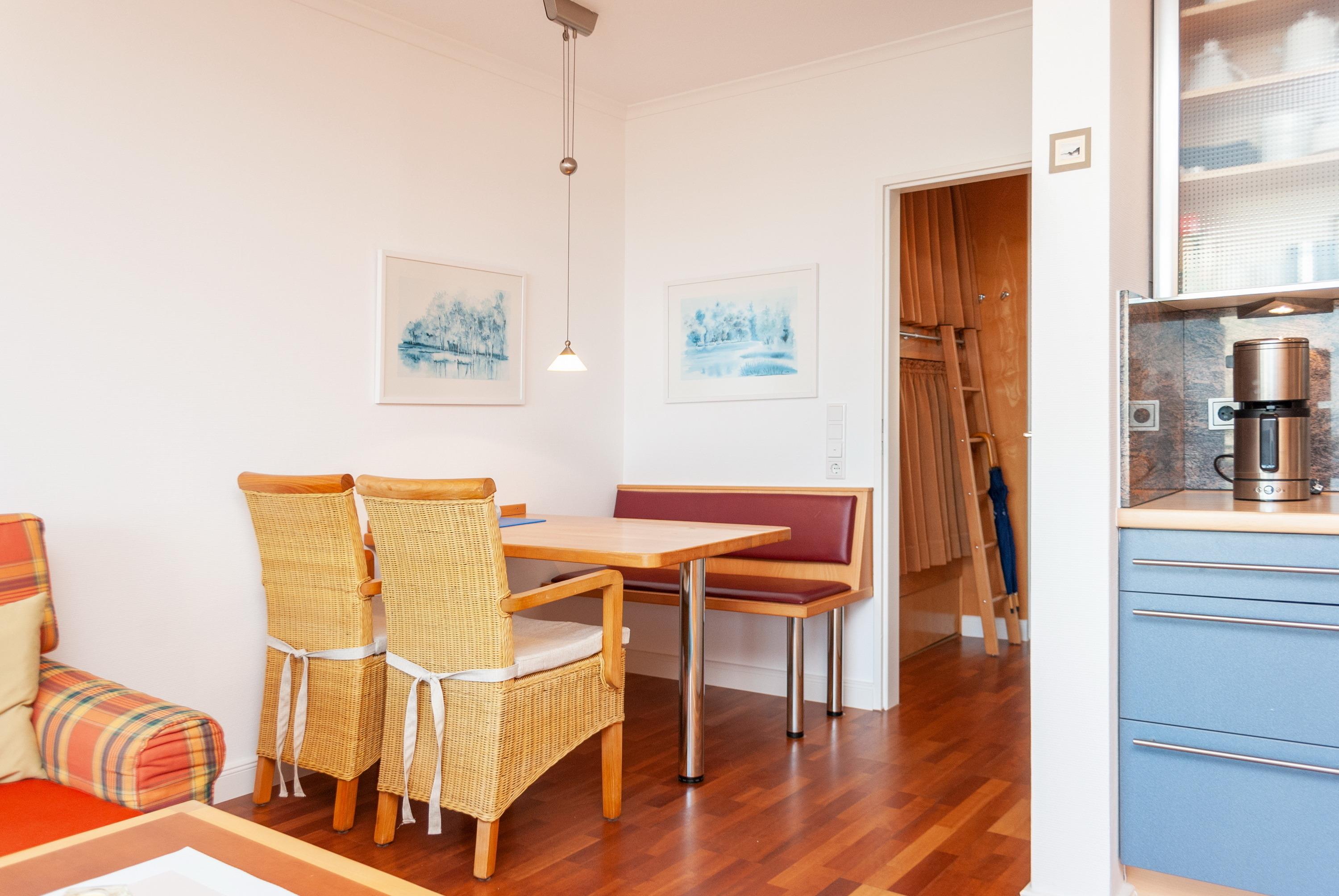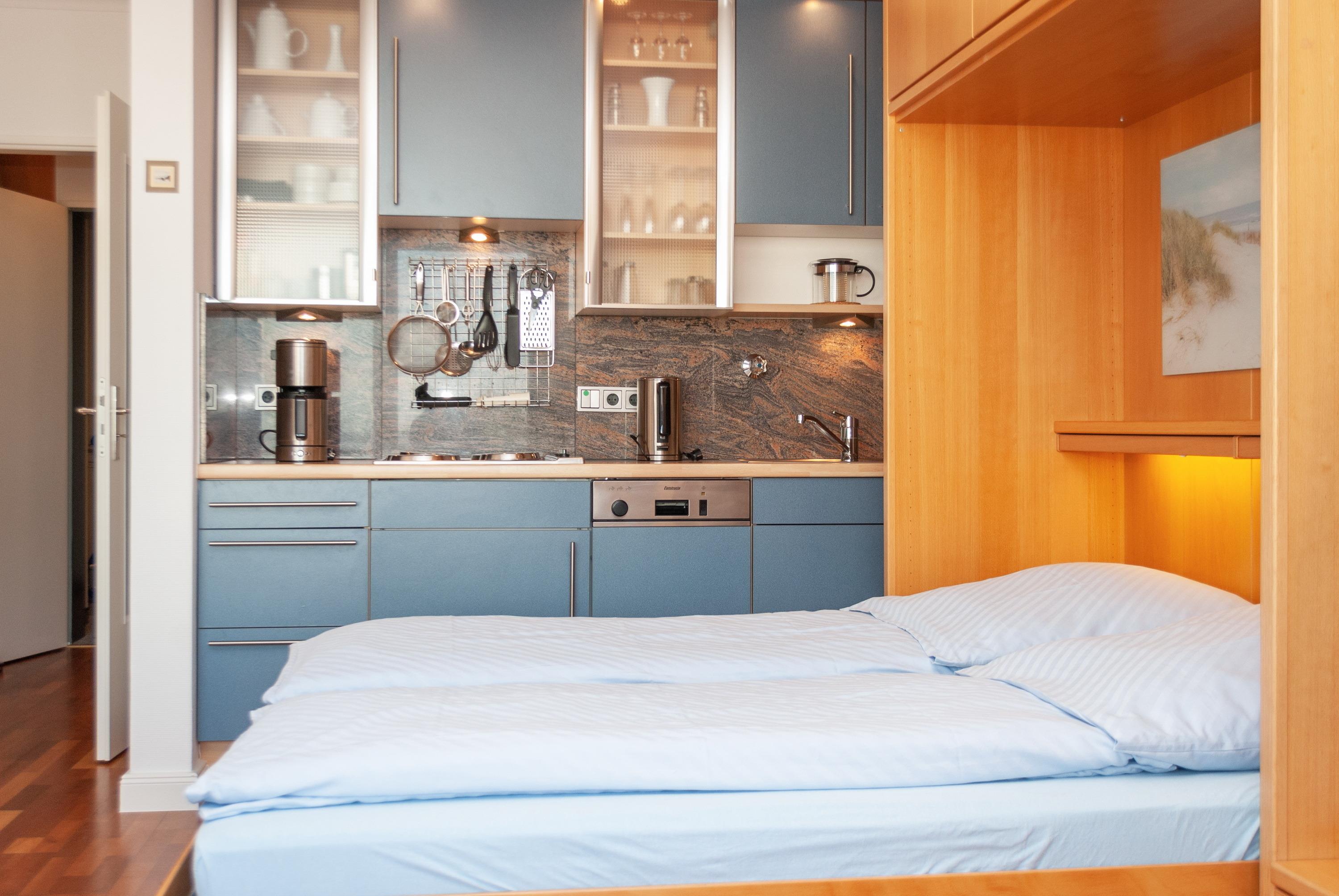 Das Apartment besteht aus einem Wohnbereich mit Schrankbett für 2 Personen, und einem zusätzlichem Etagenbett in einer Nische im Flur einem Badezimmer mit Dusche sowie WC. Die Ferienwohnung beinhaltet eine voll ausgestattete offene Küche.