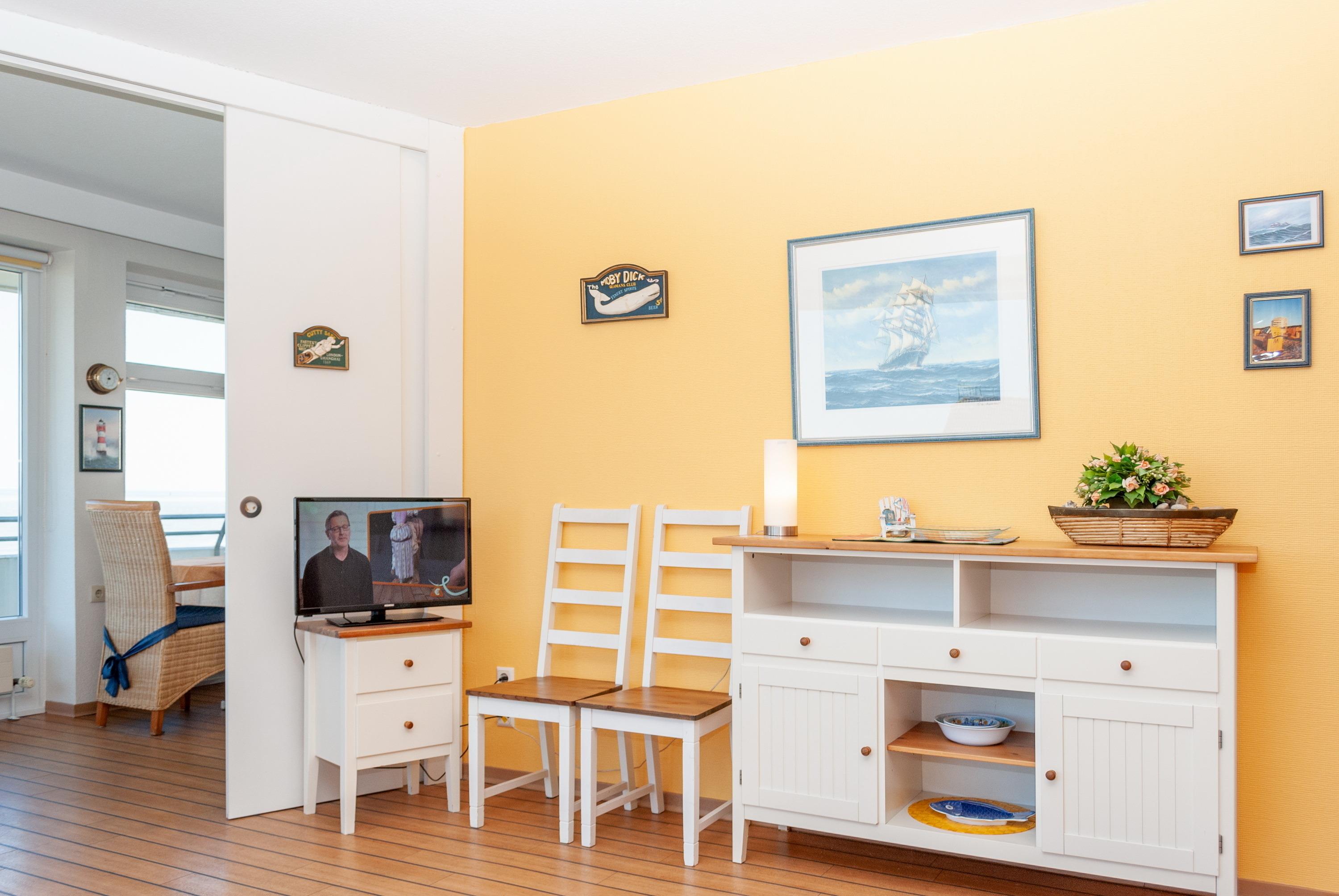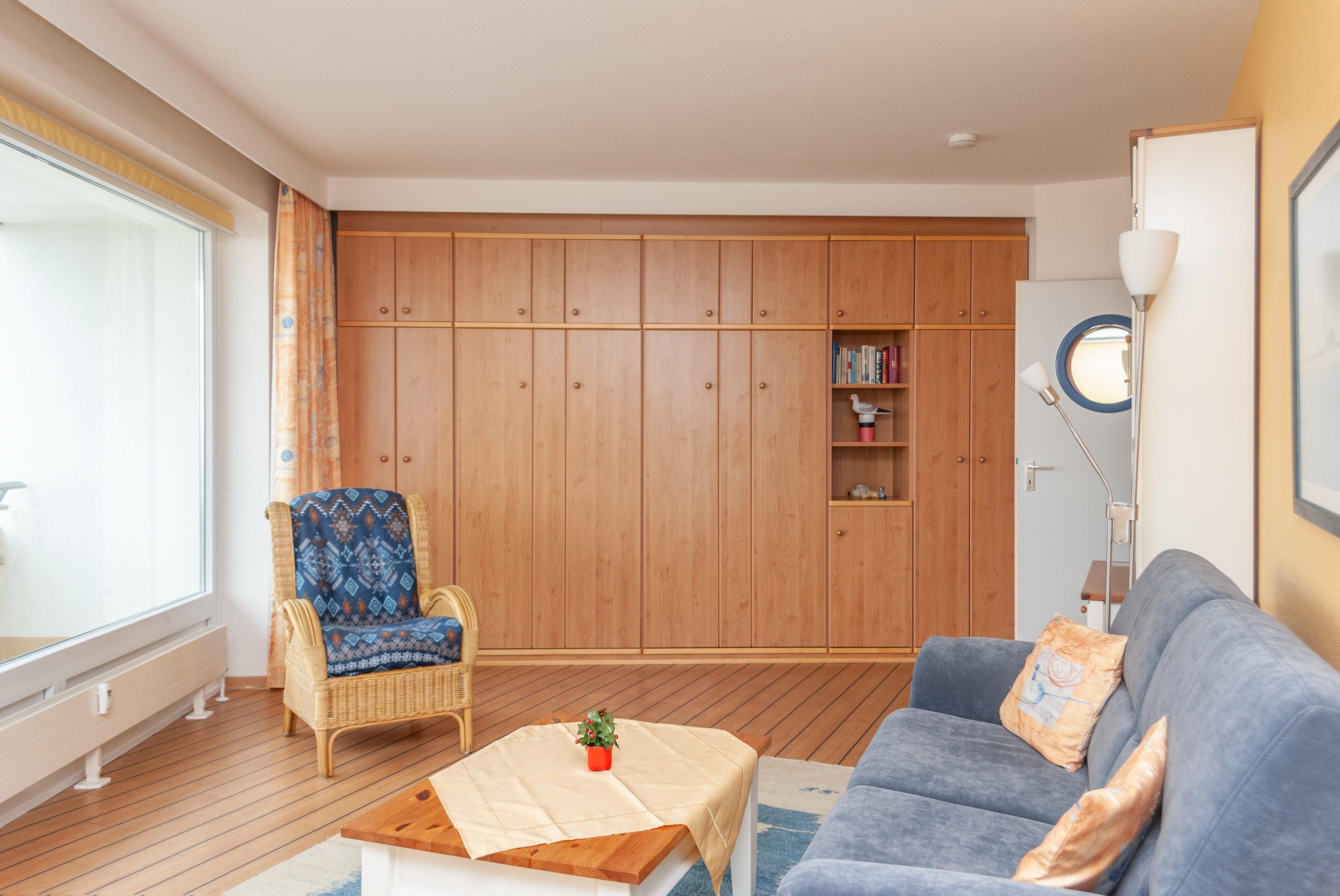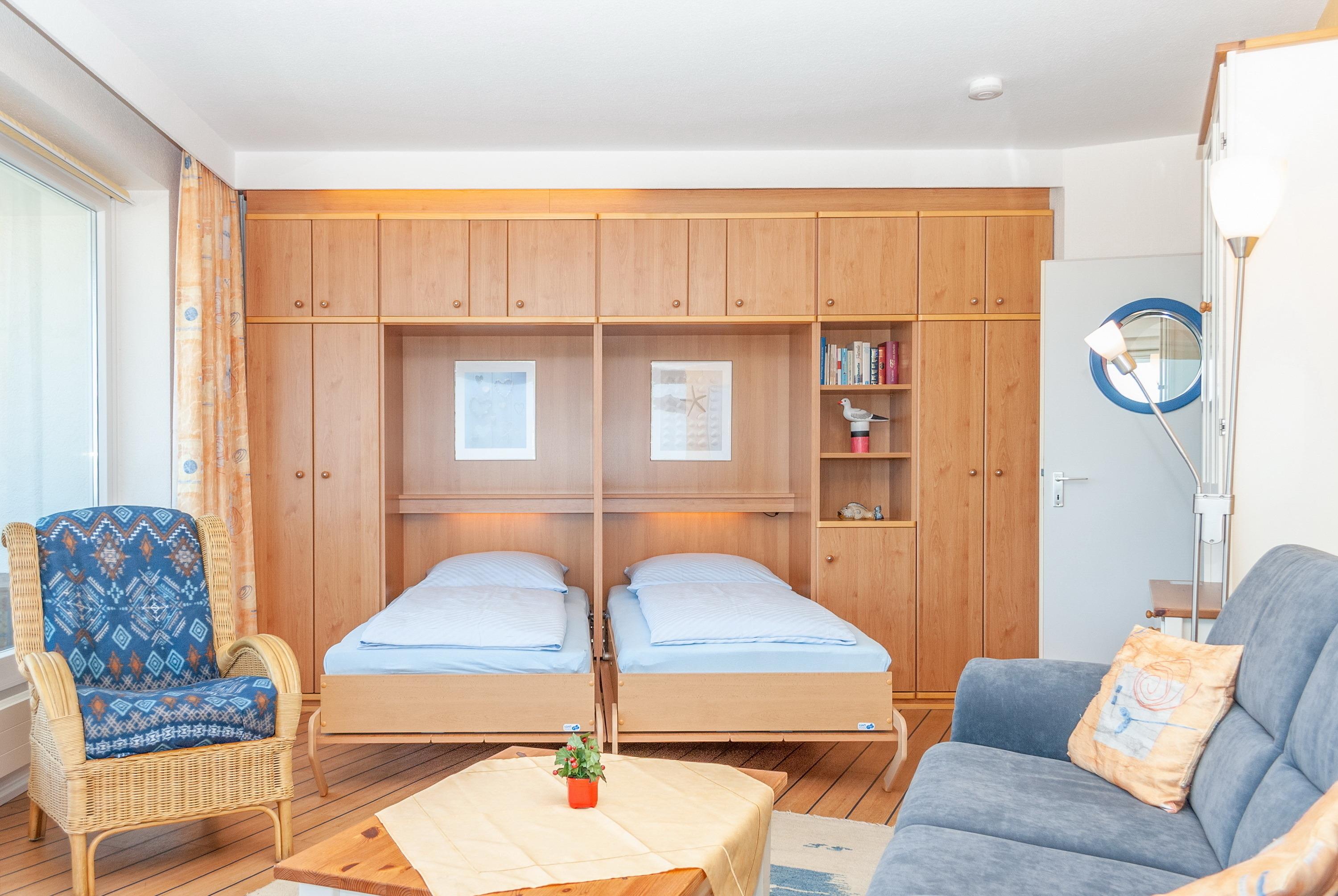 Das Apartment besteht aus einem Schlafzimmer mit 1 Schrankbett für 2 Personen , einem Wohnbereich mit zusätzlichem Schrankbett für 2 Personen und einem Badezimmer mit Dusche sowie WC. Die Ferienwohnung beinhaltet eine voll ausgestattete offene Küche.