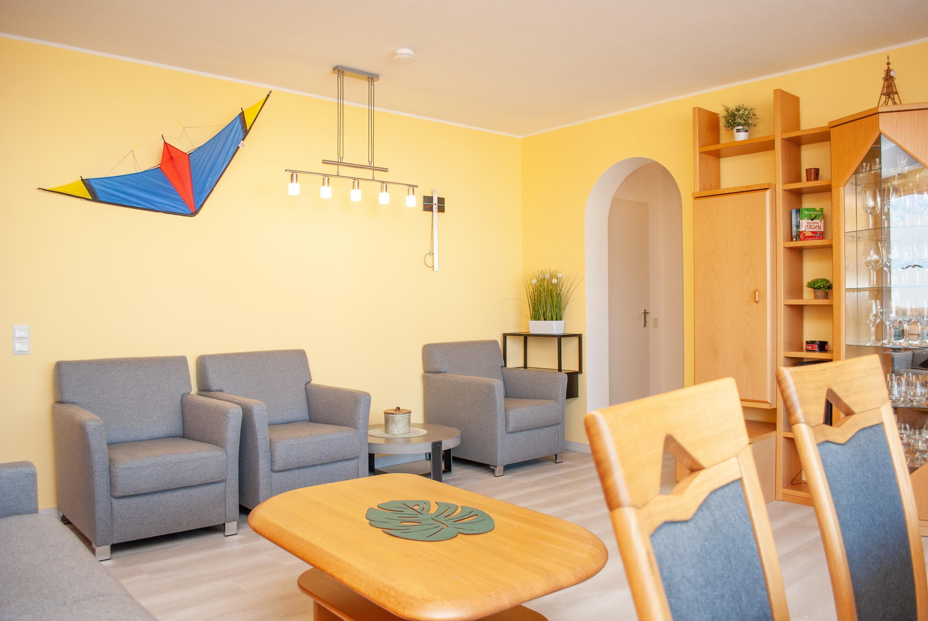 Das Apartment besteht aus einem Schlafzimmer mit 1 Doppelbett , Kinderzimmer mit einem Doppelbett, einem Wohnbereich mit zusätzlichem Schlafsofa für 2 Personen und einem Badezimmer mit Dusche sowie WC. Die Ferienwohnung beinhaltet eine voll ausgestattete separate Küche.