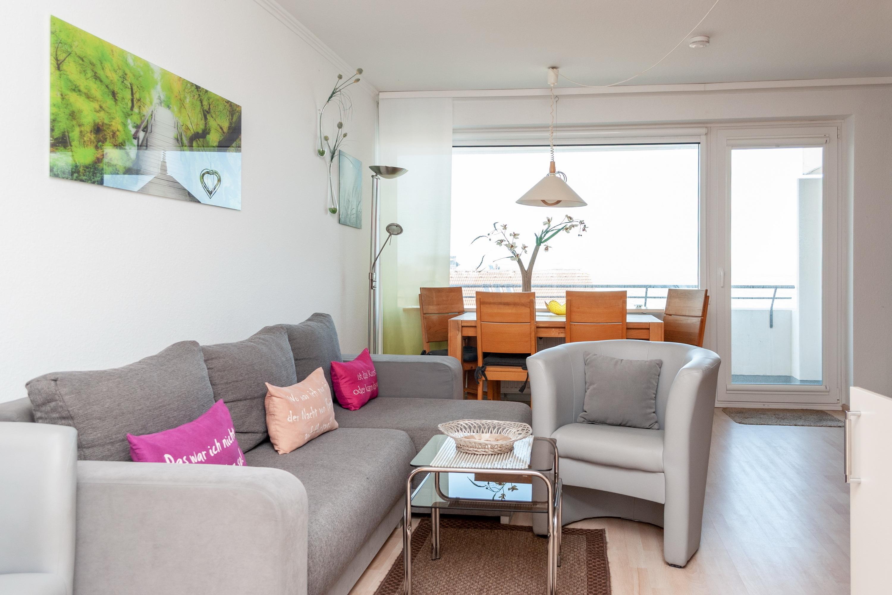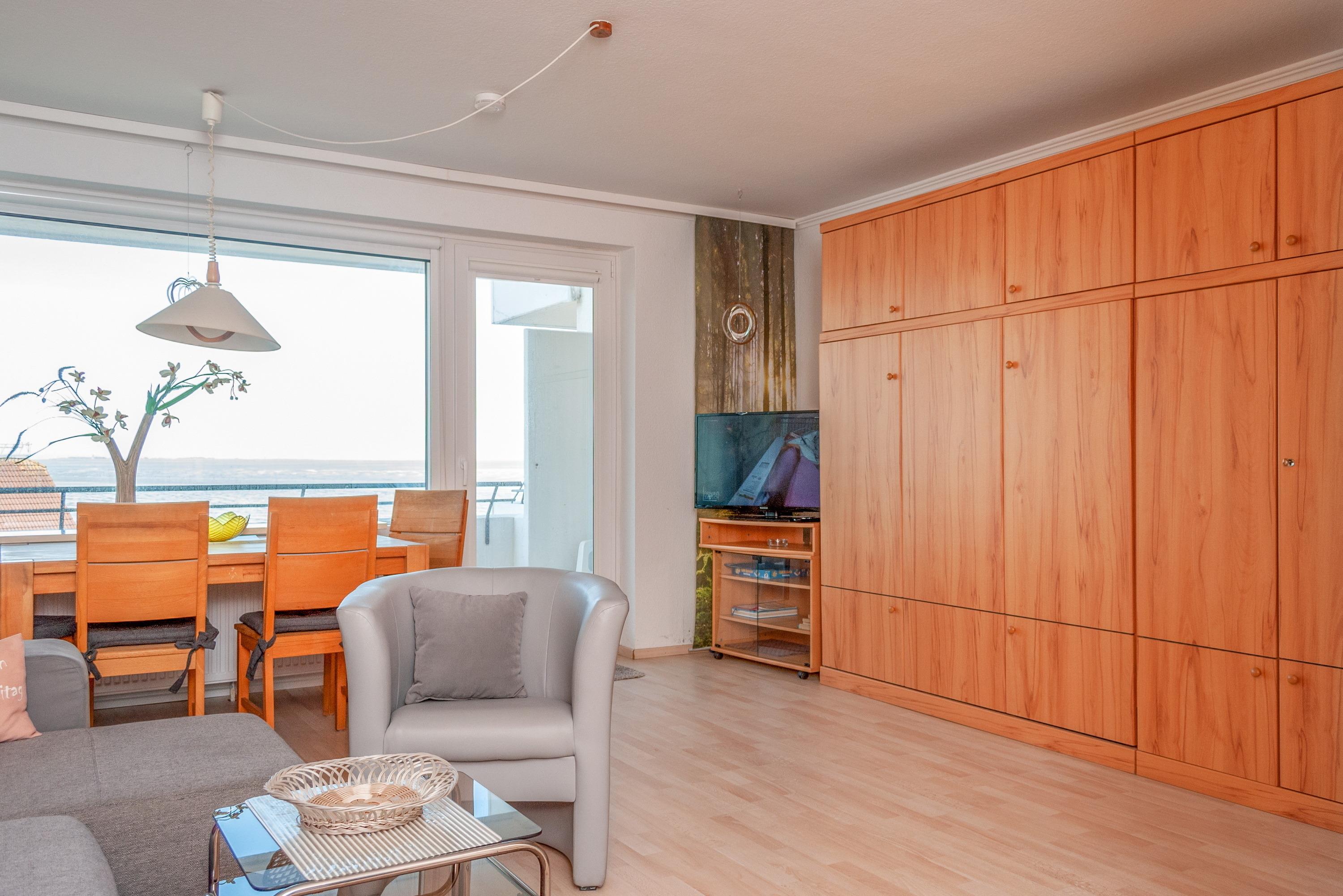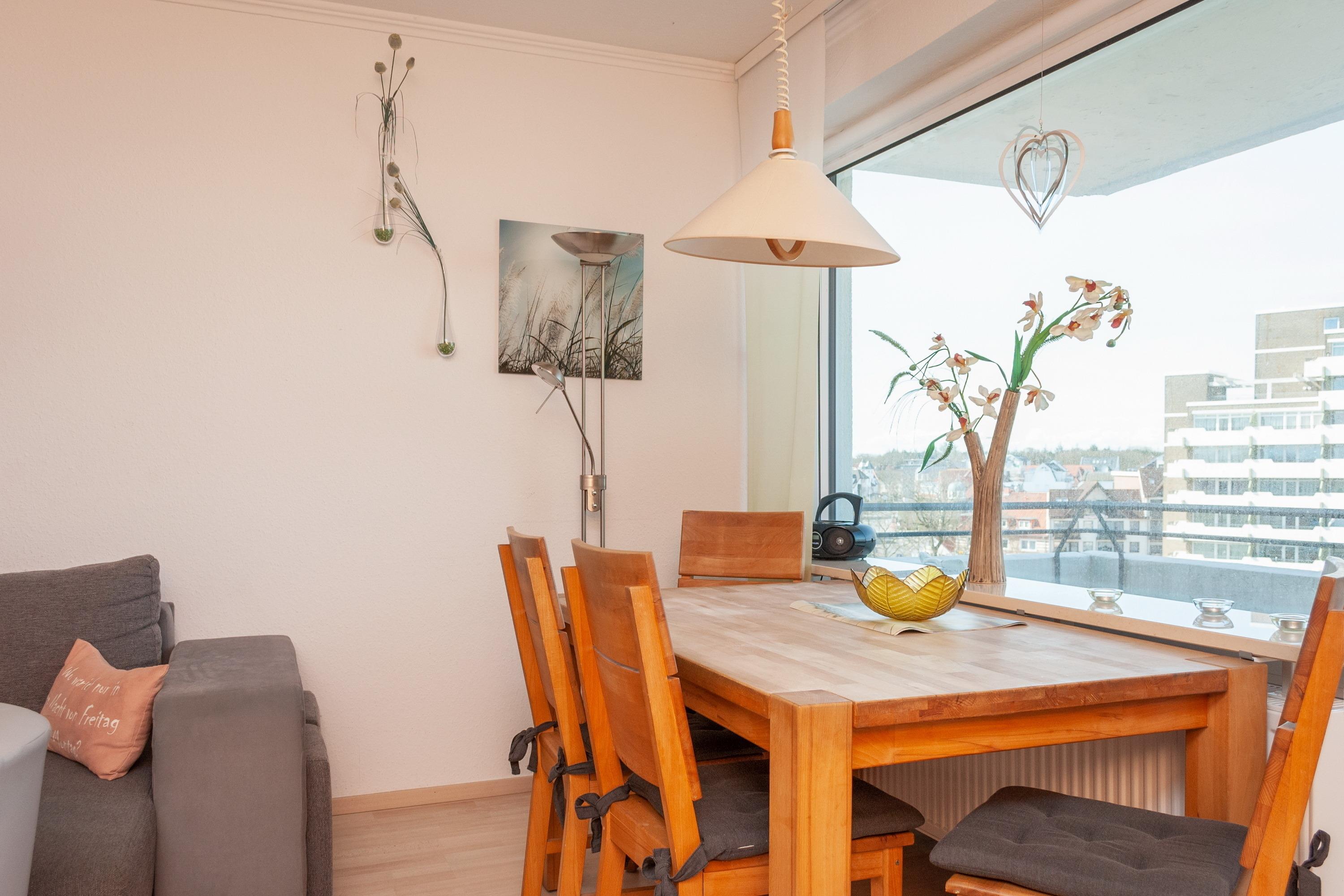 Das Apartment 603 ist ein 1-Raum-Apartment im 6. Obergeschoss für bis zu 4 Personen mit 40 qm. Der Westbalkon mit Meerblick bietet Ihnen vormittags Schatten und nachmittags Sonne .