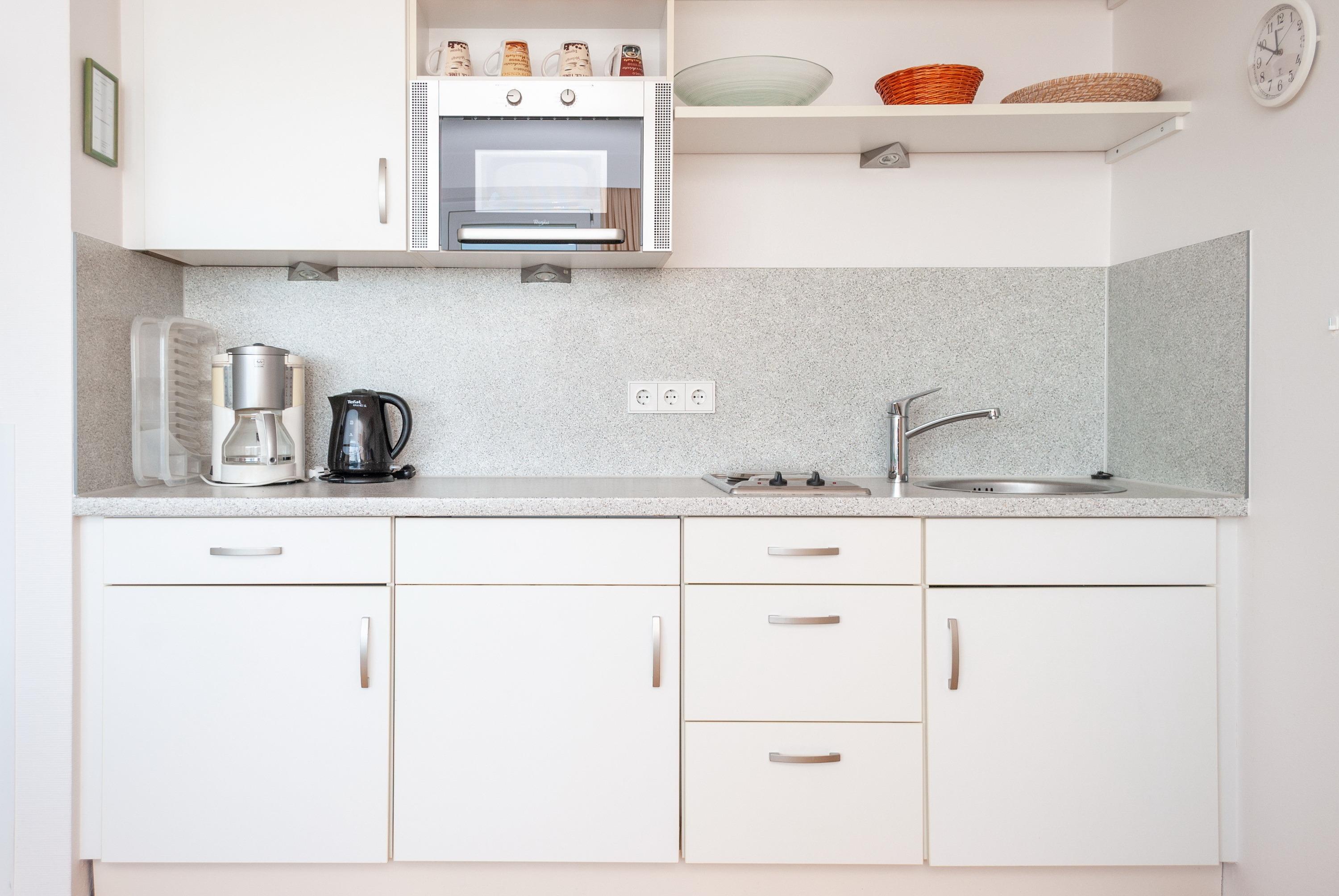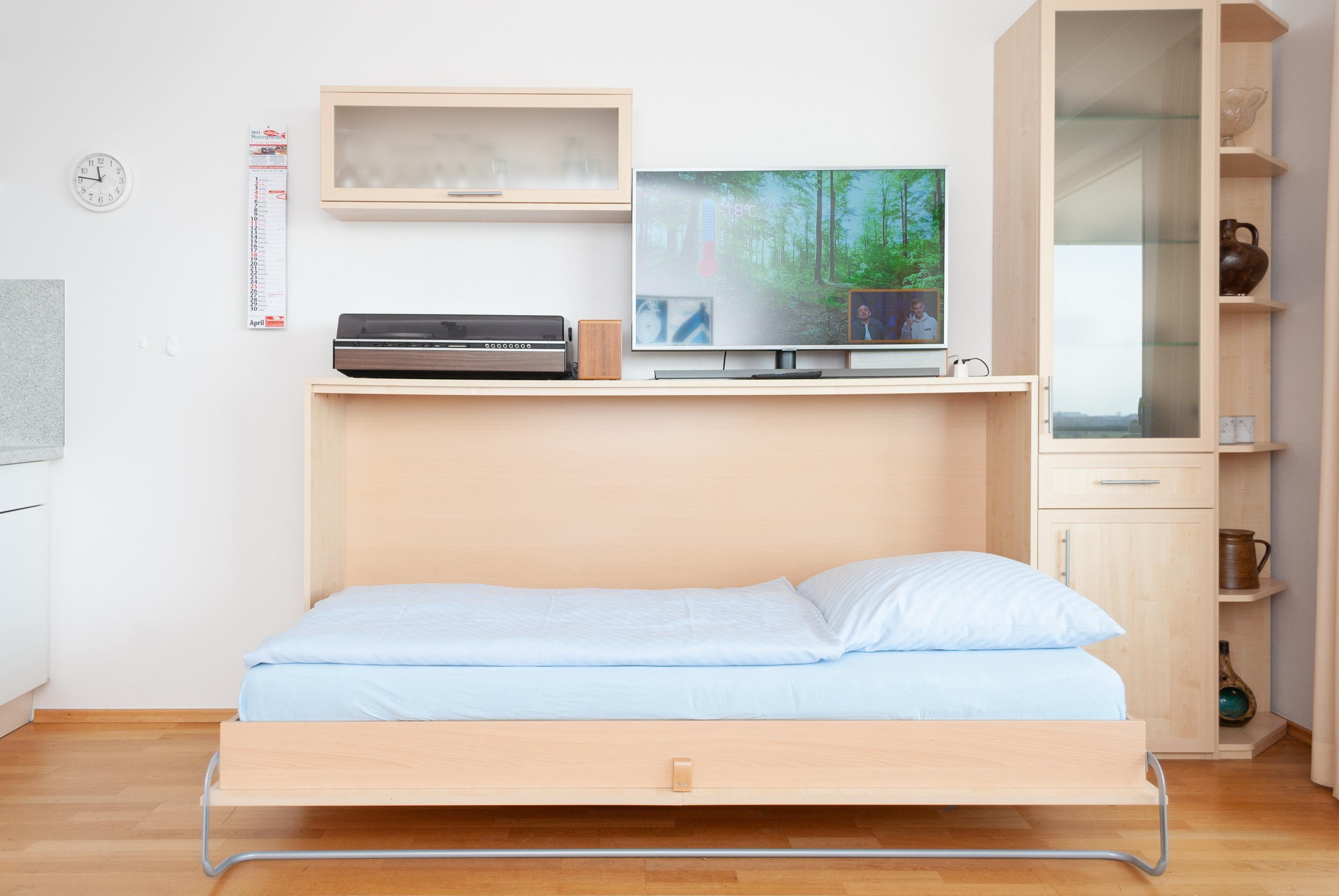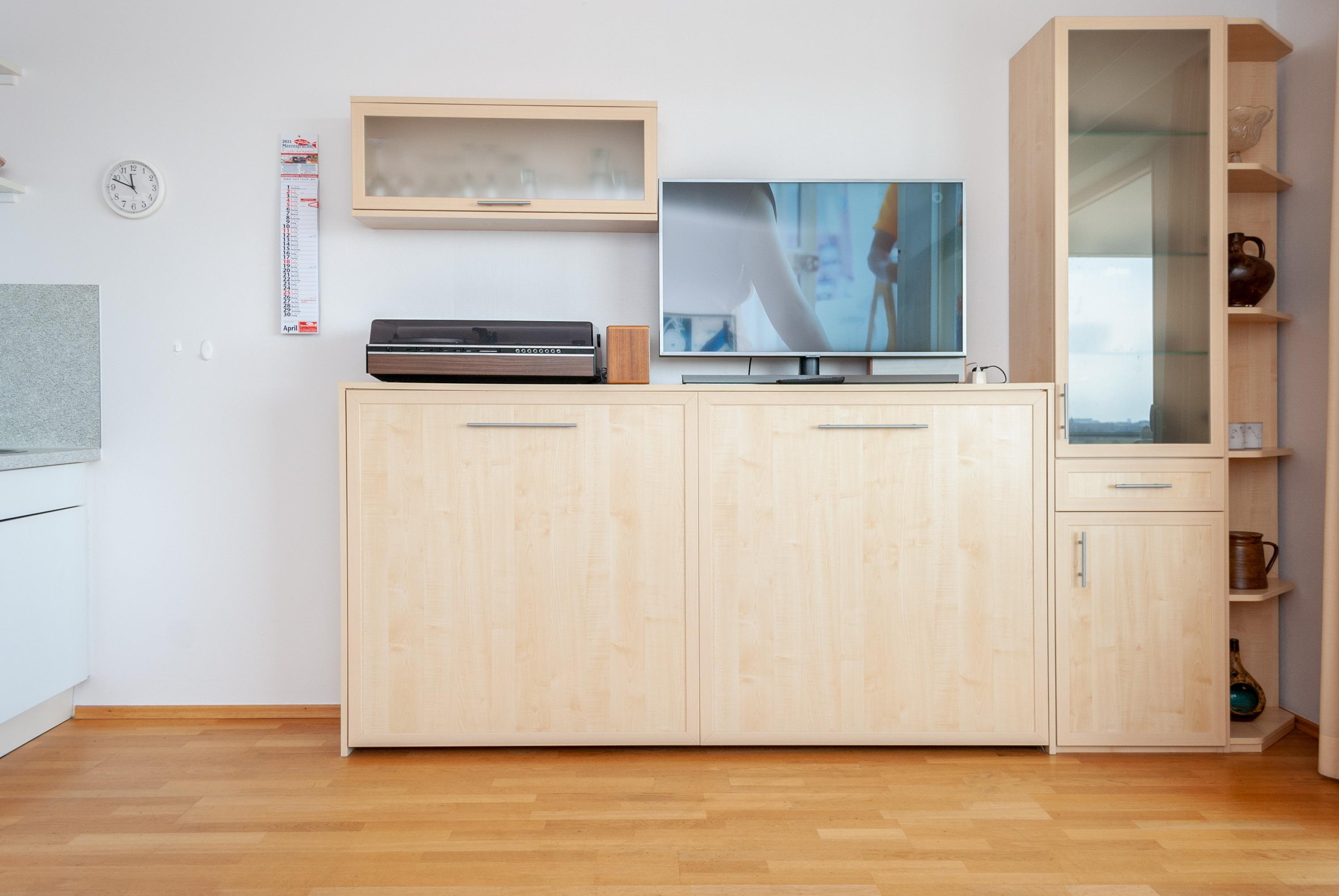 Das Apartment besteht aus einem Schlafzimmer mit 1 Doppelbett, einem Wohnbereich mit zusätzlichem Schrankbett für 1 Person und einem Badezimmer mit Dusche sowie WC. Die Ferienwohnung beinhaltet eine gut ausgestattete offene Küche.