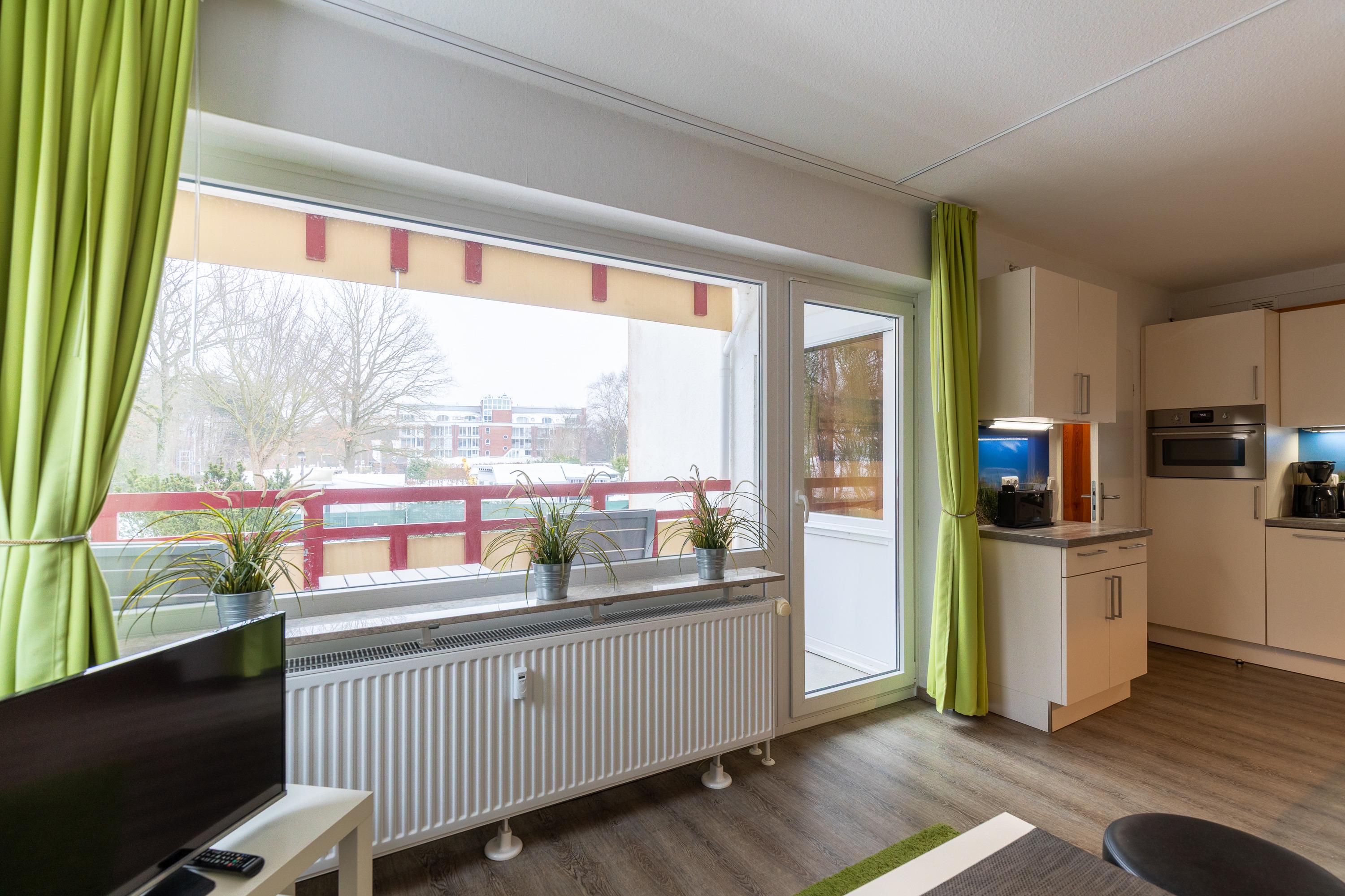 Die Wohnung verfügt über ein Schlafzimmer (kann mit dem elektrischen Rollladen verdunkelt werden) mit Doppelbett (180x200) sowie ein Badezimmer mit Dusche und WC. In der voll ausgestatteten Küchenzeile, im Wohnzimmer, finden Sie alles was Sie für die Zubereitung Ihrer Mahlzeiten benötigen (Kühlschrank mit Gefrierfach, Cerankochfeld mit 2 Kochstellen, Wasserkocher, Kaffeemaschine, Toaster, Kombi aus Mini Backofen/Mikrowelle). Das Wohnzimmer verfügt neben der Küchenzeile über ein Sofa (das als Schlafsofa genutzt werden kann), TV und einen Essplatz, von hieraus gelangt man auf den Balkon.