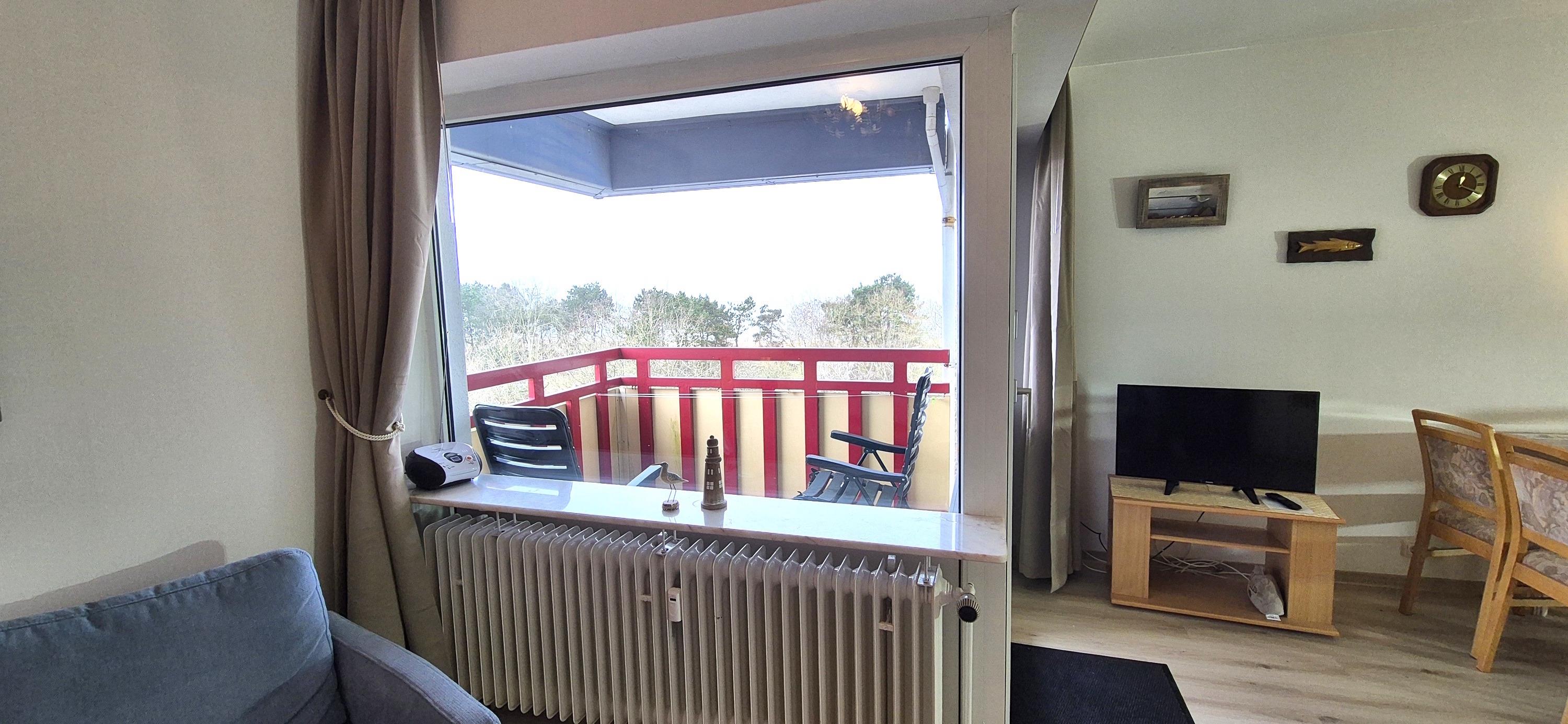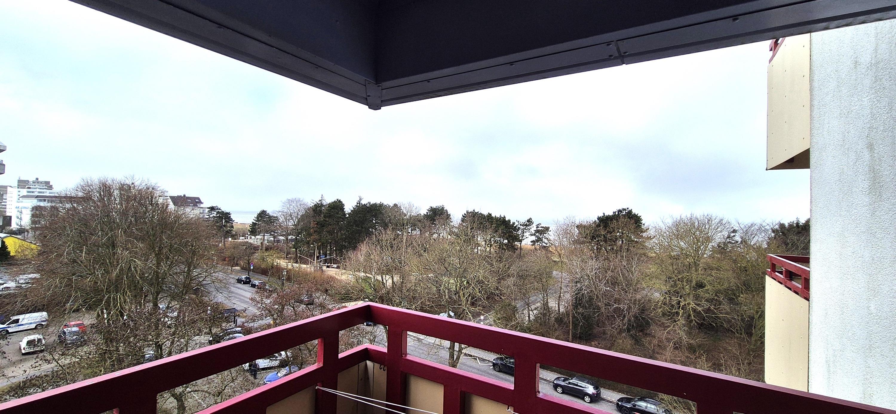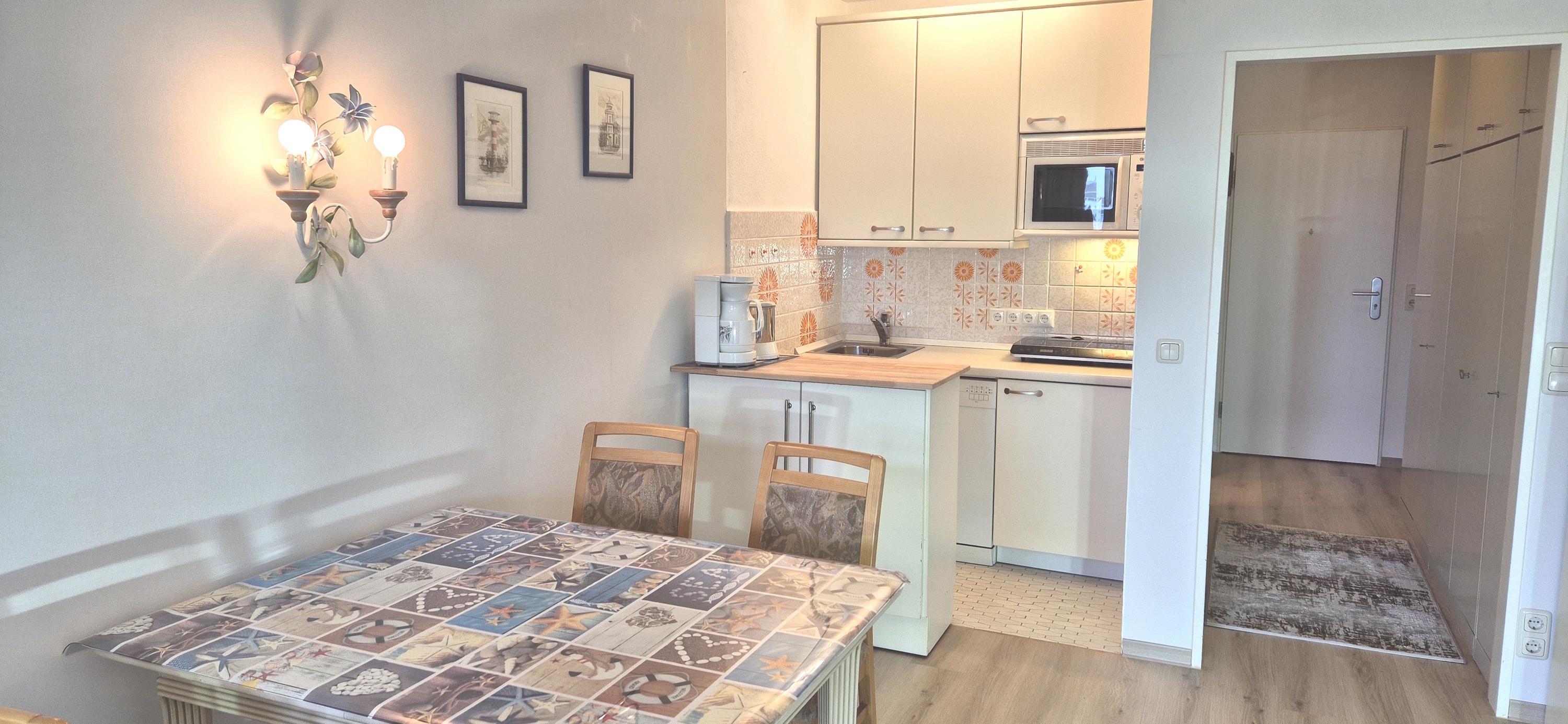 Das Appartement 74 ist ein 1-Raum-Appartement im 6. Obergeschoss für bis zu 2 Personen mit 33 qm. Der möblierte Westbalkon bietet morgens Schatten und nachmittags Sonne.