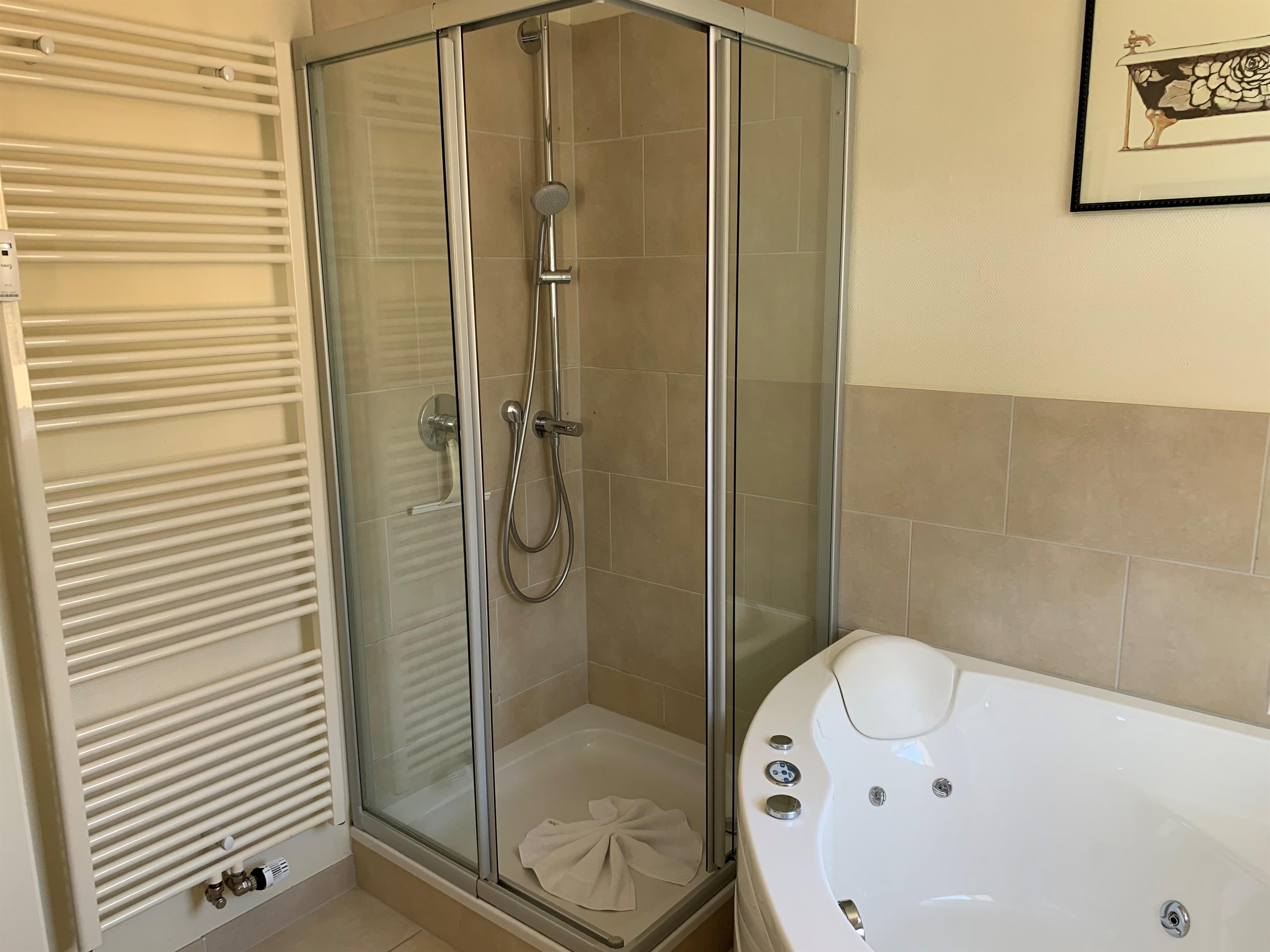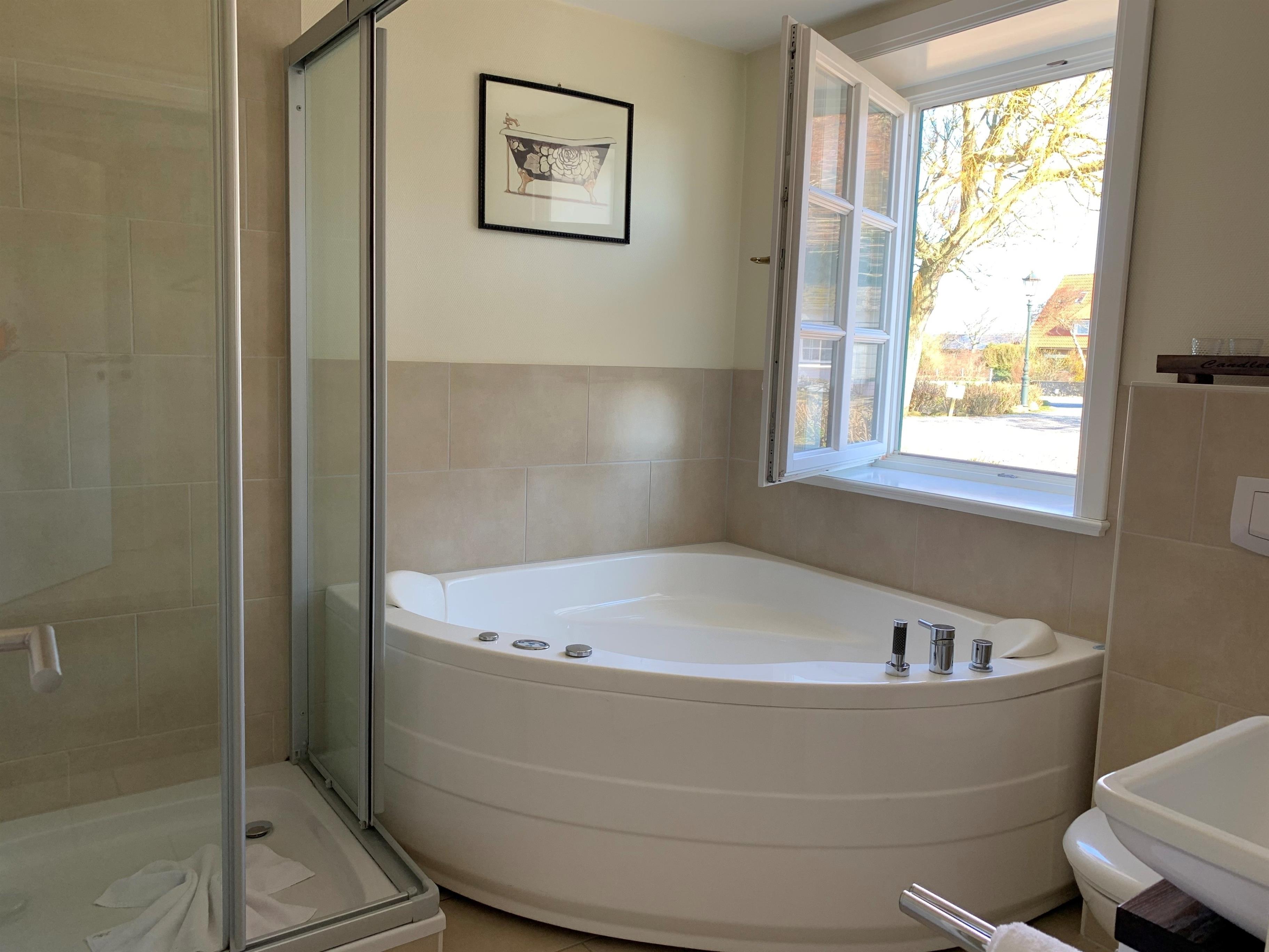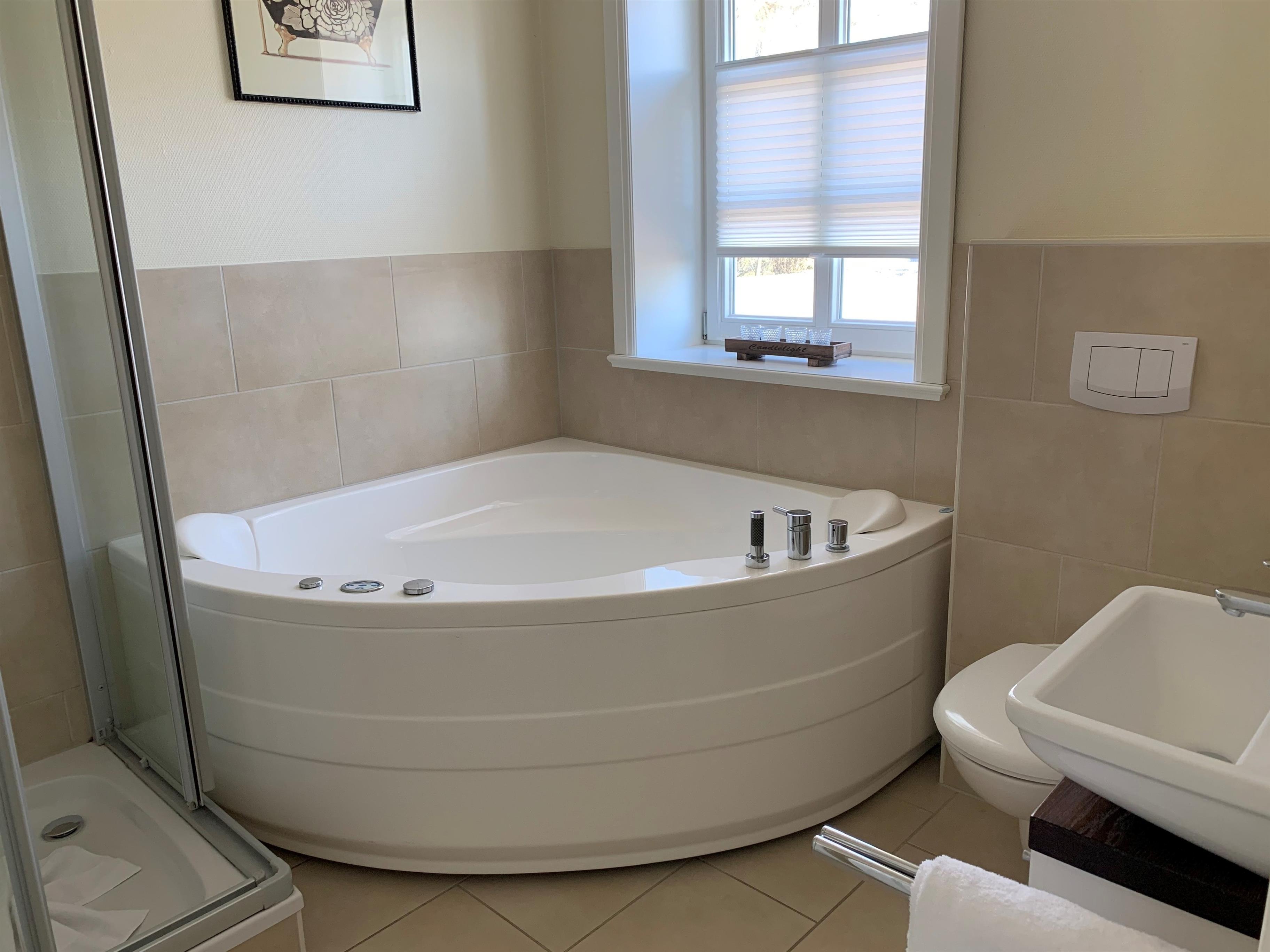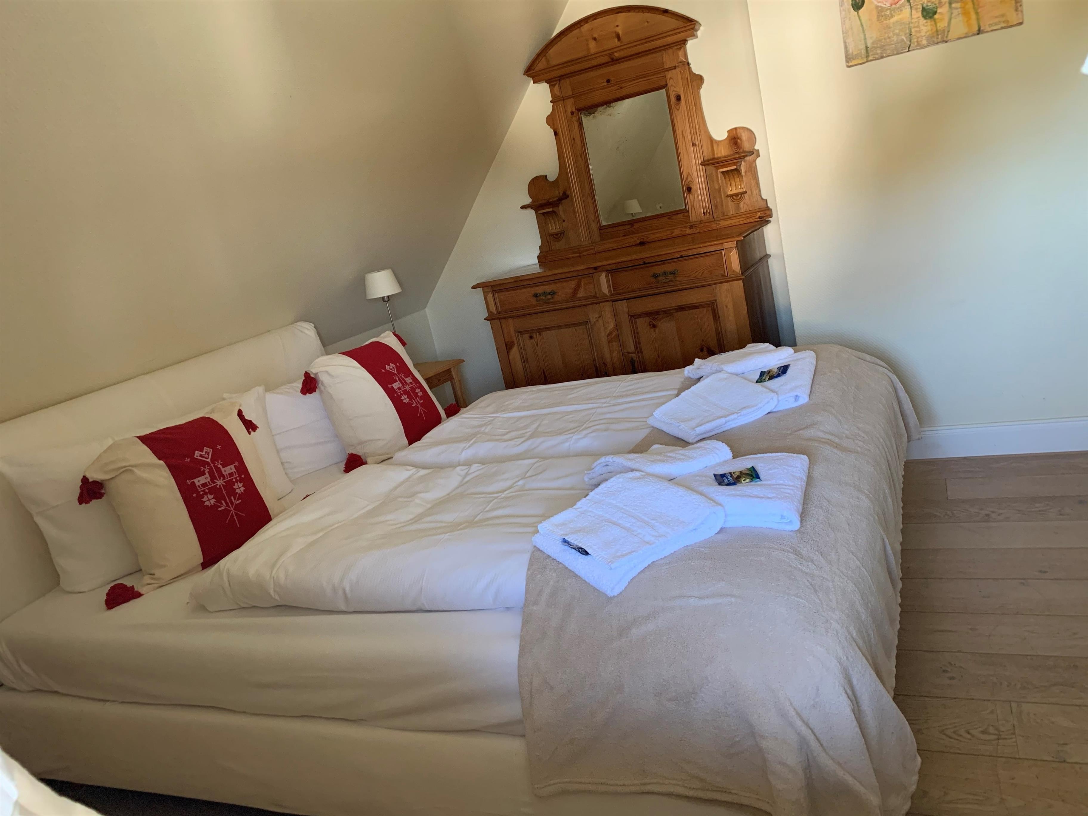 Dieses hochwertig ausgestattete Hausteil umfasst im Erdgeschoss den Wohn- und Essbereich mit Ausgang zur Südterrasse, eine offene Einbauküche, Vollbad/WC, Garderobe und HW-Raum. Im Dachgeschoss liegen Schlafzimmer, Gästezimmer mit großer Abseite, Duschbad/WC und Flur mit Einbauschrank. Ein ansprechendes Ferienobjekt mit stilvollen Ausstattungsdetails erwartet Sie - weitab von der Hektik des Alltags.
