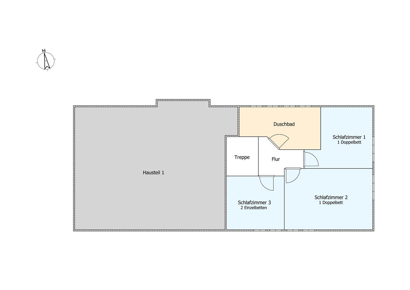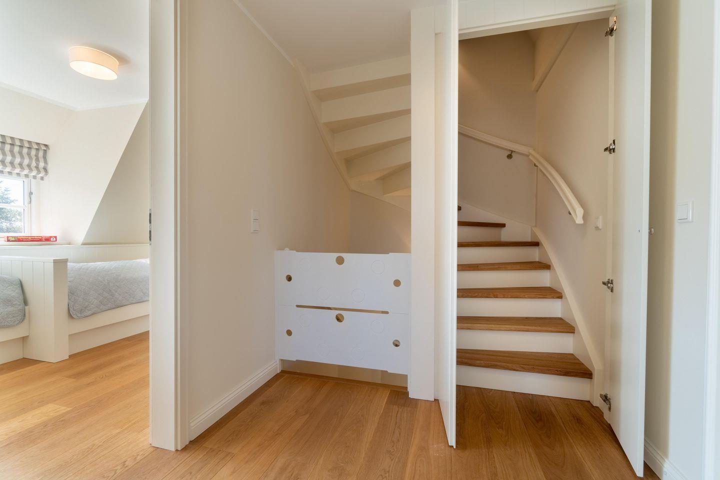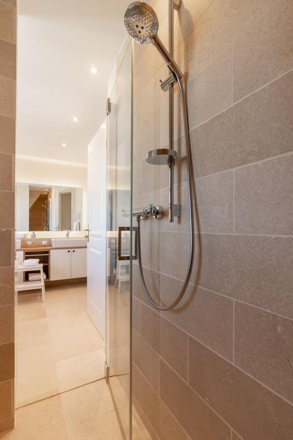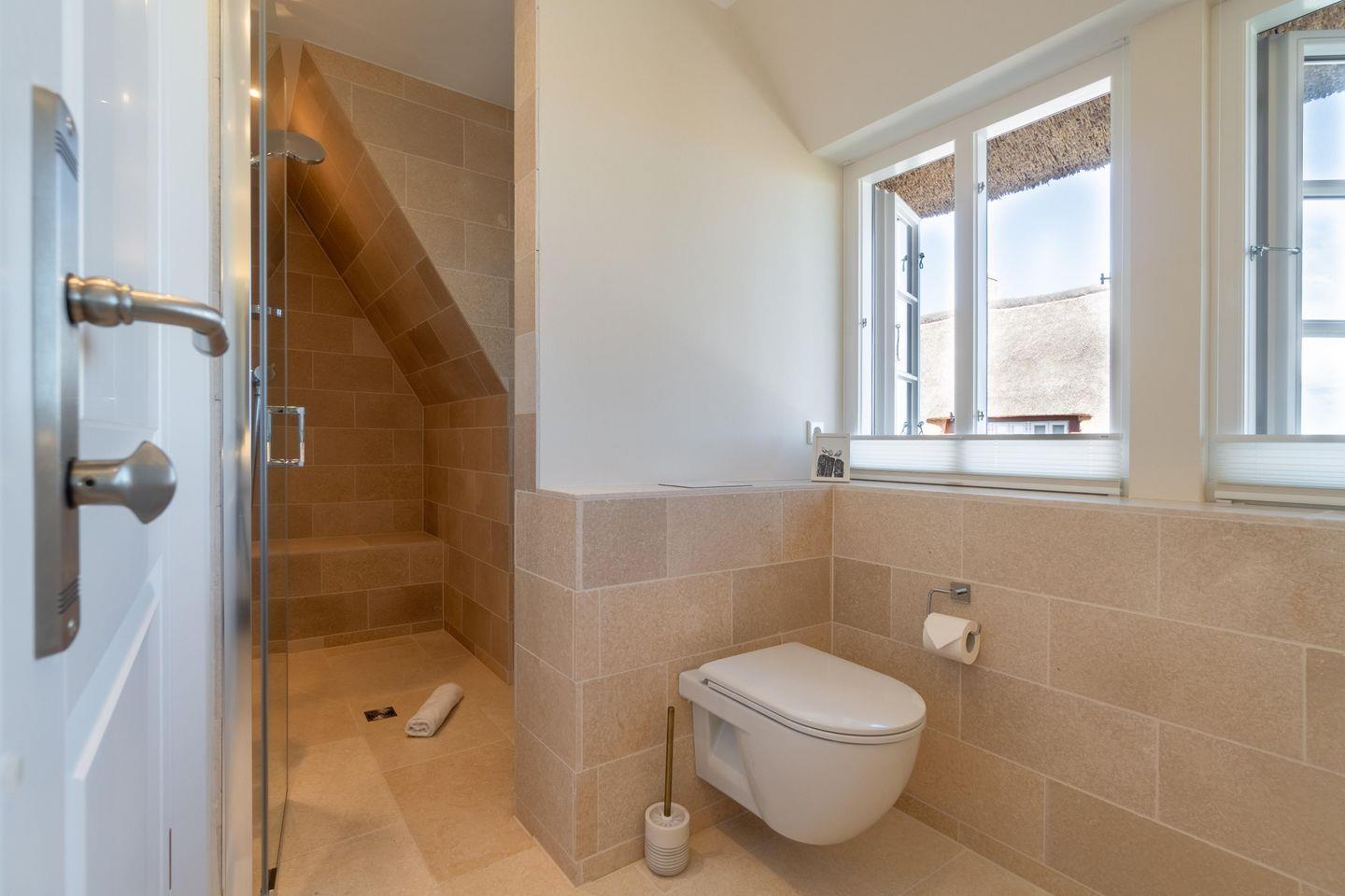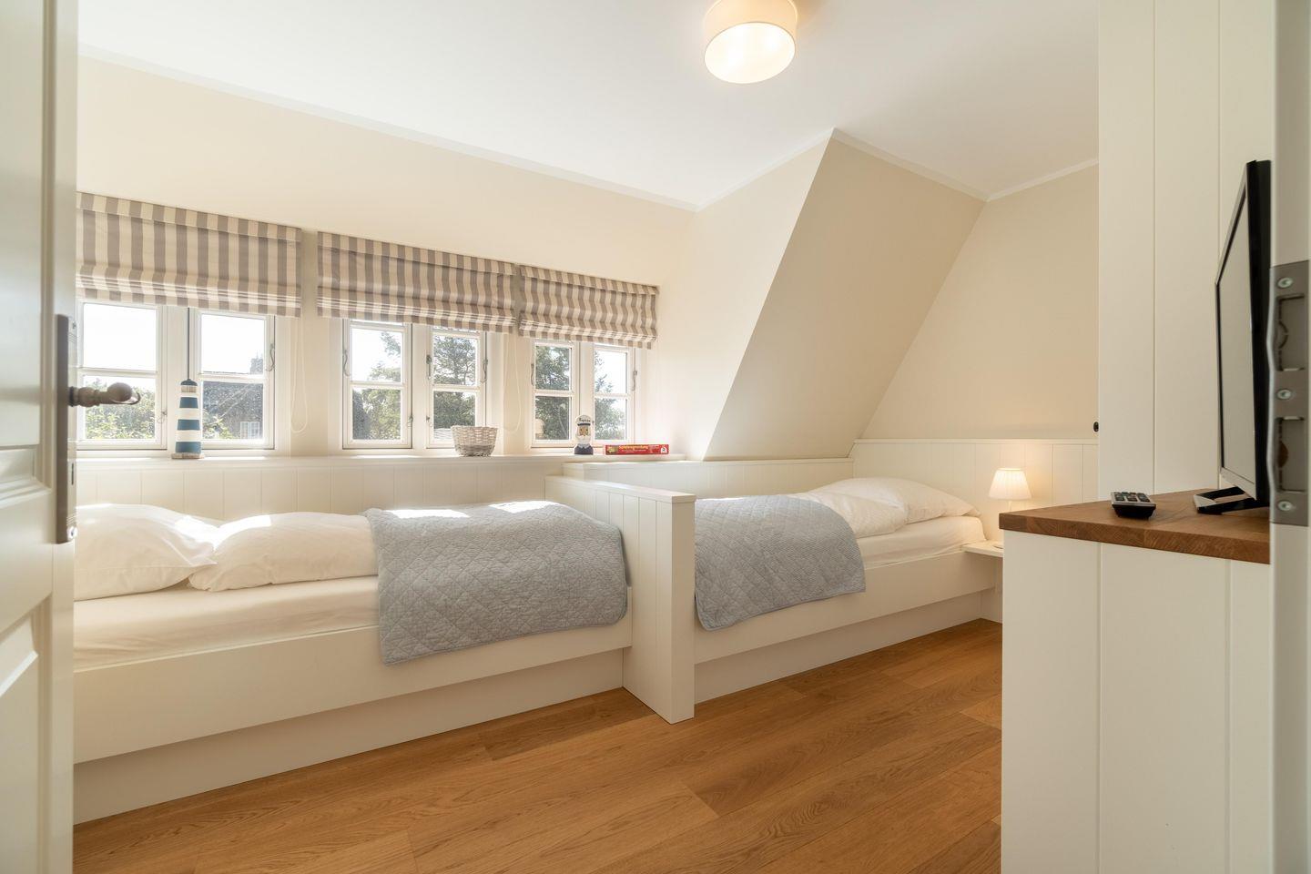 Im Obergeschoss befinden sich die drei Schlafzimmer sowie ein weiteres Duschbad. Zwei der Schlafzimmer verfügen über je ein Doppelbett, das dritte verfügt über zwei Einzelbetten. In einem Schlafzimmer befindet sich ein Arbeitsplatz. Das Duschbad ist sehr großzügig gehalten und bietet Ihnen einen schönen Ausblick auf die umliegende Landschaft.