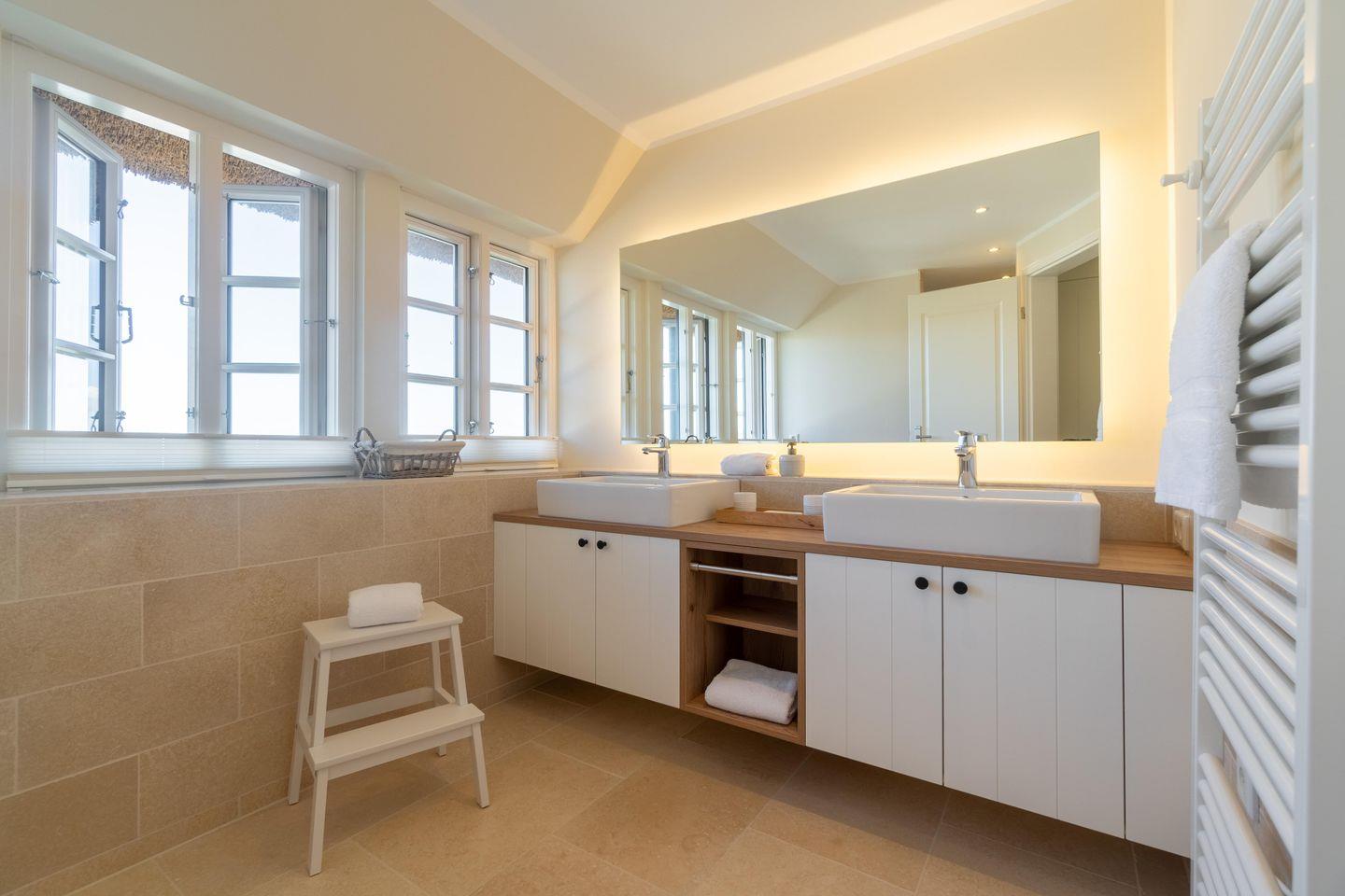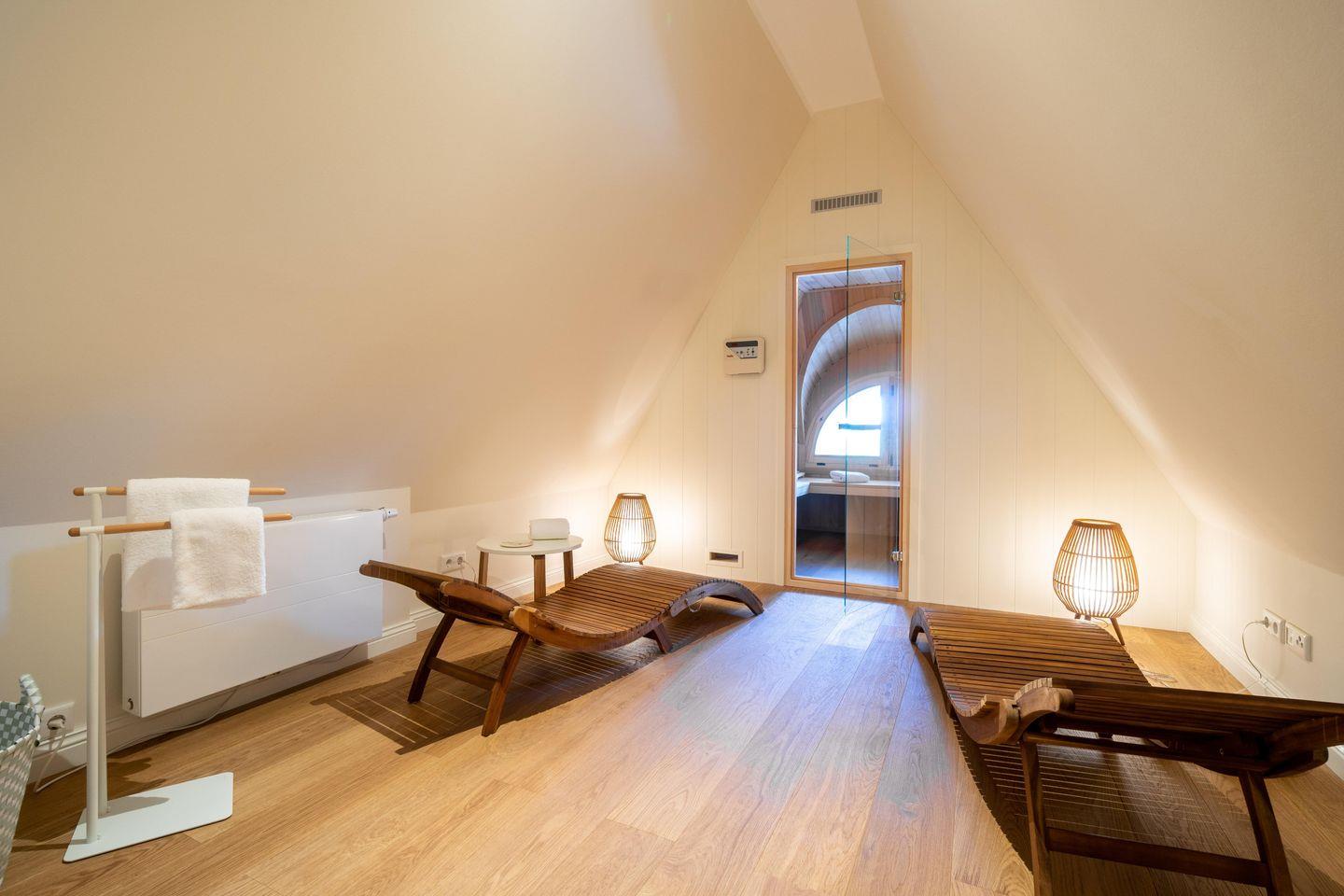 Im Dachgeschoss ist die hauseigene Sauna samt Ruheraum gelegen. Aus den Fenstern haben Sie Aussicht auf die Nordsee und die Nachbarinsel Sylt am Horizont sowie über die zahlreichen Felder der Föhrer Marschlandschaft.