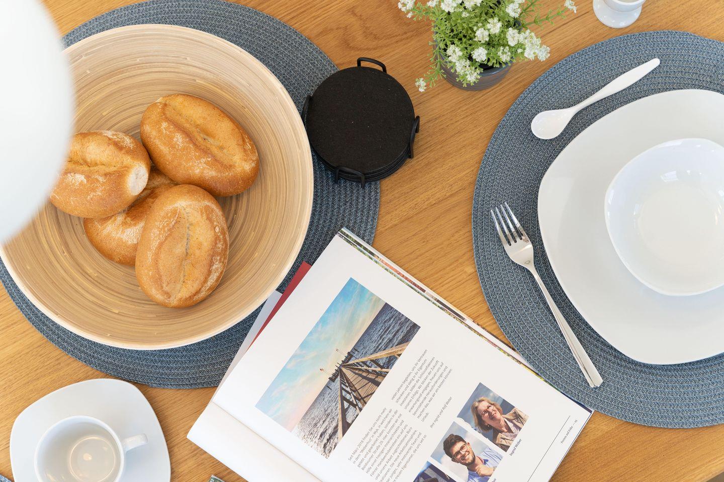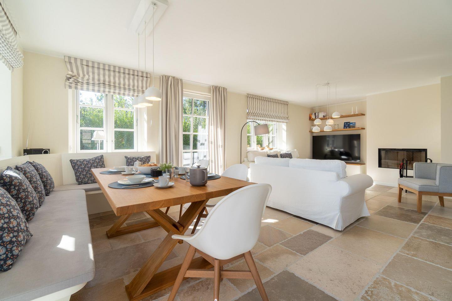 Im Erdgeschoss befinden sich der großzügige Wohn- und Essbereich mit offener Küche, eines der beiden Duschbäder sowie ein Hauswirtschaftsraum mit Waschmaschine und Trockner. Über den Wohnbereich gelangen Sie auf die eigene Terrasse und in den Garten. Die Highlights des Wohnbereichs bilden der sehr große Smart-TV sowie der moderne, in der Wand verbaute, Kamin. Die Küche ist sehr gut ausgestattet. Hobbybäcker und Hobbyköche kommen in Haus Deichblick 2 auf Ihre Kosten!