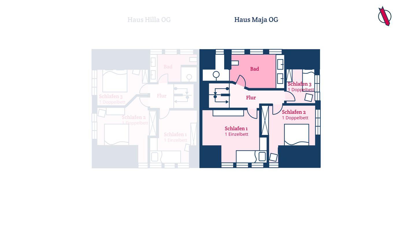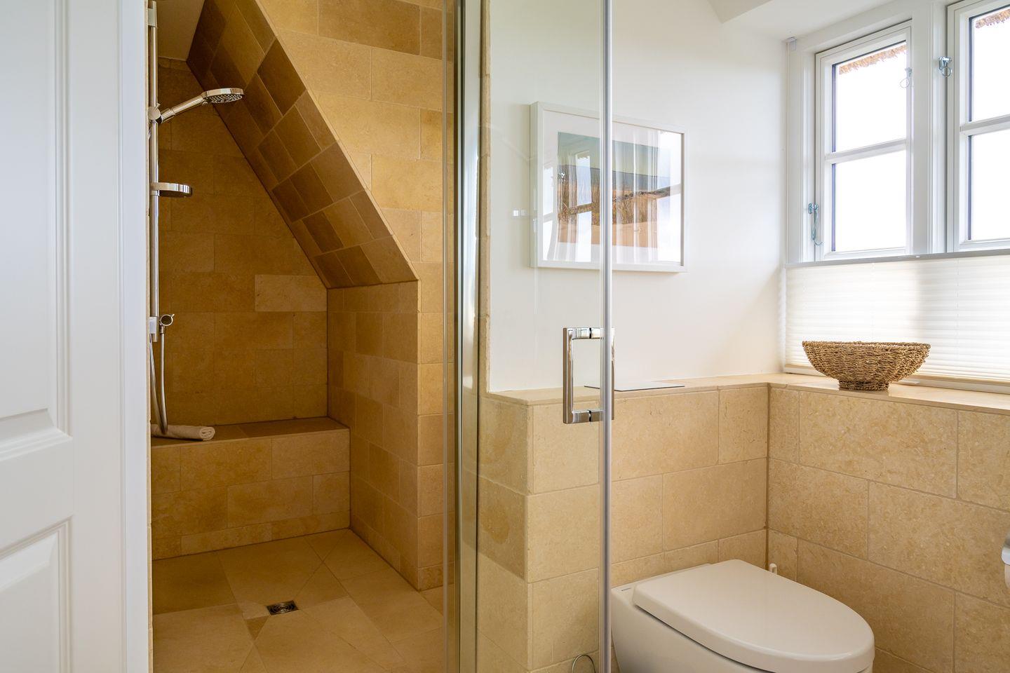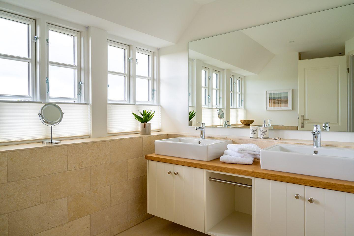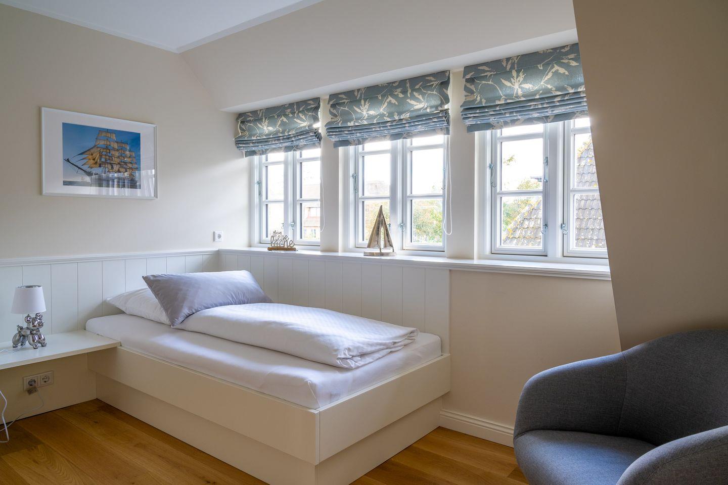 Im Obergeschoss sind drei Schlafzimmer und das zweite Duschbad gelegen. Zwei der Schlafzimmer sind jeweils mit einem Einzelbett ausgestattet, das dritte Schlafzimmer mit einem Doppelbett. Alle drei Schlafzimmer verfügen über Smart-TVs.